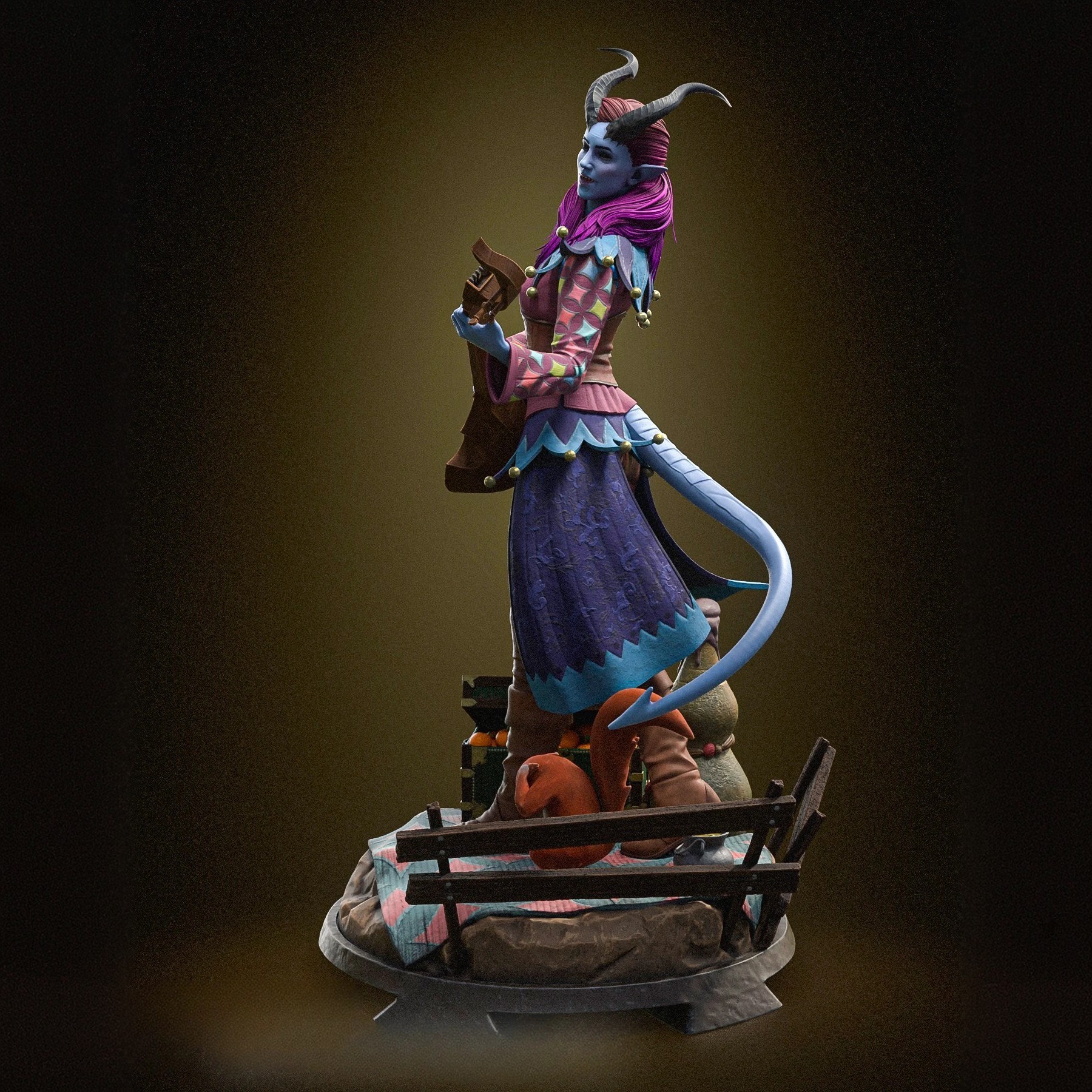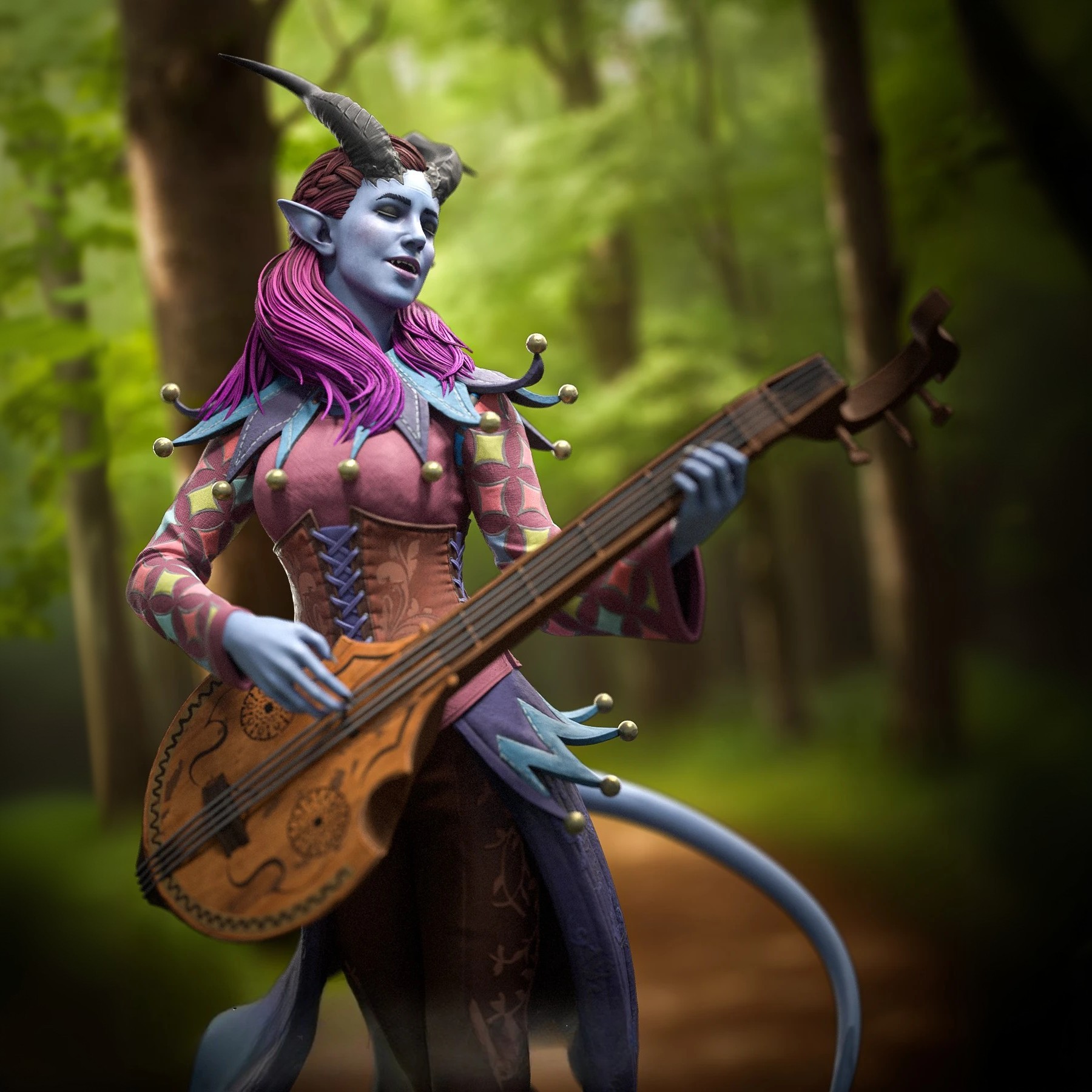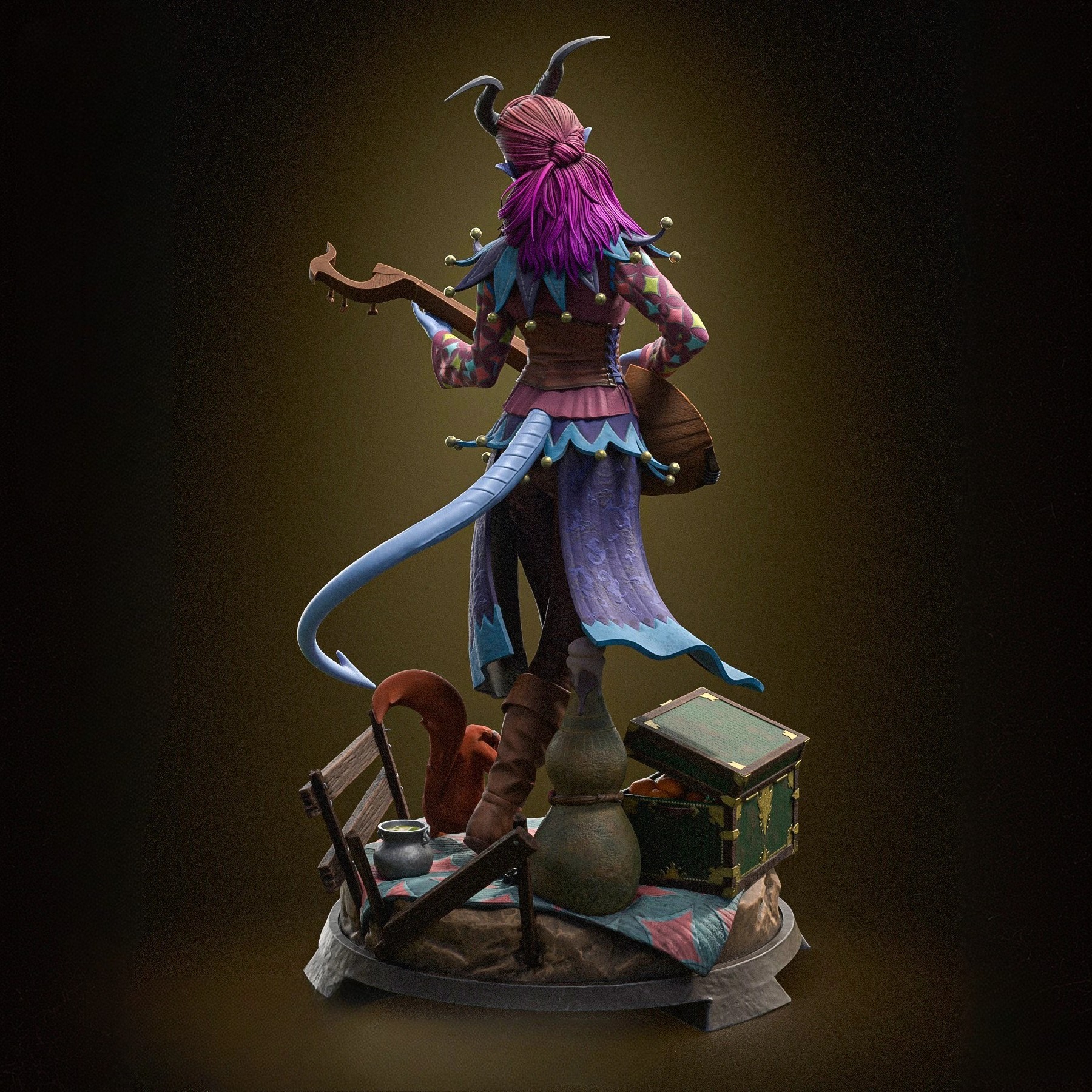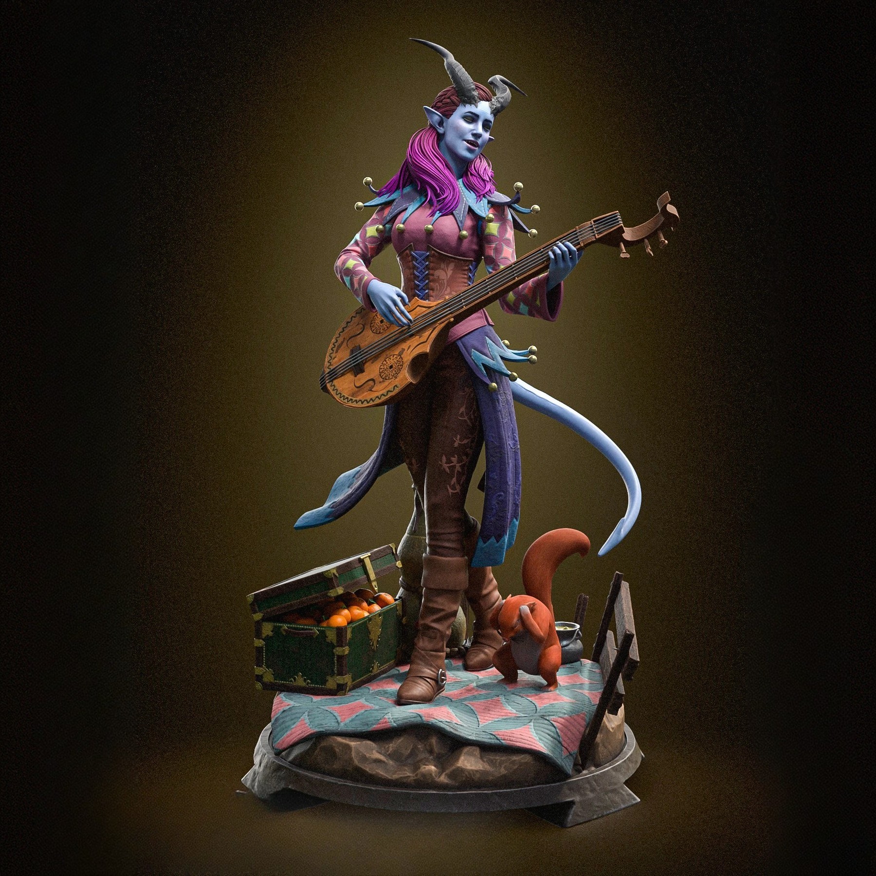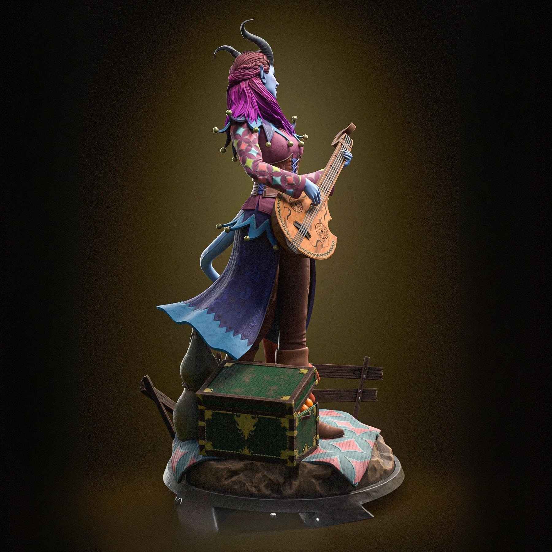 Фигура Alfira из Baldur's Gate 3 передаёт её как тифлинга‑барда, сочетающего лёгкую творческую мечтательность и скрытую тяжесть беженца с тяжёлым прошлым. Внешне она выглядит как тонкая женщина‑тифлинг с ярко‑фиолетовыми или тёмно‑сиреневыми волосами, простой, но выразительной татуировкой или узорами на коже, мягкими, но внимательными чертами лица, в котором читается и усталость, и надежда, как у человека, который ищет смысл в музыке, потому что реальность вокруг слишком жестока. В фигурке подчёркнут её образ барда‑музыканта: в руках ощущается лютня или другой струнный инструмент, поза слегка расслаблена, но не расхлябанная, как у артиста, который привык играть для детей и уставших от бегства товарищей, а не для залов и богатых дворов. Одежда выглядит простой, но с элементами, напоминающими об асеро‑дьявольском наследии тифлингов — тёмные тонкие элементы, возможно, лёгкие кожаные вставки, которые подчёркивают её не принадлежность к богатому городу, а к табору изгнанных, ищущих укрытие в Emerald Grove. Эта фигура фиксирует Alfira в момент, когда она не только «очаровательная бардесса у лагерного костра», а тифлинг, который несёт в себе травму потери учительницы‑барда и обязанности перед другими детьми. В таком образе она остаётся тихой, но значимой героиней, опирающейся на творчество, рассказы и умение поддержать других, а не на громкую боевую мощь или эффектную магию.