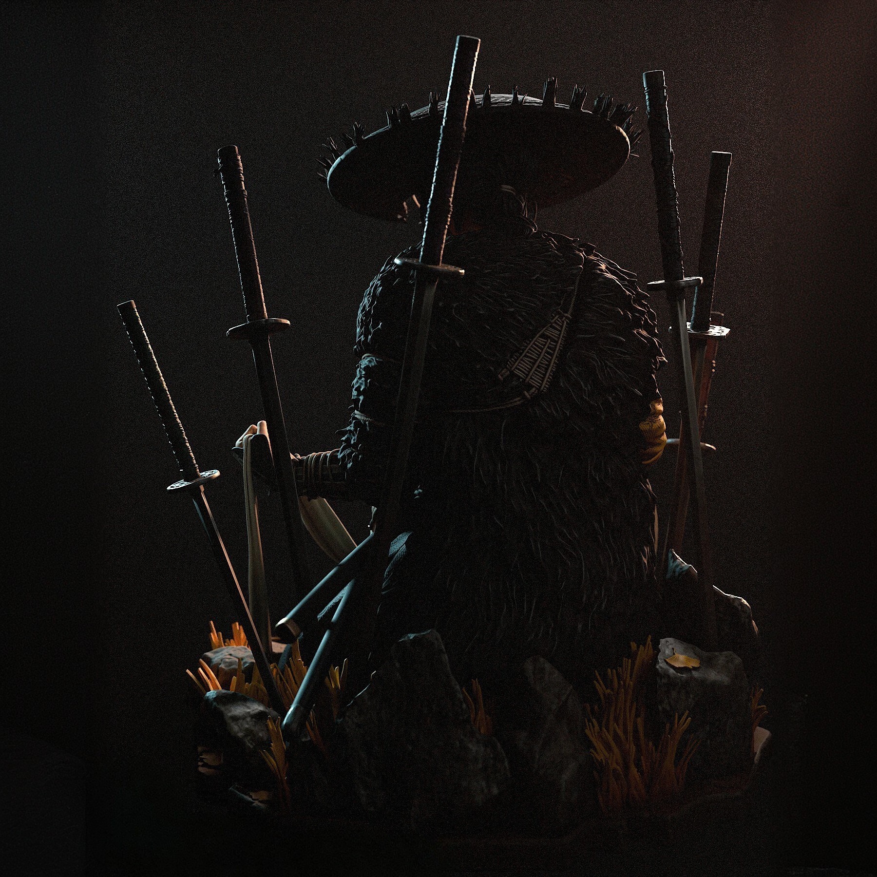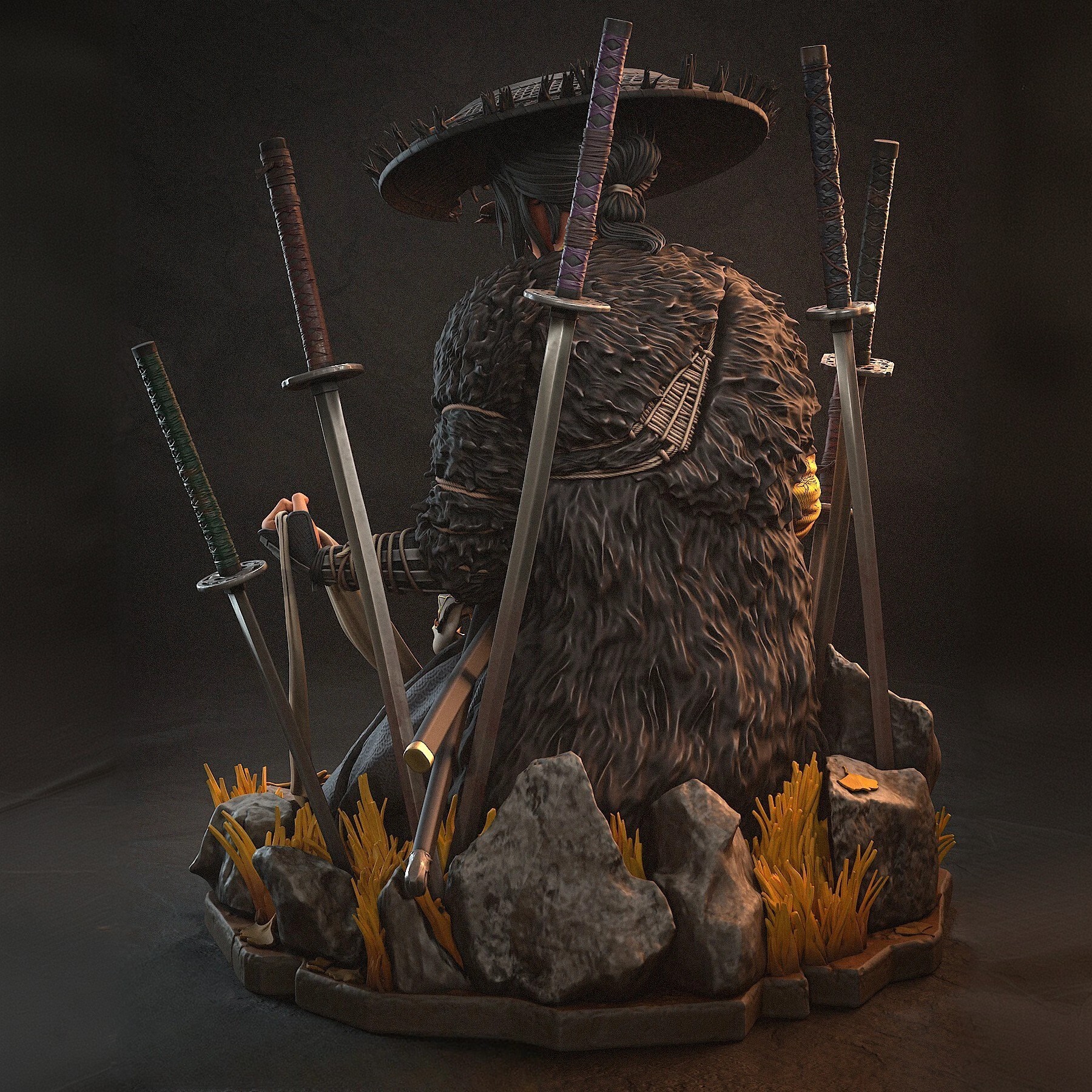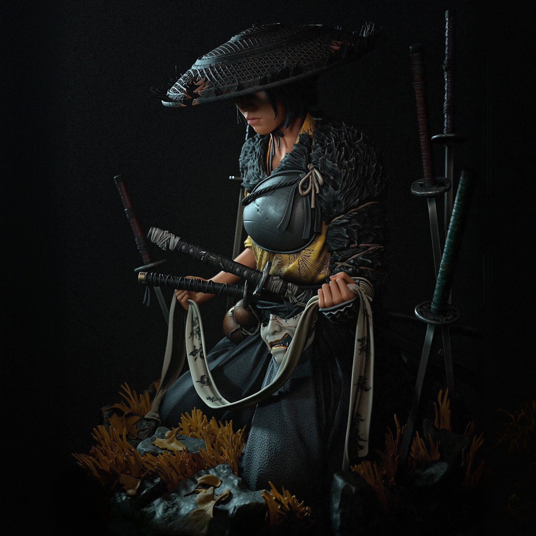 Её образ отражает контраст между внутренней болью и решимостью: шкура, металл, простая одежда бывшей крестьянки — всё подчёркивает, что Atsu не из знати, не самурай, она — охотница на тех, кто разрушил её прошлое. Лицо скрыто отчасти тенью шлема, но поза, напряжение в мышцах и крепко сжатое оружие говорят о её силе — не «благородства» в классическом виде, а жестокой необходимости, отчаянии и твёрдой воле. Фигура показывает её как выжившую, как призрачный клинок судьбы, который идёт до конца.