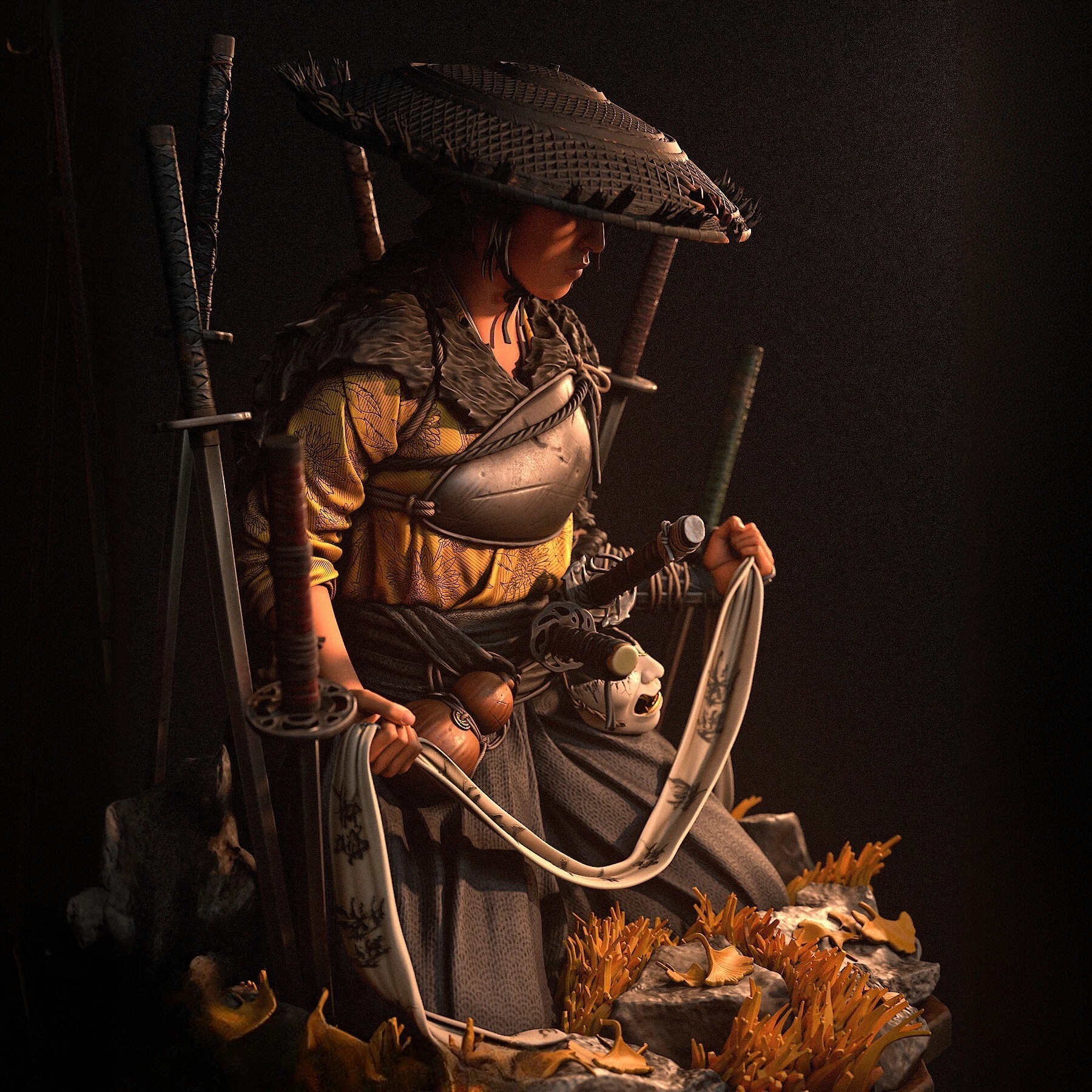 Фигура Atsu из игры Ghost of Yōtei передаёт сложный путь главной героини — от мрачной мести к тяжёлому выбору судьбы. Она изображёна с традиальным японским оружием, в стойке, готовой к бою: корпус чуть наклонён, ноги устойчиво стоят, тело напряжено, словно каждое мгновение может оказаться последним. Лёгкое движение вокруг — ткань одежды, шёлест плаща — додаёт ощущение, что она готова к прыжку или стремительной атаке.