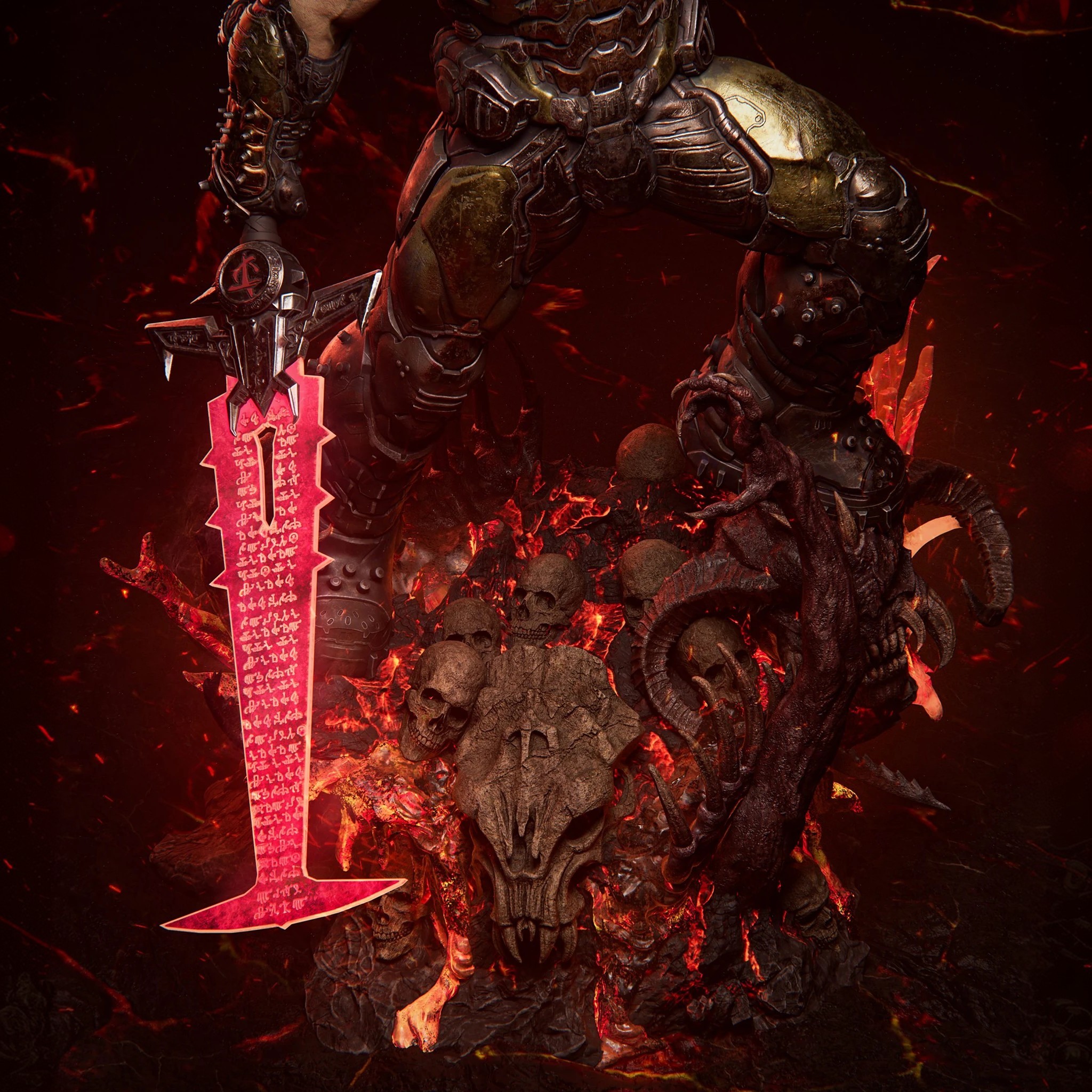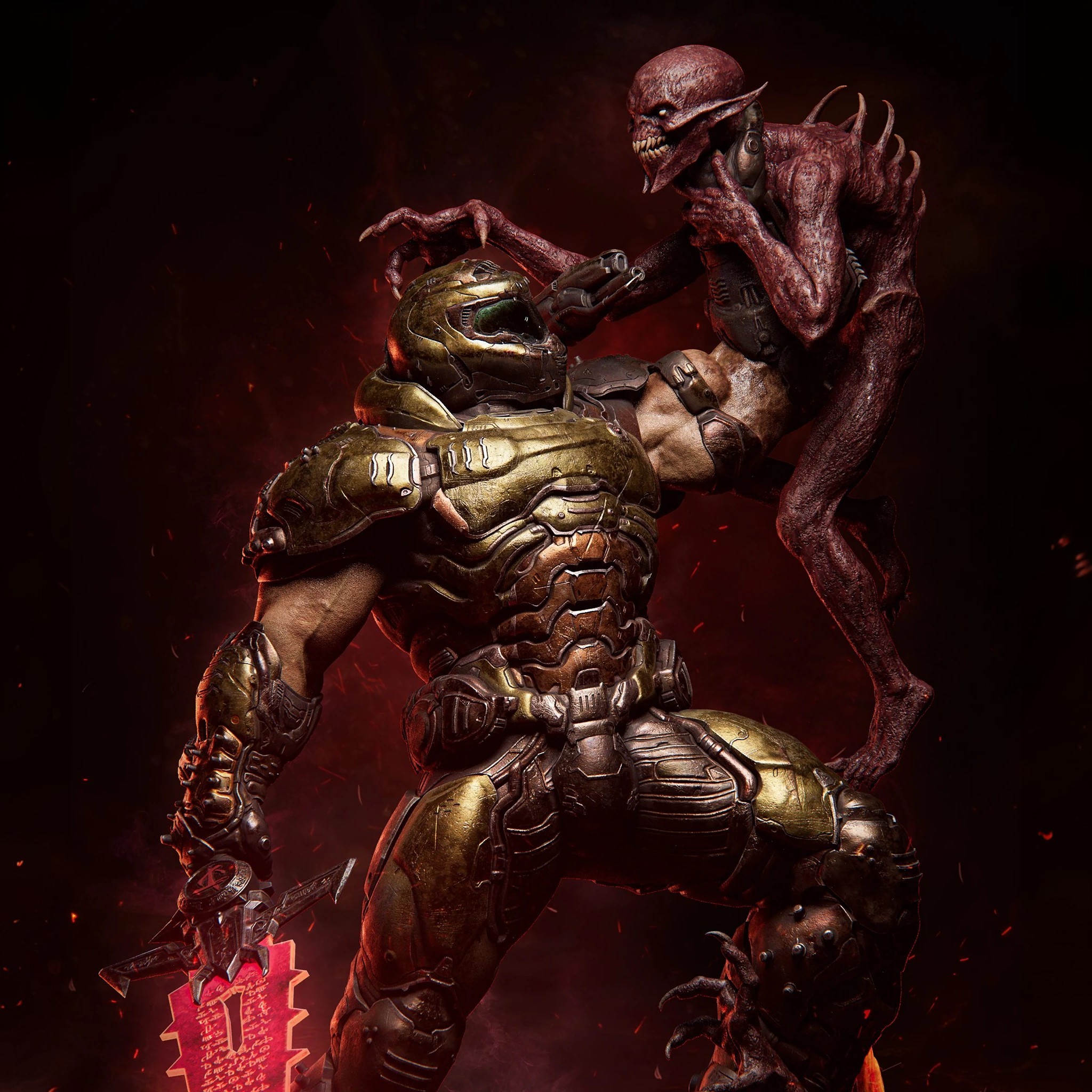 Фигура Doom Slayer из Doom передаёт его как воплощение бескомпромиссной, холодной ярости, у которой не осталось места для слов. В его образе нет героического пафоса — есть только броня, наполненная историей бесконечной войны, и тело, которое привыкло двигаться быстрее, чем враг успевает понять, что уже мёртв. В его позе чувствуется тяжёлая, мощная сила: массивные плечи, напряжённые мышцы, слегка скошенная стойка, готовая сорваться в атаку и превратить любое пространство в сцену расправы. Тёмно‑зелёный Praetor‑доспех, бронированные пластины, шлем с ярким светящимся визором и фирменный шлем‑шлем с отражением адского света — всё это создаёт ощущение, что перед тобой не просто солдат, а человек, который превратил себя в машина войны против демонов. В деталях костюма читается долгая эволюция: от простого зелёного бронещитка 90‑х до сложной, технологичной брони, которая не только защищает, но и усиливает каждый его удар, каждый прыжок и рывок. Эта фигурка фиксирует Doom Slayer в момент перед битвой — когда он уже видит врагов, но ещё не начал разрывать их на части. В его неподвижности чувствуется не отдых, а напряжение, как будто вся сила сосредоточена в одном мгновении, которое вот-вот превратится в хаос. В такой интерпретации он становится символом чистого, безудержного противостояния тьме: не философа, не оратора, а того, кто уничтожает ад шаг за шагом, пулей за пулей, телом за телом.