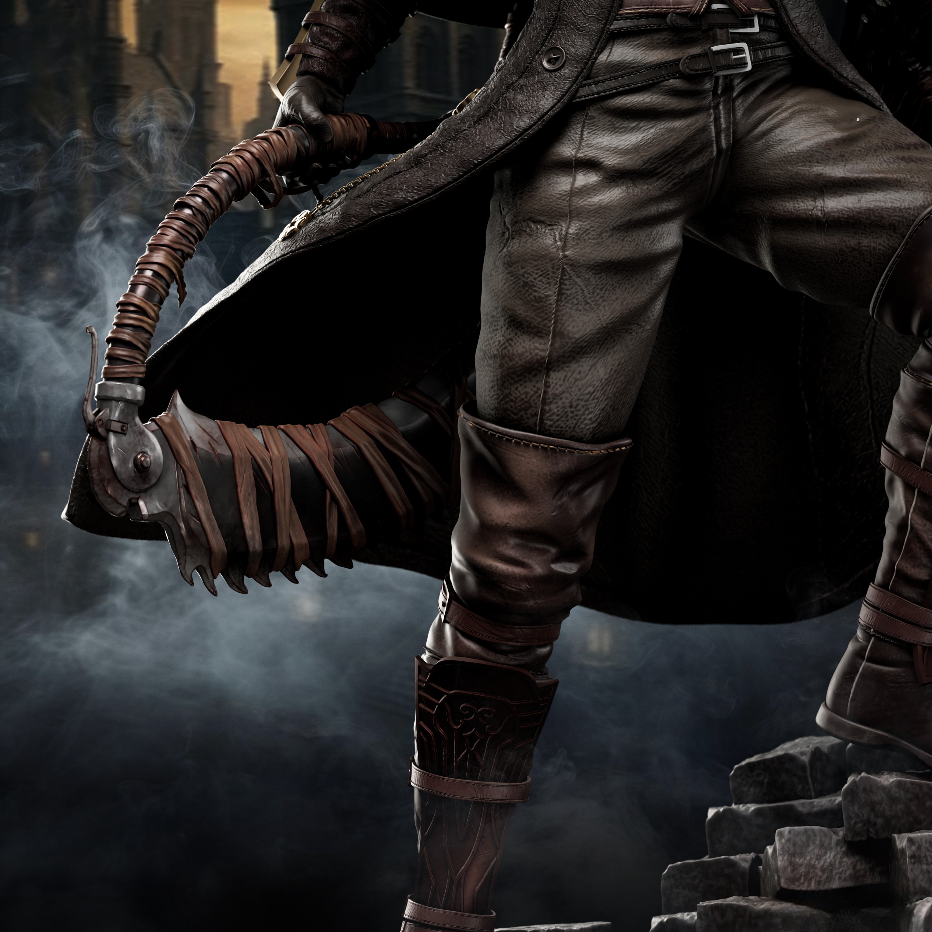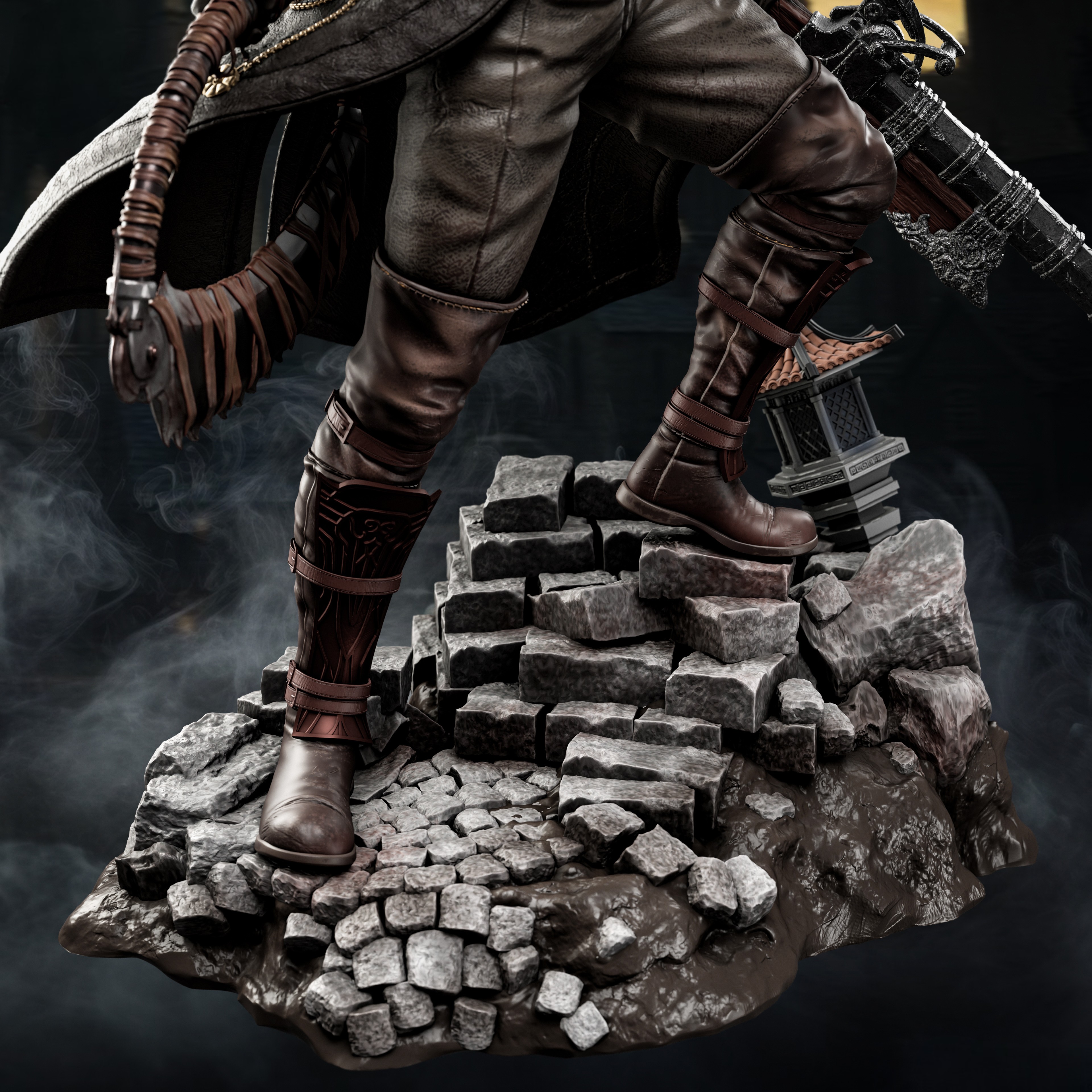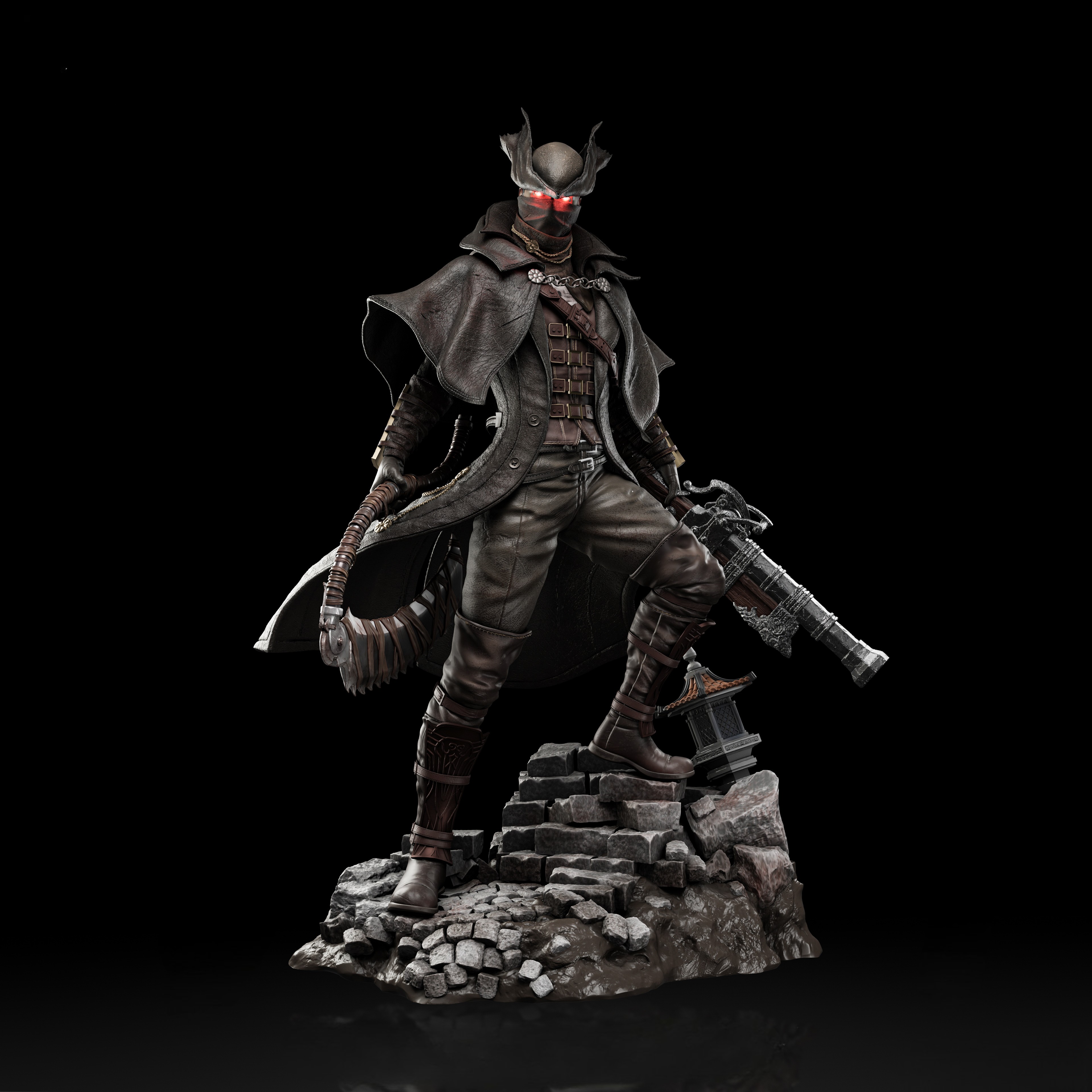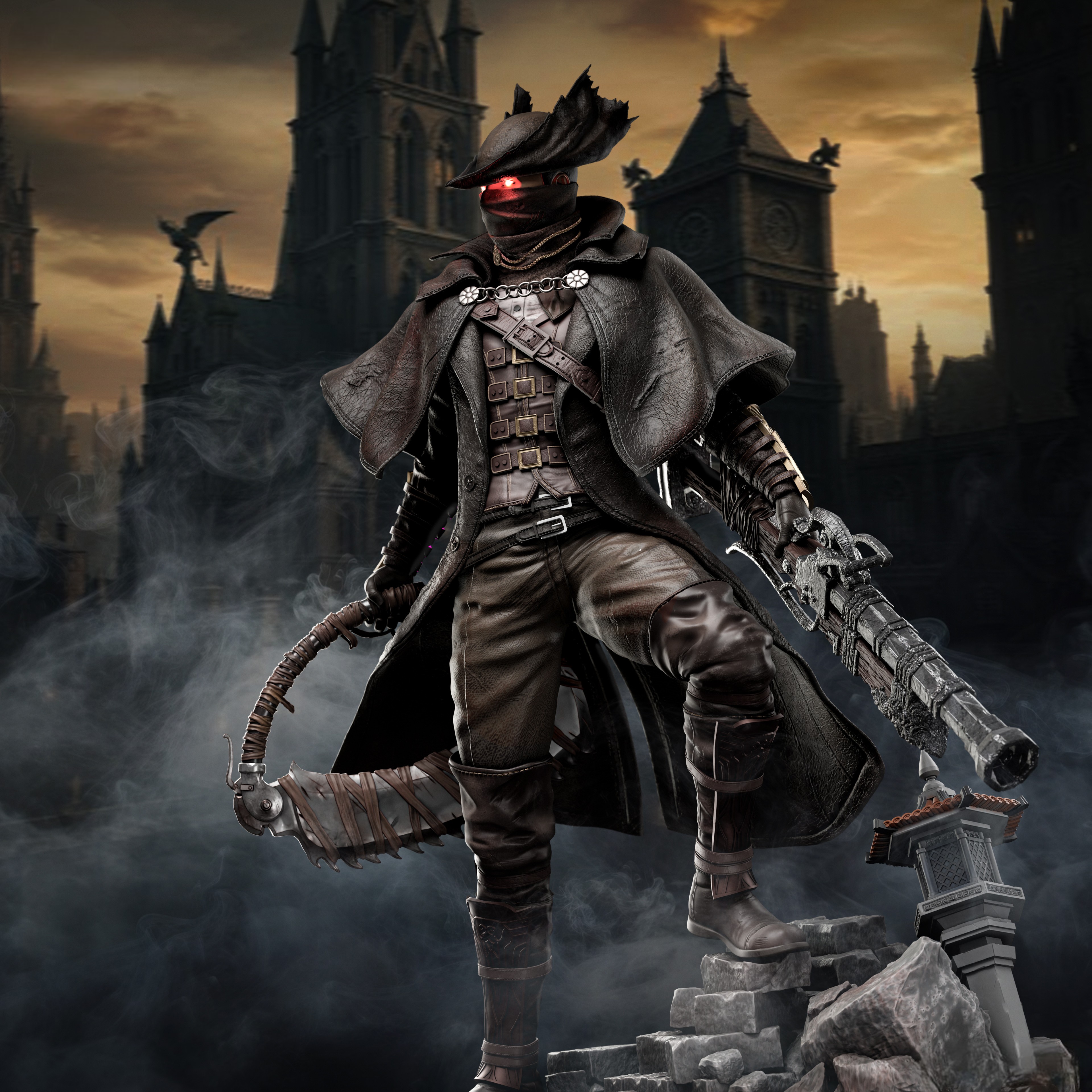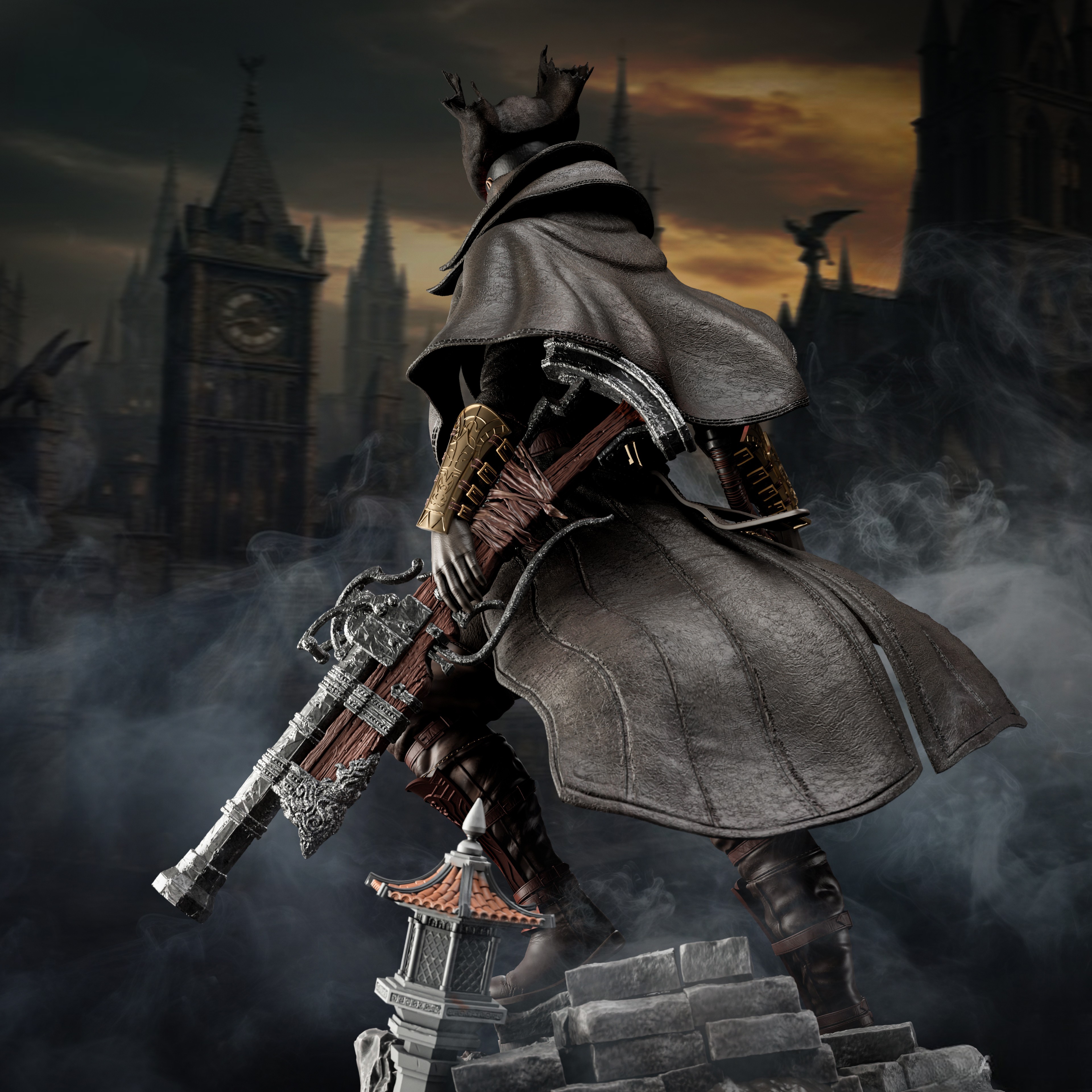 Фигура The Hunter из Bloodborne передаёт его как безымянного призрак ночного кошмара, впитавшего в себя всю жестокость и величие Yharnam. В его образе чувствуется то напряжённое, почти звериное напряжение, с которым он пробуждается после переливания крови у Iosefka: человек, превращённый в охотника, который больше не просто идёт по следам, а сам становится частью цикла вечной охоты на зверей и космических ужасов. Классический костюм охотника — плащ, шляпа, куртка, повязка на лице — подчёркивает его статус придатка к этому миру, а не гостя; в фигурке заметен наклон корпуса, напоминающий готовность к первому прыжку, как будто в следующее мгновение он сорвётся с позиции и ударит Saw Cleaver или выстрелит Hunter’s Blunderbuss, разрывая полутьму болезненным, но необходимым огнём. В его руках будто уже ощущается вес крови, которую он проливает и пьёт, и та сила, что даёт ему возможность выдерживать урон, с которым не справился бы ни один обычный человек. Эта фигура фиксирует The Hunter в момент, когда он не знает, кто он — жертва, инструмент или последняя надежда Yharnam. В такой интерпретации он становится символом безмолвной, но непоколебимой решимости: того, кто не задаётся вопросами, а идёт вперёд, пока кровь ещё течёт, а лунный свет не сошёл в бездне.