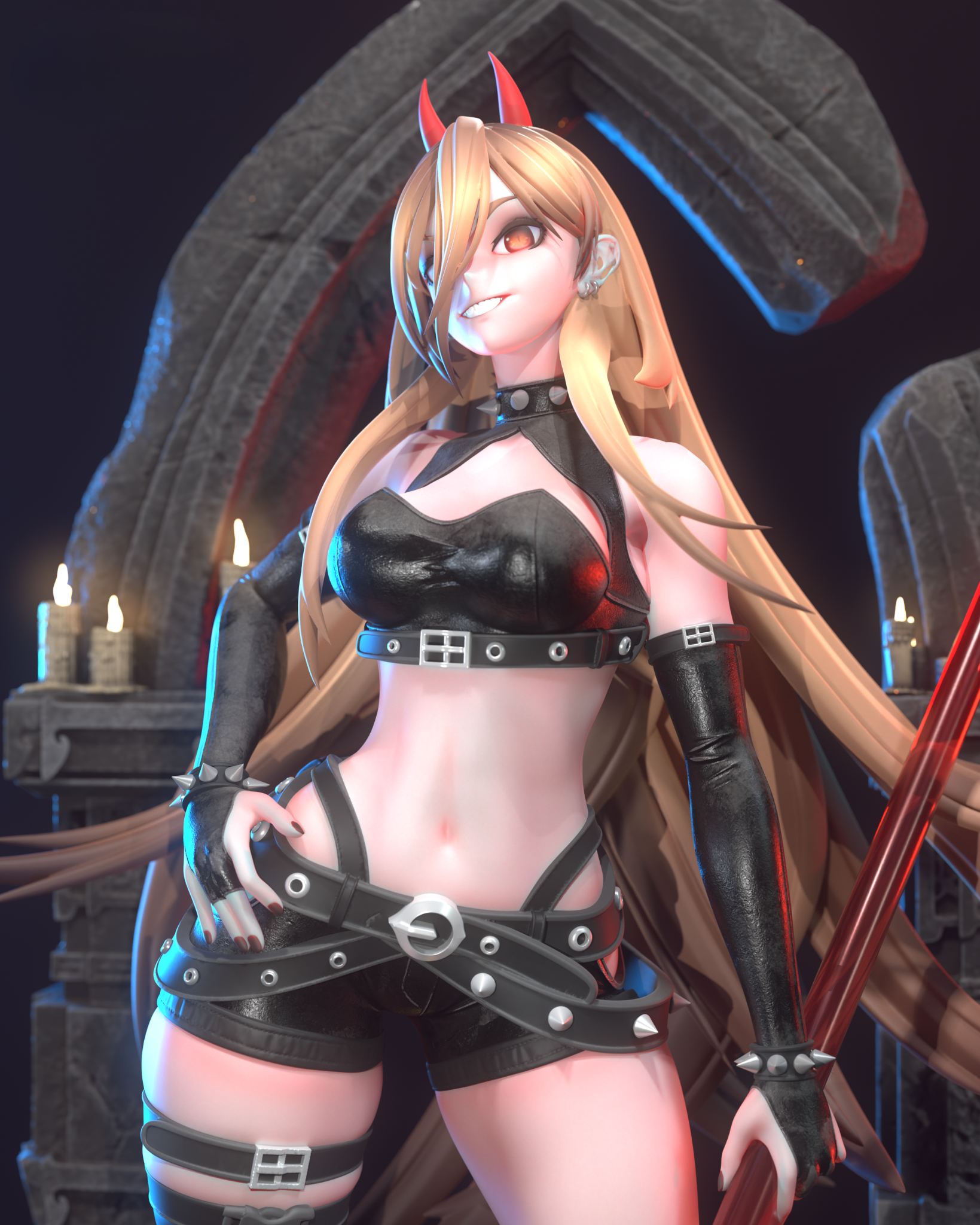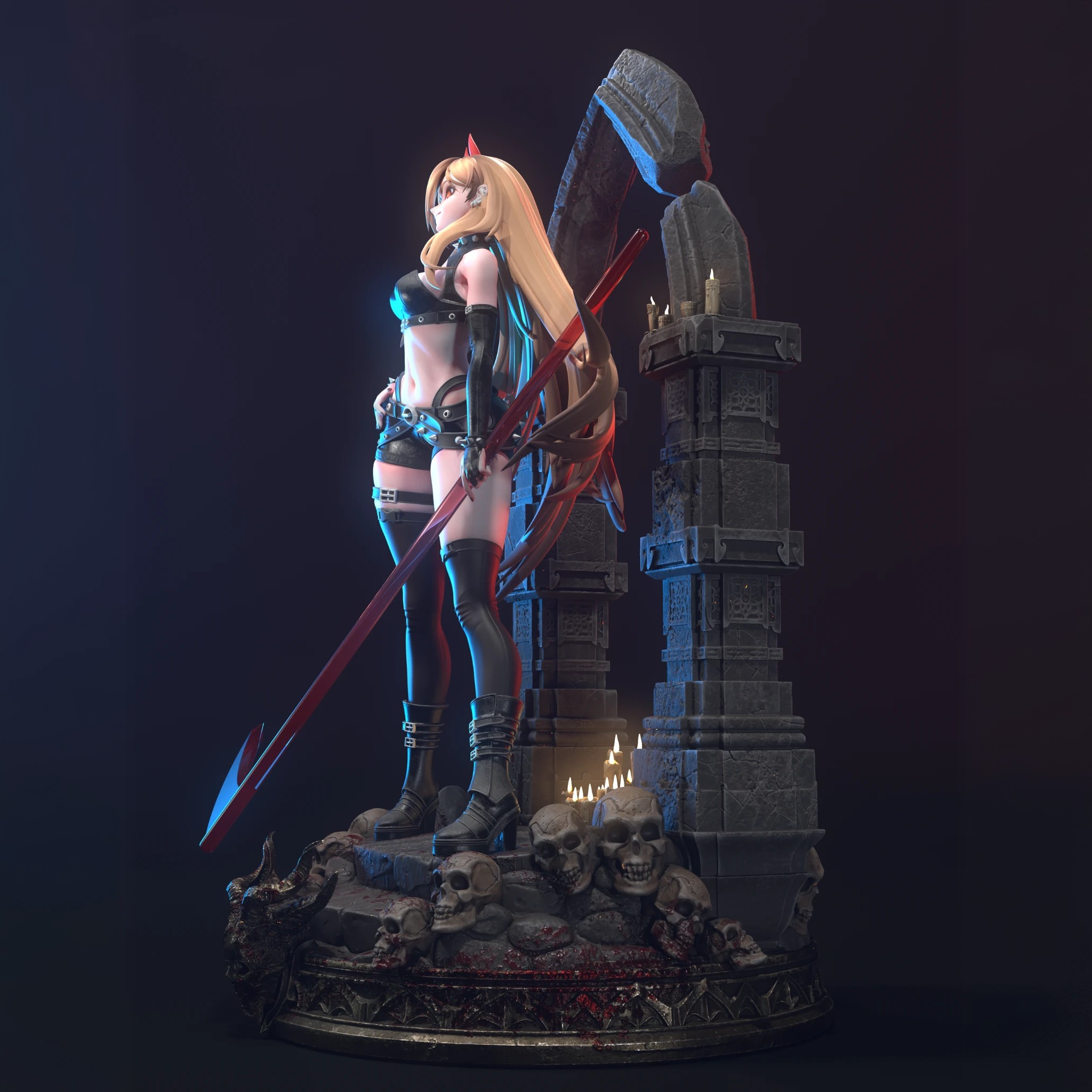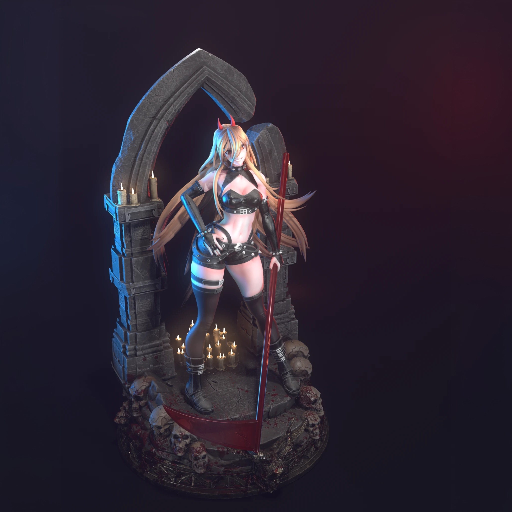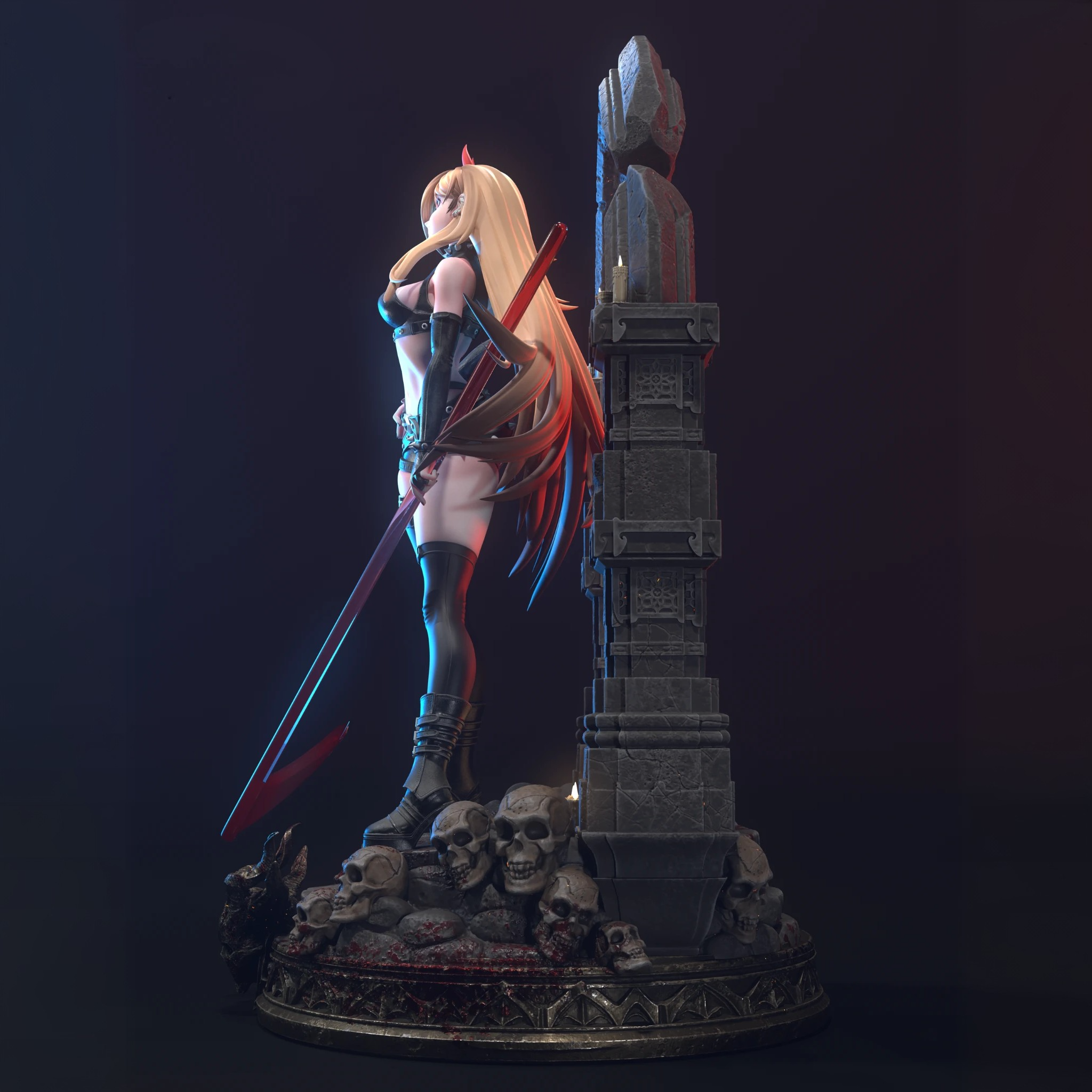 Фигура Power из Chainsaw Man передаёт её как маленькую, но громкую и крайне колючую девочку‑фиона, в которой сочетается детская выходка и жесткий расчет. Внешне она выглядит как худая, почти подростковая девушка с длинными светлыми волосами, из‑под которых торчат два коротких красных рога, а в глазах чувствуется яркая, желтоватая радужка с резким красным крестом, как у существа, которое не скрывает, что не относится к людям. В фигурке подчёркнут её фирменный, слегка неряшливый стиль: простая, чуть обтягивающая кофта, шорты или джинсы, следы крови на одежде, как будто она только что вышла из очередной стычки, а не из аккуратного кабинета. В руках она как будто готова сформировать из собственной крови огромный молот или острую копьё‑сердце, её поза выглядит более агрессивной, чем собранной, как у человека, который сначала врывается в бой, а потом уже думает, как из него выйти. Эта фигура фиксирует Power в момент, когда она не только хвастливая, обжорная и грубая соратница Дэндзи, но и фион, который не боится признать, что жизнь «в равной мере никчёмна», хотя для него самого это не так. В таком образе она остаётся колючей, эгоистичной, но не лишённой привязанности героиней, опирающейся на силу крови, детскую хитрость и привычку перекладывать вину, а не на спокойную мораль или зрелость.