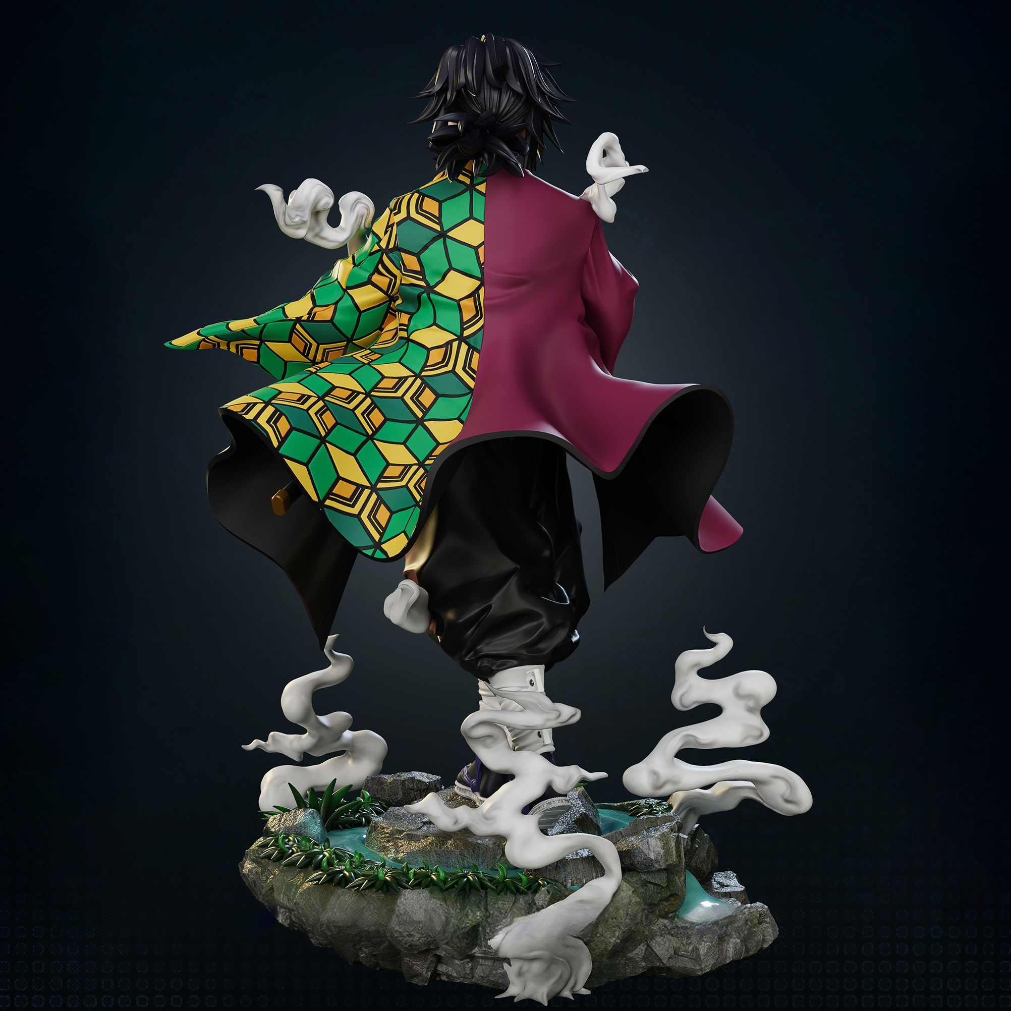 Фигура Томики Гию из Demon Slayer передаёт его сдержанную силу и хладнокровие. Он стоит в боевой стойке, корпус слегка развёрнут, рука удерживает меч в положении перед предстоящим ударом. Хаори с характерным контрастом узоров на двух половинах выполнен с высокой детализацией: ткань будто колышется от порыва ветра, складки подчёркивают движение и создают эффект присутствия. Взгляд направлен вперёд спокойный, но острый, лишённый эмоций и сомнений. Лицевые черты максимально выразительны: полное самообладание читается в каждом штрихе, словно он уже оценил противника и выбрал единственно верный момент для атаки. Волосы переданы с динамикой движения, отдельные пряди придают композиции живость. Статуя подчёркивает образ Гию как охотника, который действует тихо и точно, без лишних жестов. Это не эффектная демонстрация силы — это безмолвная уверенность мечника, для которого результат важнее шума битвы.
