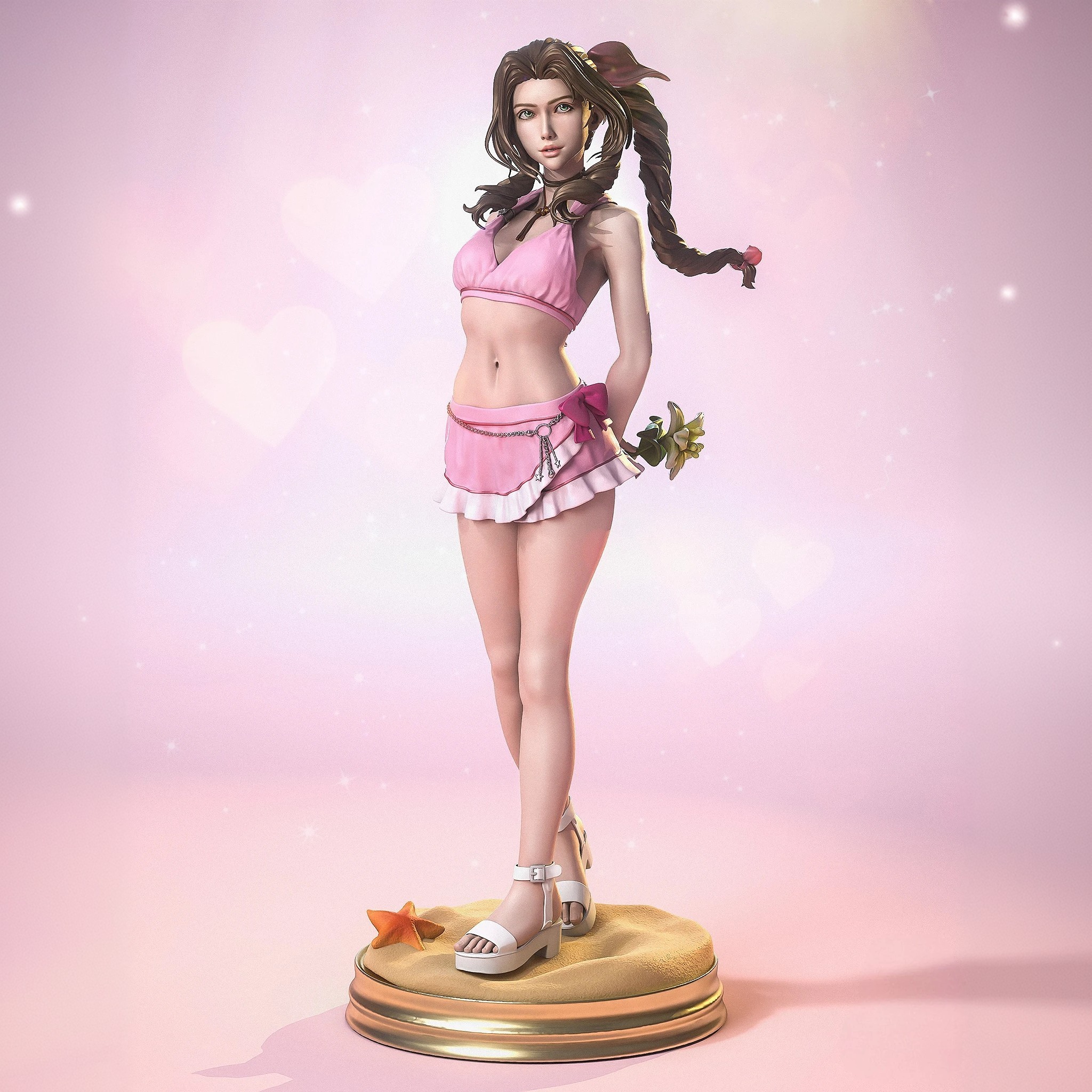 Фигурка Аэрис Гейнсборо из Final Fantasy VII раскрывает её как единственную Цетру из нищих кварталов Мидгара — продавщицу цветов, что слышит голоса Лайфстрима и ведёт Аваланшу против Синры, жертвуя собой ради мира от Метеора Сефирота. Она застыла в лёгком порыве ветра: платье цвета зари с рюшами парит, каштановые пряди с лентой вьются, ладони сжимают жёлтые лилии, а в глазах таится кроткая сила и зов природы. Элементы образа хранят её историю — светлые рукава, алый корсаж, грубые сапоги и подножие с цветами, отсылающее к тайным садам и алтарю Забытого города. Стойка полна притягательной хрупкости: Аэрис не разит клинком, а плетёт магию исцеления среди обломков. Во взгляде Аэрис — преданность друзьям и эхо неизбежного. Эта фигурка воплощает её чистый свет, безупречно вписываясь в коллекцию Final Fantasy.