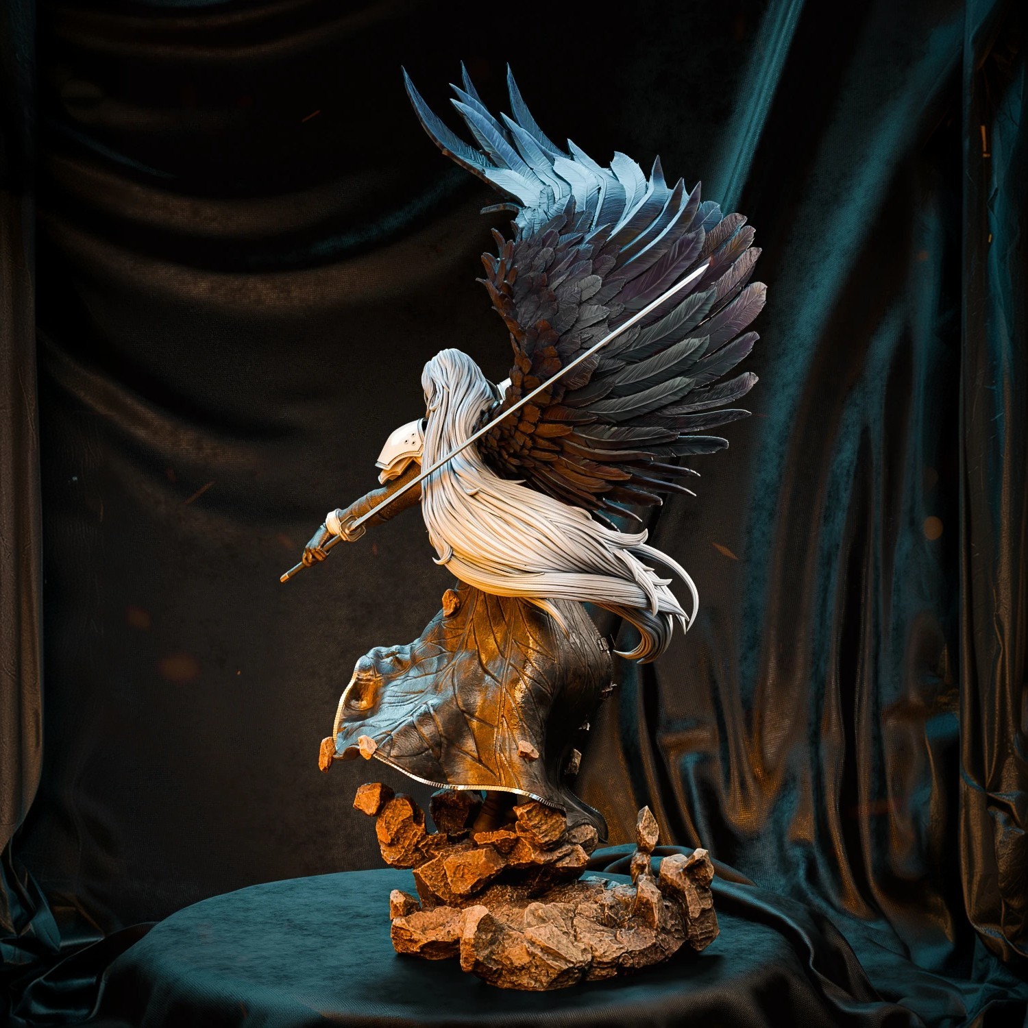 Фигурка Сефирота из Final Fantasy VII воплощает падшего героя — серебряноволосого солдата первого класса, сына Дженовы, что жаждет стать богом, вызвав Метеор и поглотив планету. Он застыла в зловещей грации: длинные серебряные пряди с пробором ниспадают до пояса, циановые кошачьи глаза сверкают безумием, чёрный плащ с серебряными наплечниками развевается, открывая грудь с кожаными лямками, а в руке Масамуне — катана длиной в два роста для уколов вроде Сердца неба, Тени вспышки и Полёта вперёд. Фигура передаёт его величие: поза полна высокомерия, чёрное крыло ангела-единорога пробивается из плеча, вокруг вьётся тёмная аура. Подробности оживляют его суть — венец в Ниибельгейме, клоны из Либра, замок на краю кратера, подставка с руинами и осколками Метеора. Поза неподвижна, но смертоносна: Сефирот не бросается в рубку, а пронзает на расстоянии, сея иллюзии и хаос. Эта фигурка схватывает суть ангела уничтожения — ледяной мощи падшего, безупречно дополняя собрание Final Fantasy подле пламени Терры и скорости Клауда на Фенрире