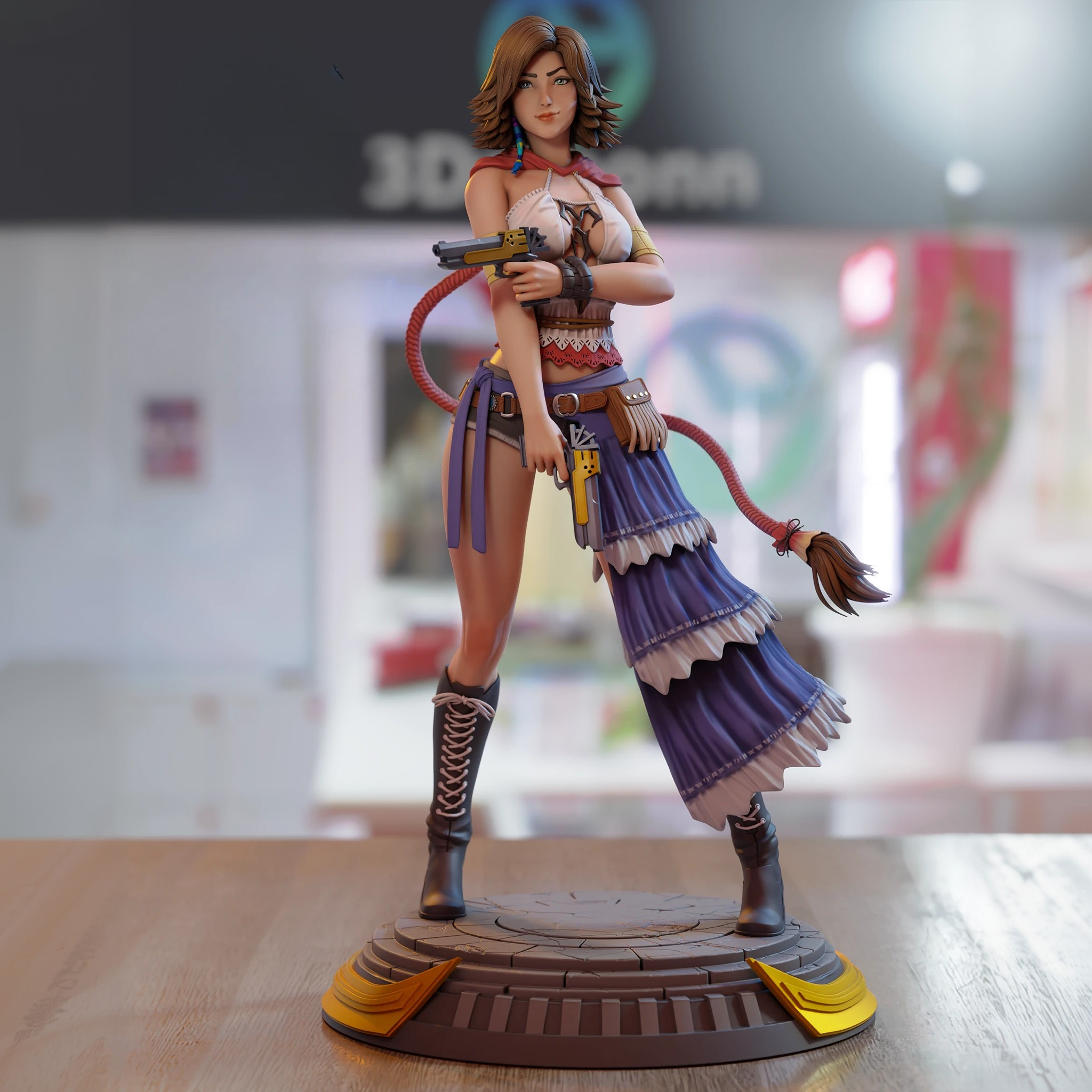 Фигурка Юны из Final Fantasy X-2 воплощает отважную гуляку — бывшую призывательницу, что оставила жезл ради пистолетов, хвоста демона и приключений с Рикку и Пейн в охоте за сферами по Спайроле. Она застыла в дерзкой стойке: длинная коса с жёлтой лентой развевается, разноцветные браслеты на запястьях и лодыжках блестят, короткое фиолетовое платье с разрезами облегает формы, красный демонский хвост извивается за спиной, а в руках пара пистолетов Триггер Хэппи — оружие для быстрых выстрелов и Gunner-атак вроде Тёмной пушки или Бегства. Фигура передаёт её свободу: глаза искрятся озорством, вокруг вьётся энергия сфер, а поза полна энергии скаута. Подробности оживляют её преображение — отказ от жертвы ради жизни, союз с гульками, танец Отправления в прошлом, битвы с Вегнапюрами, подставка с жёлтыми панелями и камнями сфер. Поза динамична: Юна не молится эонам, а стреляет и вертится, сочетая ловкость с огневой мощью. Эта фигурка схватывает суть возрождённой героини — весёлой искательницы приключений, безупречно дополняя собрание Final Fantasy подле грации классической Юны и мощи Тифы.