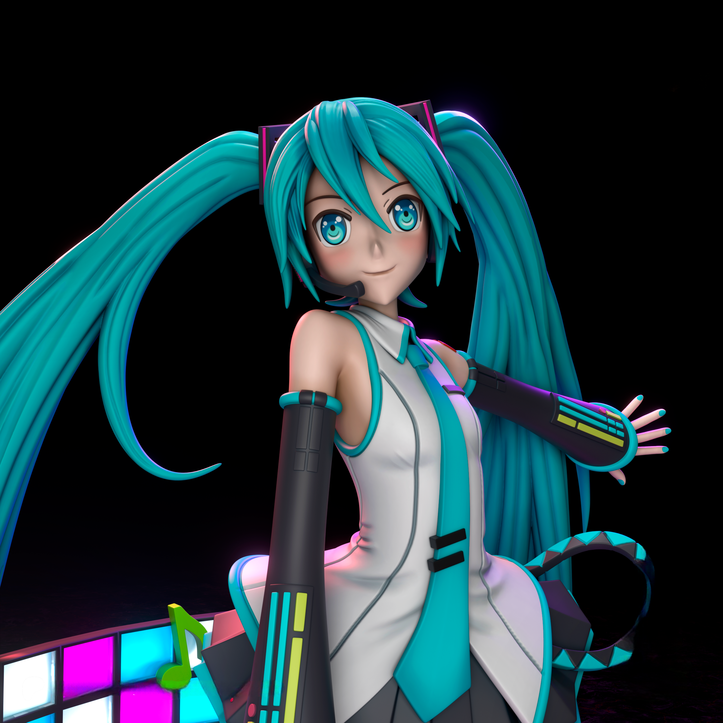 Фигурка Хацунэ Мику передаёт её как живую мелодию в мире цифровых грез — первую виртуальную диву, чьи ритмы покорили миллионы сердец. Она застыла в танце, полном энергии: тело изогнуто в грациозном вихре, длинные бирюзовые хвосты волос парят, будто подхваченные невидимым битом, а руки раскинуты в порыве, зовущем всех на сцену. Детали образа усиливают её магию — футуристическое платье с LED-акцентами, массивные наушники, микрофон в руке и микропетли на волосах, что стали её визитной карточкой. Поза полна той же заразительной радости, с которой Мику поёт о любви, мечтах и повседневных чудесах, превращая каждый концерт в праздник, где фанаты становятся соавторами её хитов. Взгляд Мику сияет детской искренностью и бесконечным энтузиазмом. Фигурка фиксирует её суть — не просто икону поп-культуры, а мост между виртуальным и реальным, идеально оживающий в коллекции, где музыка обретает форму.