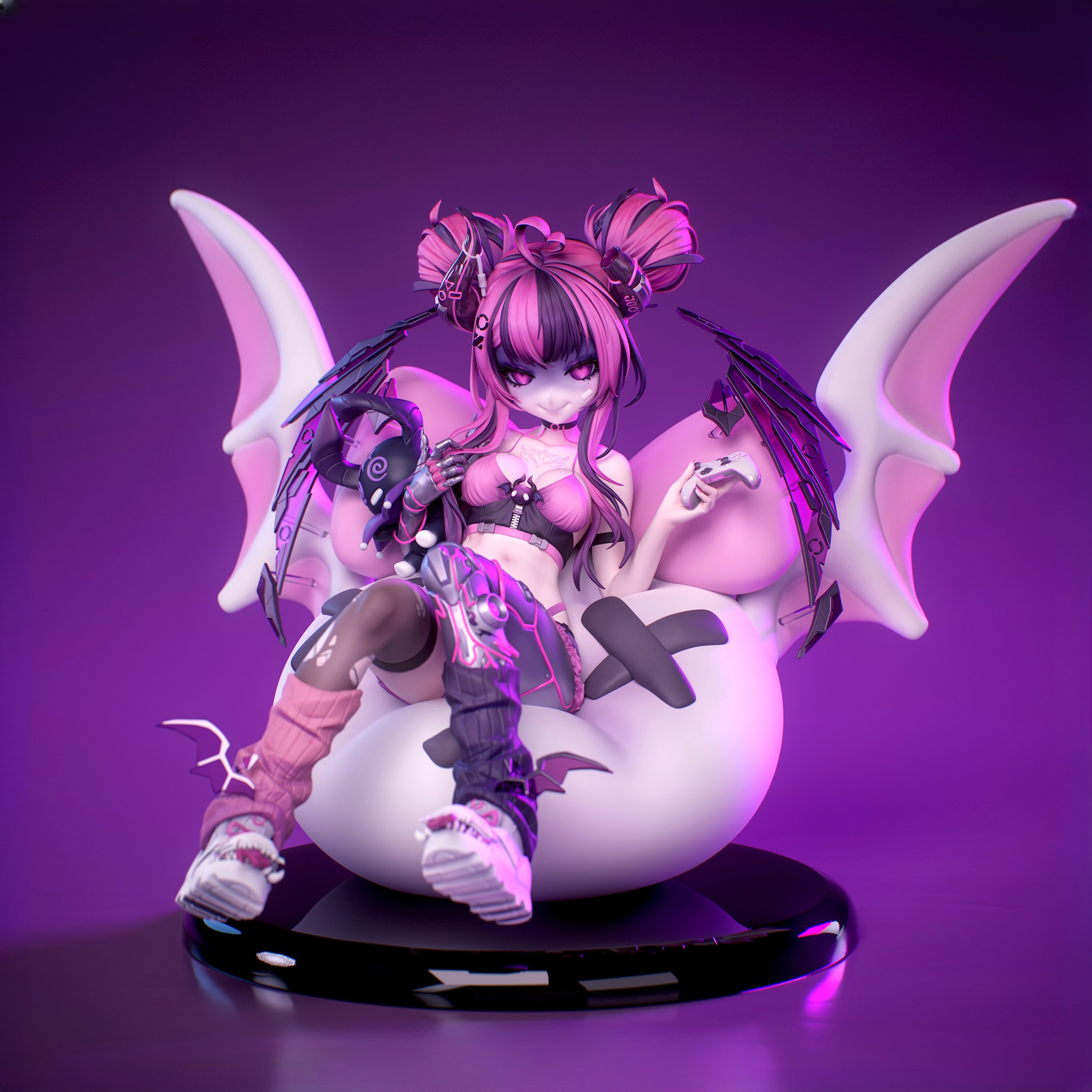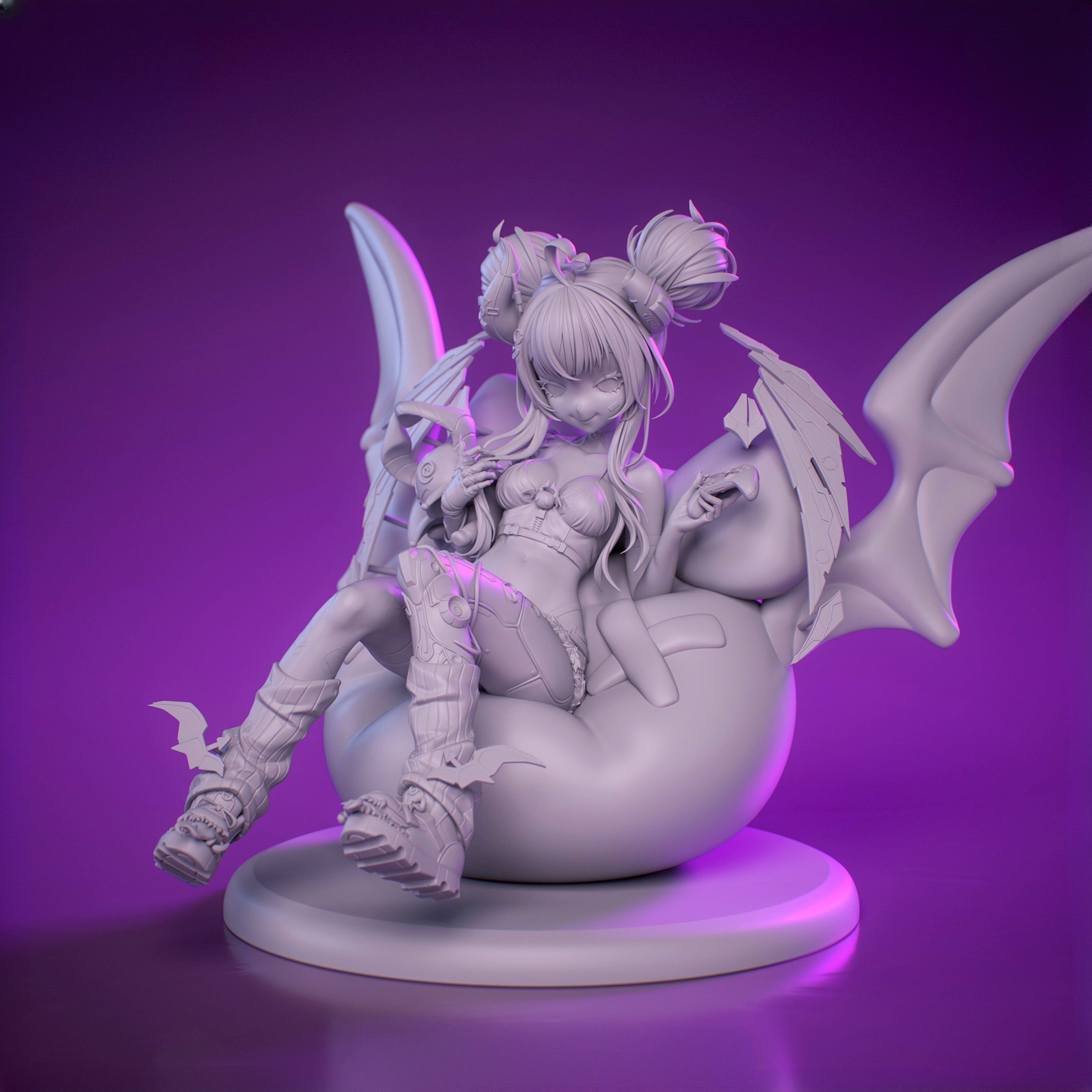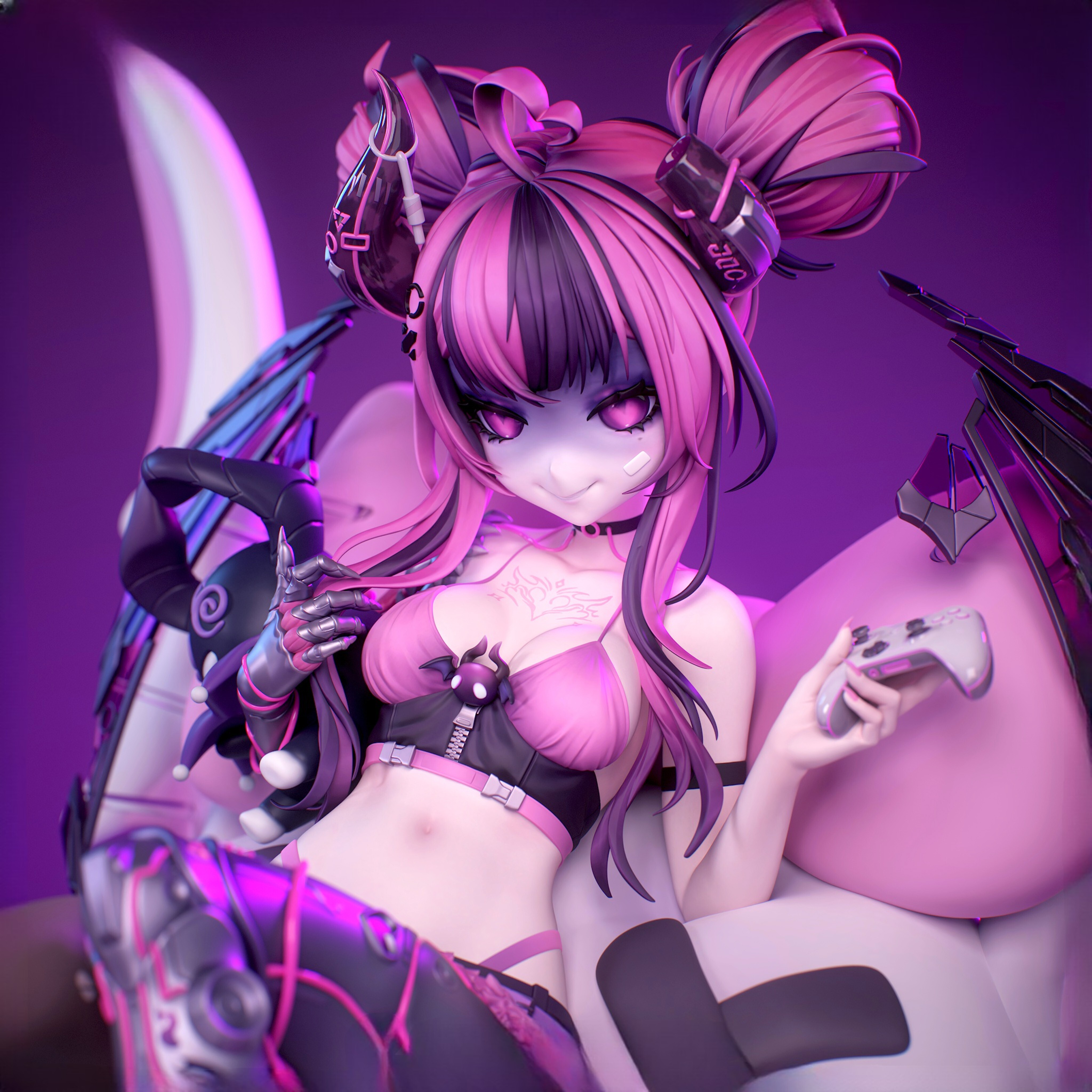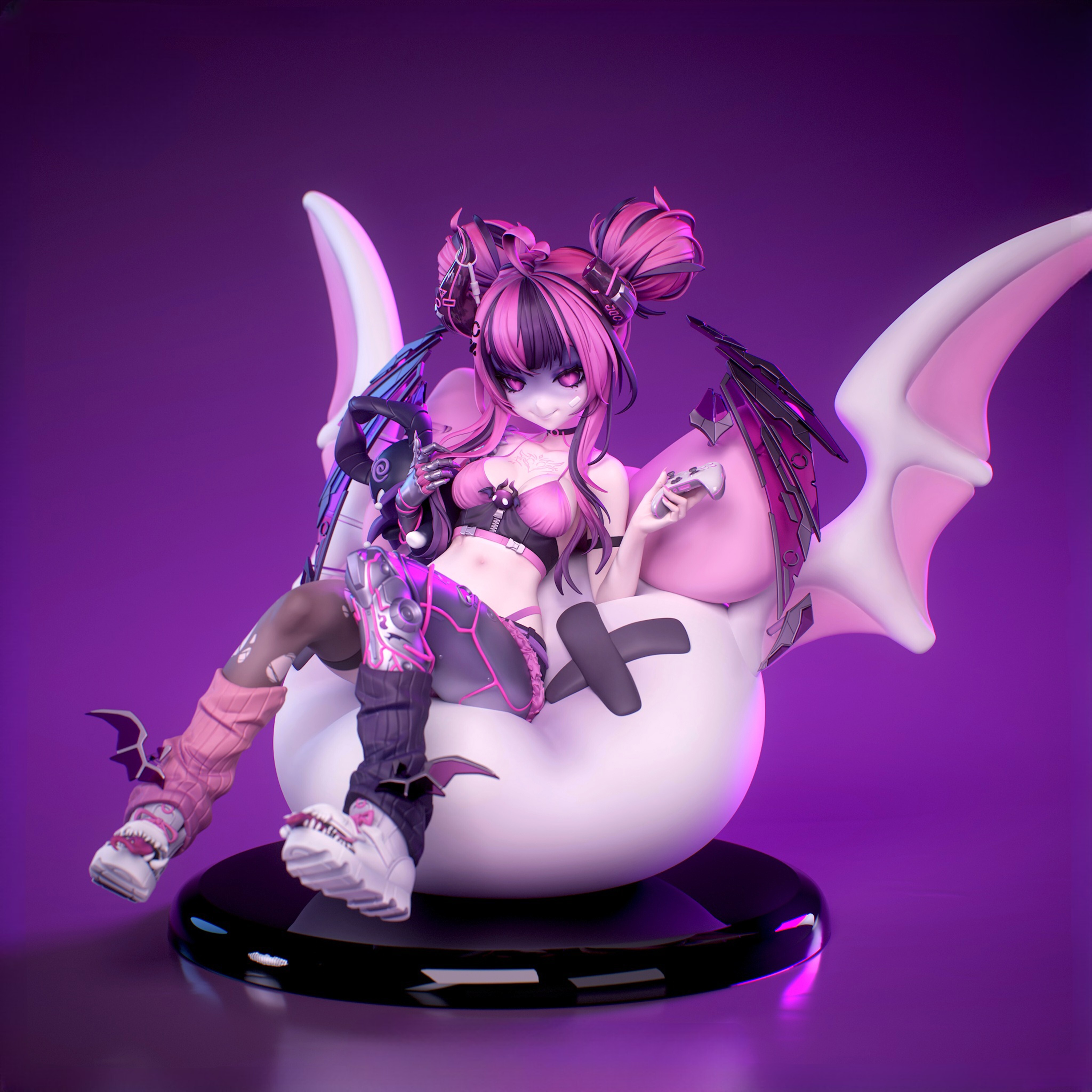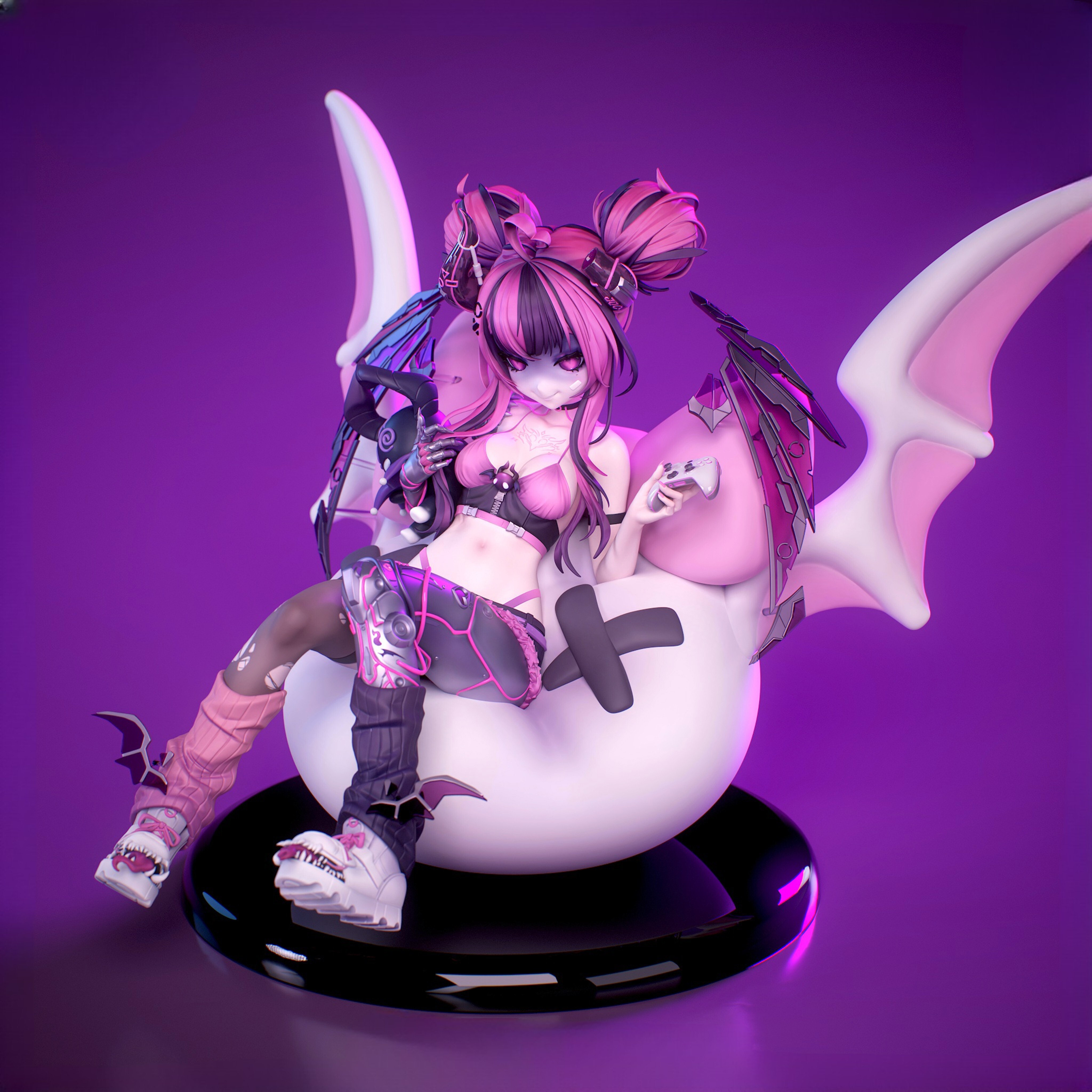 Фигура Ironmouse передаёт её взрывную энергию в сдержанном, но выразительном формате. Крылья и хвост оформлены с плотной проработкой текстур, без перегруза деталями, поэтому образ не теряет цельности. Волосы выполнены объёмно, с резкими цветовыми переходами, подчёркивающими контраст её яркого визуального стиля. Выражение лица сочетает озорство и уверенность, как будто она готова бросить шутку — и одновременно руководить всем хаосом вокруг. Поза читается легко: стоящая Ironmouse будто удерживает центр сцены, даже если вокруг тишина. Лёгкая асимметрия плеч и поворот подбородка придают характер «я знаю, что на меня смотрят, и мне это нравится». Детали наряда передают смесь милой эстетики и демонической харизмы без перекоса в пародию или чрезмерную агрессию. Фигура создаёт цельный, выразительный образ — узнаваемую Ironmouse, но не мультяшную, а уверенную, харизматичную и по-своему величественную.