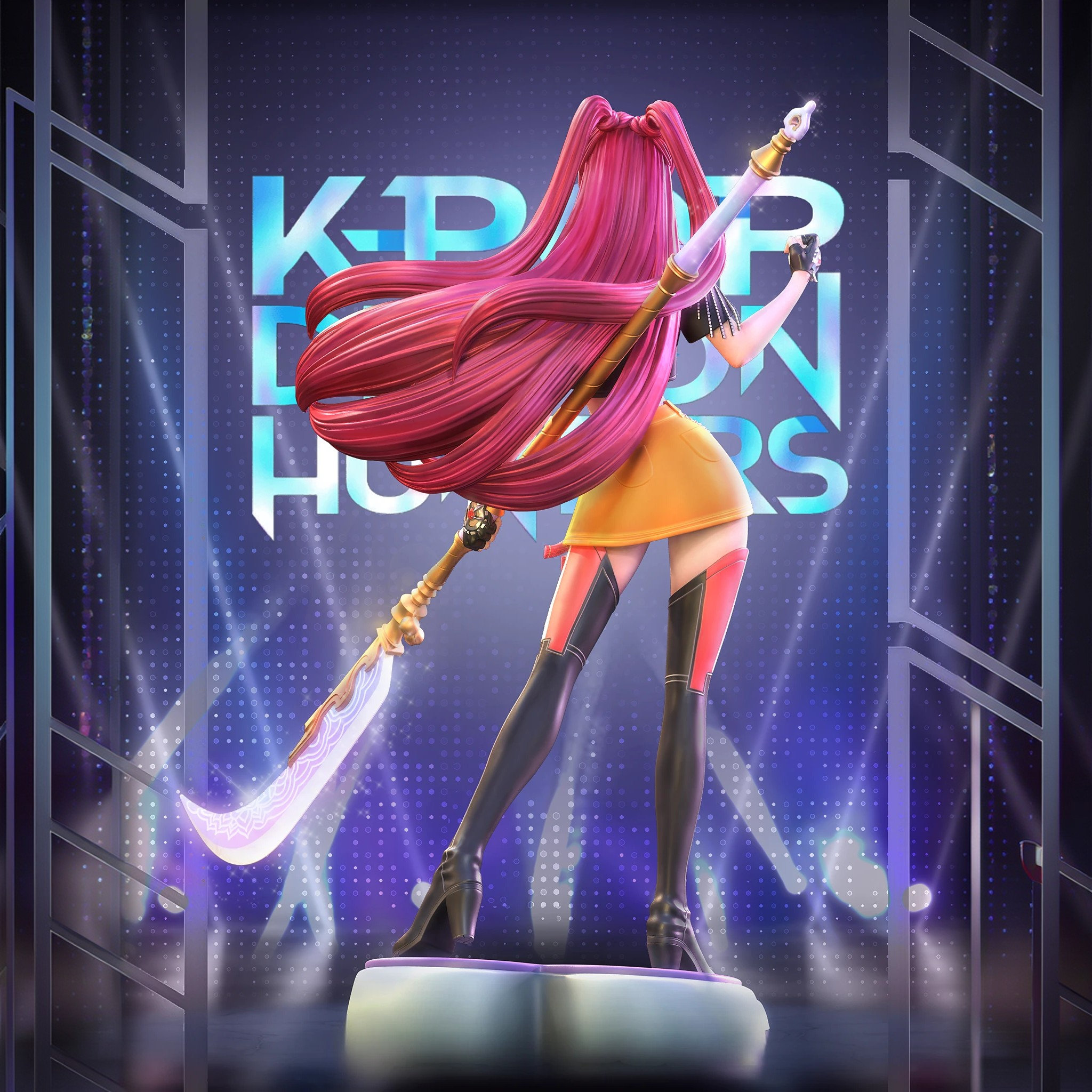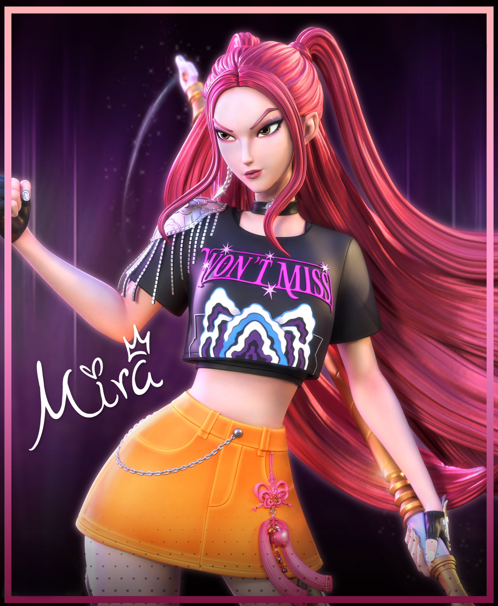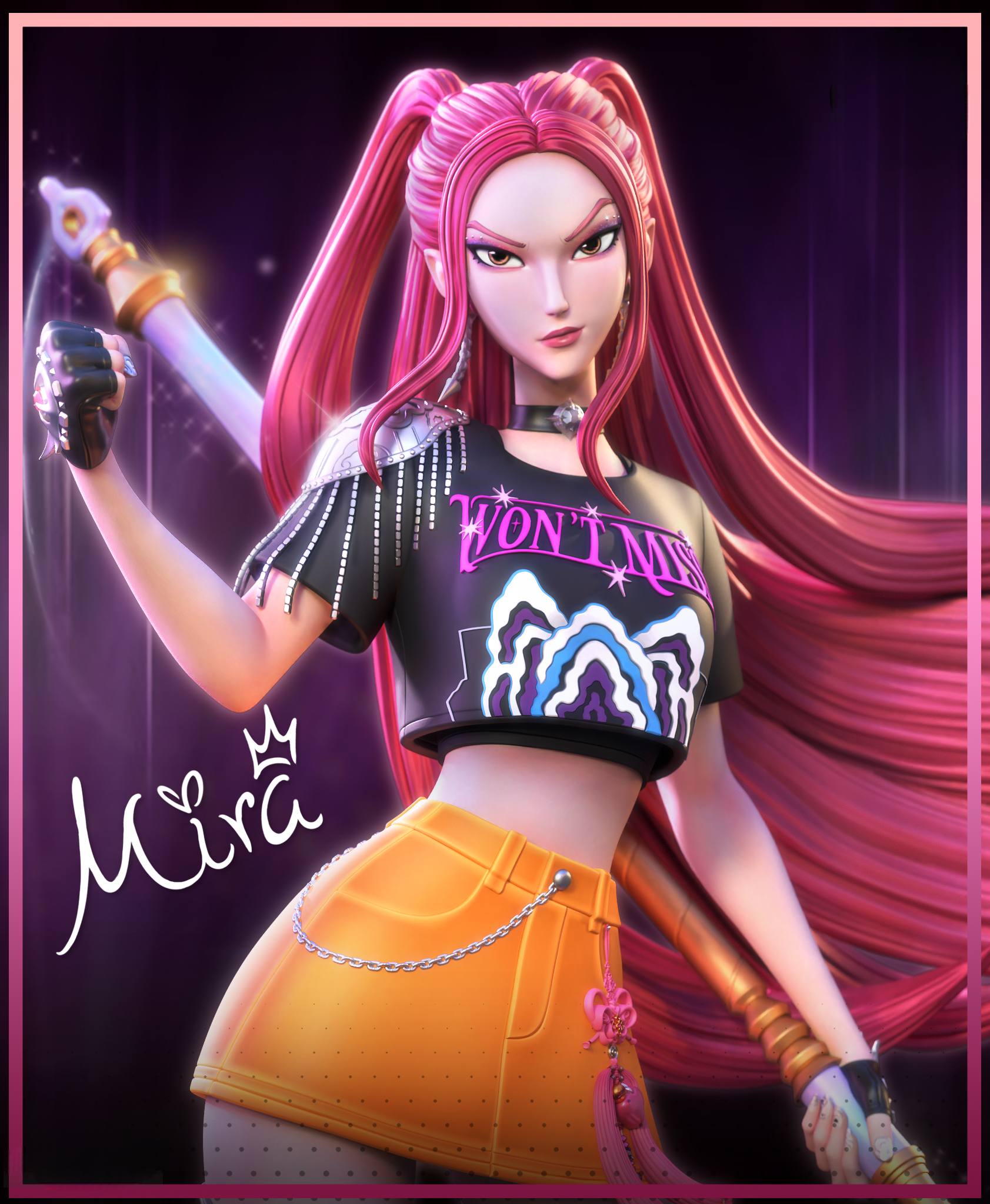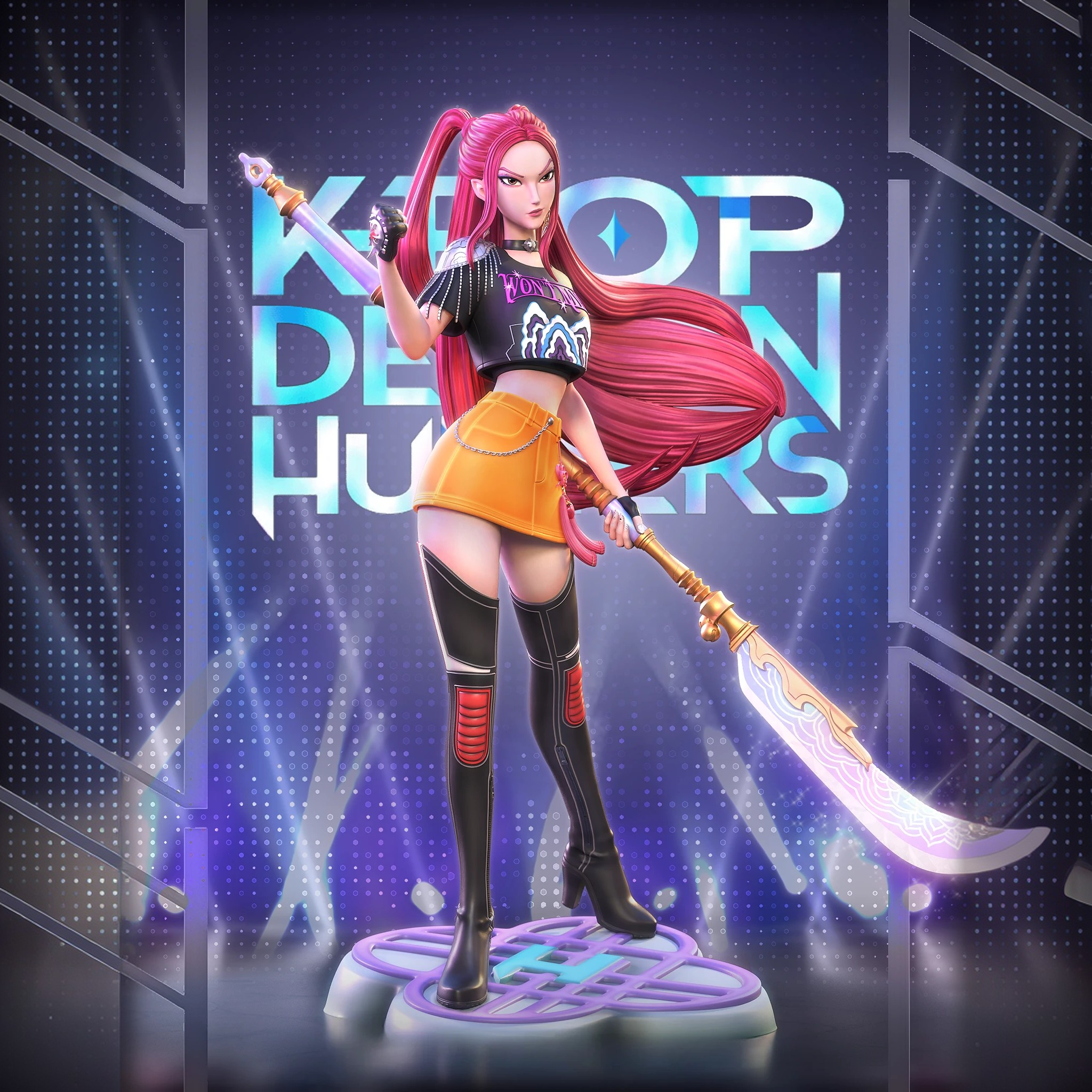 Фигура Миры отражает сочетание сценической пластики и боевой стойкости. В композиции зафиксирован момент перед решающим выпадом: корпус развёрнут, нога уверенно поставлена, алебардное копьё направлено вперёд. Линии движения читаются чётко, создавая ощущение напряжения и контроля. Костюм выполнен с акцентом на сценовый стиль Huntr/x: гладкие панели, последовательные геометрические вставки, аккуратные элементы металлика. Лицо передаёт собранность, взгляд сосредоточен и прямой. Фигура показывает Миру как охотницу, привычную к дисциплине и чёткому ритму действий.