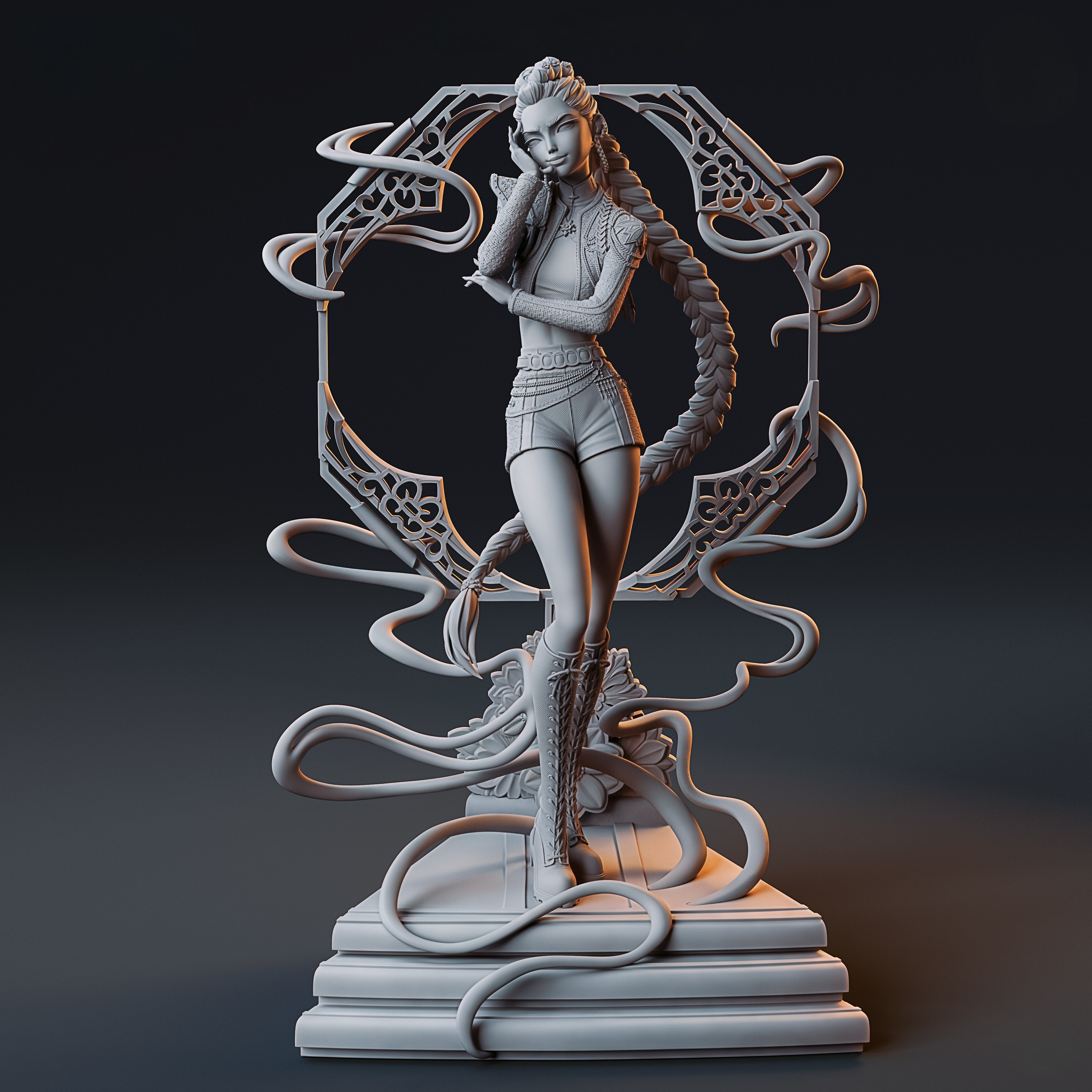 Фигура Rumi Golden передаёт кульминационный момент её пути в образе, где лидерка Huntr/x уже не прячет свою истинную природу. Она стоит уверенно, микрофон в руке, корпус чуть повернут, нога надёжно поставлена — как будто начинается финальный куплет хита “Golden”. Костюм отражает новую фазу: ткань с золотистыми акцентами, геометрия рисунка подчёркивает её демонические метки, которые уже не скрыты, а интегрированы как часть личности. Прорисованы детали – золотые цепочки на плечах, чёткие складки куртки, длинная фиолетовая коса‑брейд свободно падает за спиной. Лицо выражает решимость и спокойную силу, взгляд направлен вперёд и чуть вверх — символ перехода от борьбы к принятию.