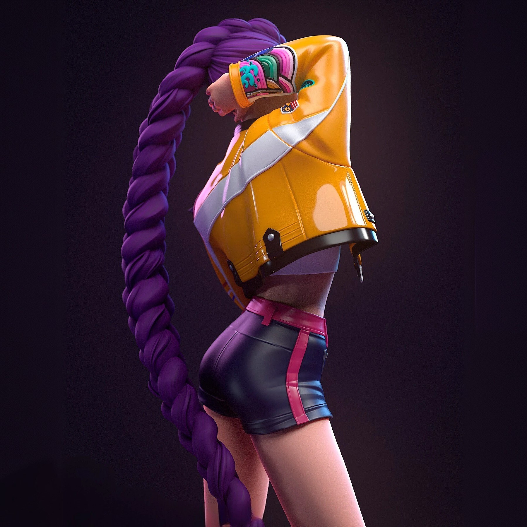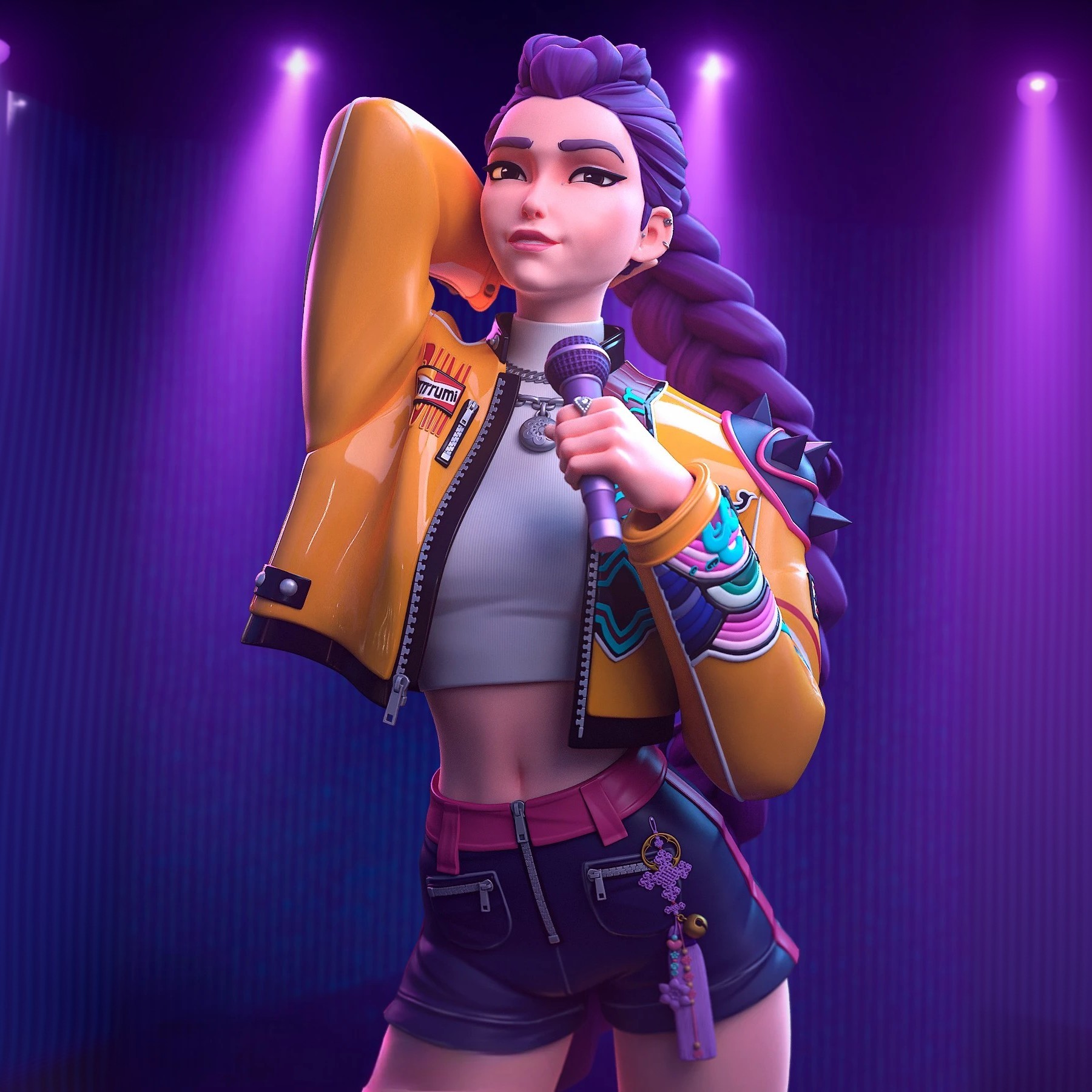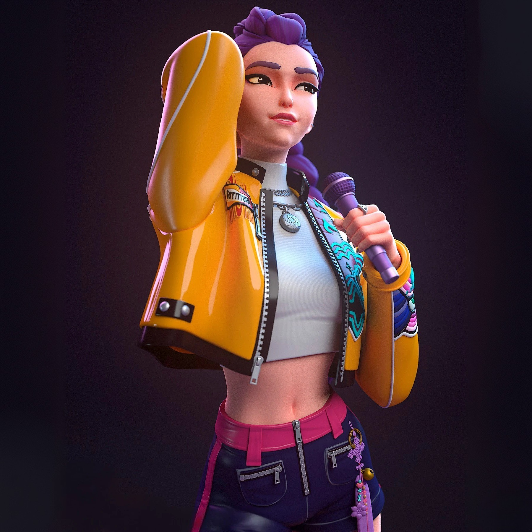Костюм отражает сценический образ Huntr/x: насыщенные оттенки, металлические детали и тонкие узоры, добавляющие глубину образу. Прорисованы складки ткани, аксессуары и прическа — длинная фиолетовая коса развевается за фигурой, подчёркивая динамику и стиль. Лицо выражает решимость и внутреннюю силу, взгляд устремлён вперёд, создавая впечатление, что перед нами не просто айдол, а лидер, способный захватить внимание публики и вдохновить на новые свершения.
