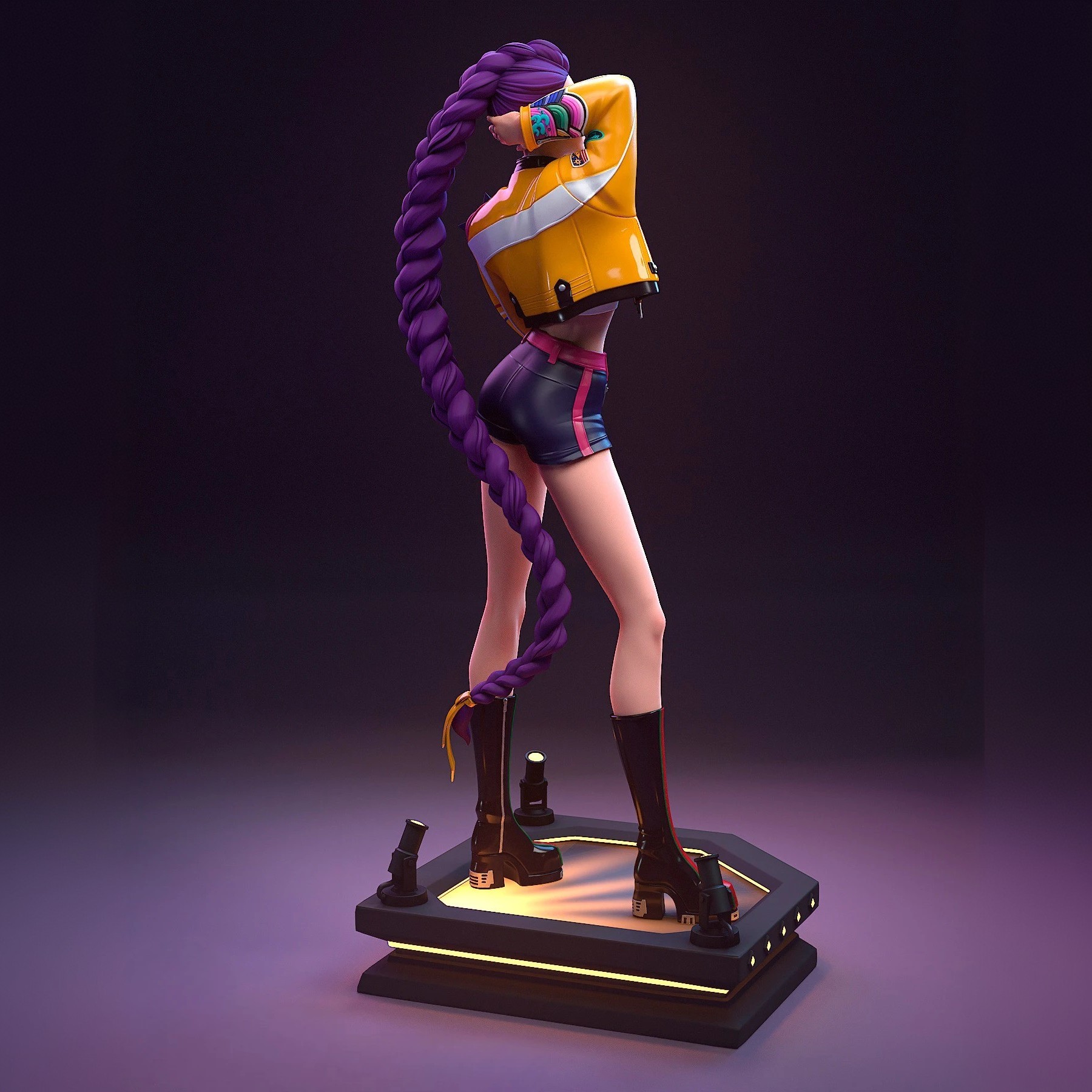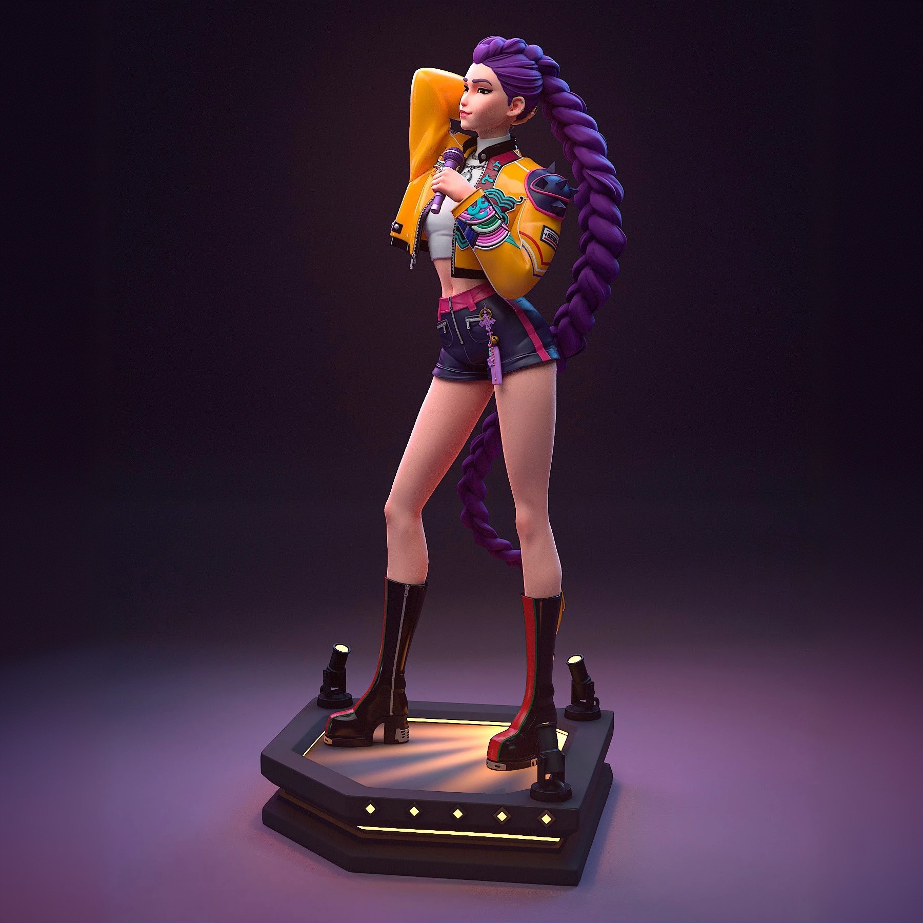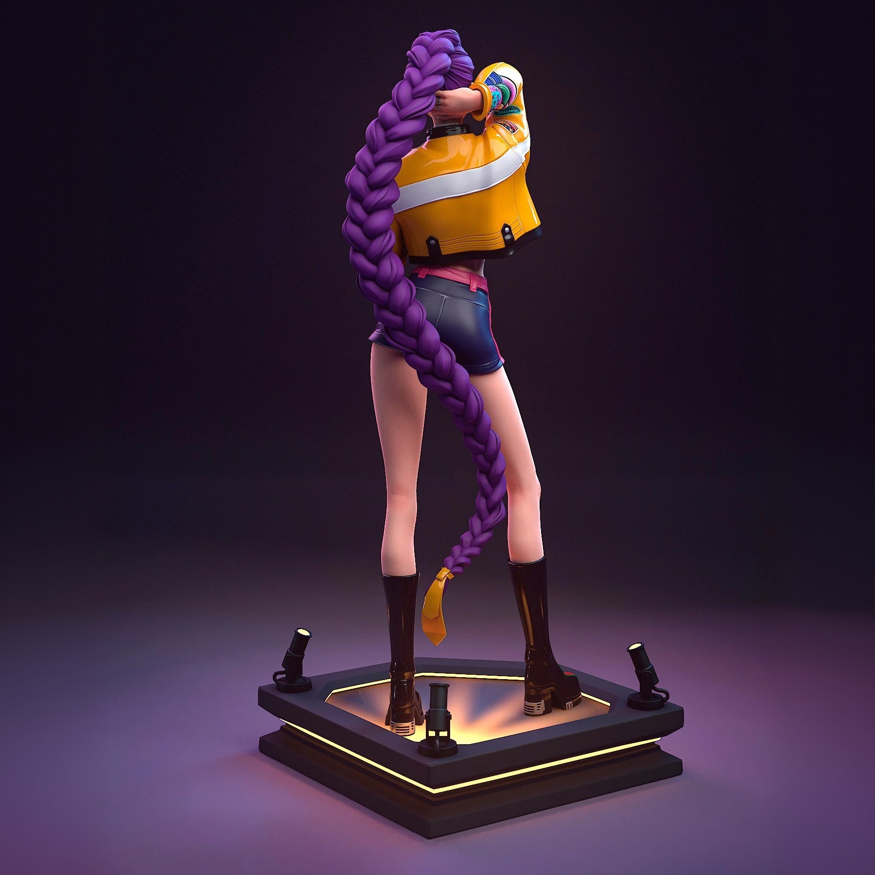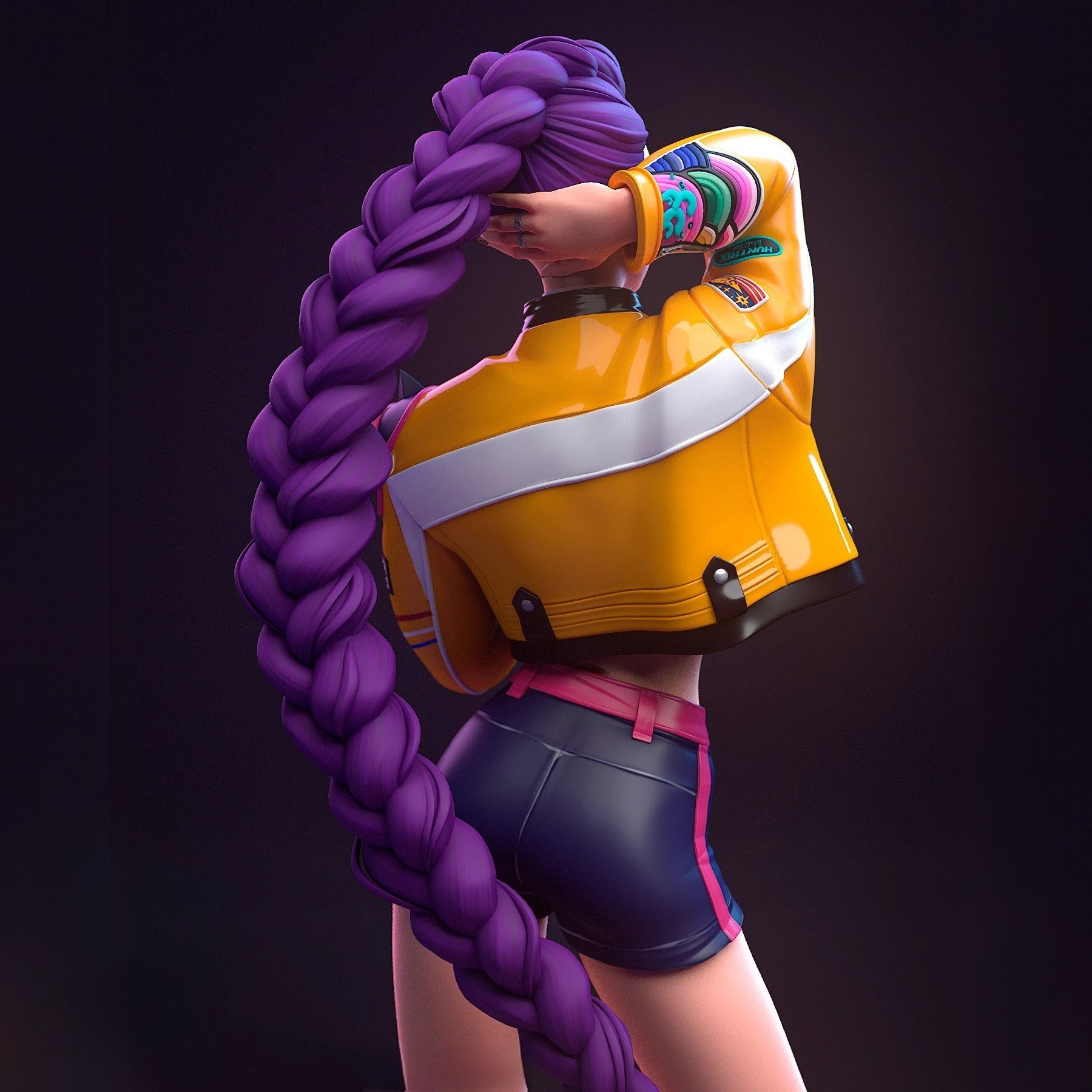 Костюм отражает сценический образ Huntr/x: насыщенные оттенки, металлические детали и тонкие узоры, добавляющие глубину образу. Прорисованы складки ткани, аксессуары и прическа — длинная фиолетовая коса развевается за фигурой, подчёркивая динамику и стиль. Лицо выражает решимость и внутреннюю силу, взгляд устремлён вперёд, создавая впечатление, что перед нами не просто айдол, а лидер, способный захватить внимание публики и вдохновить на новые свершения.