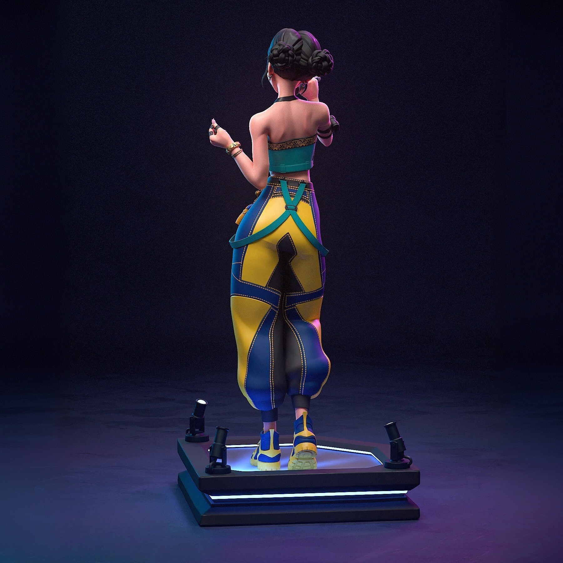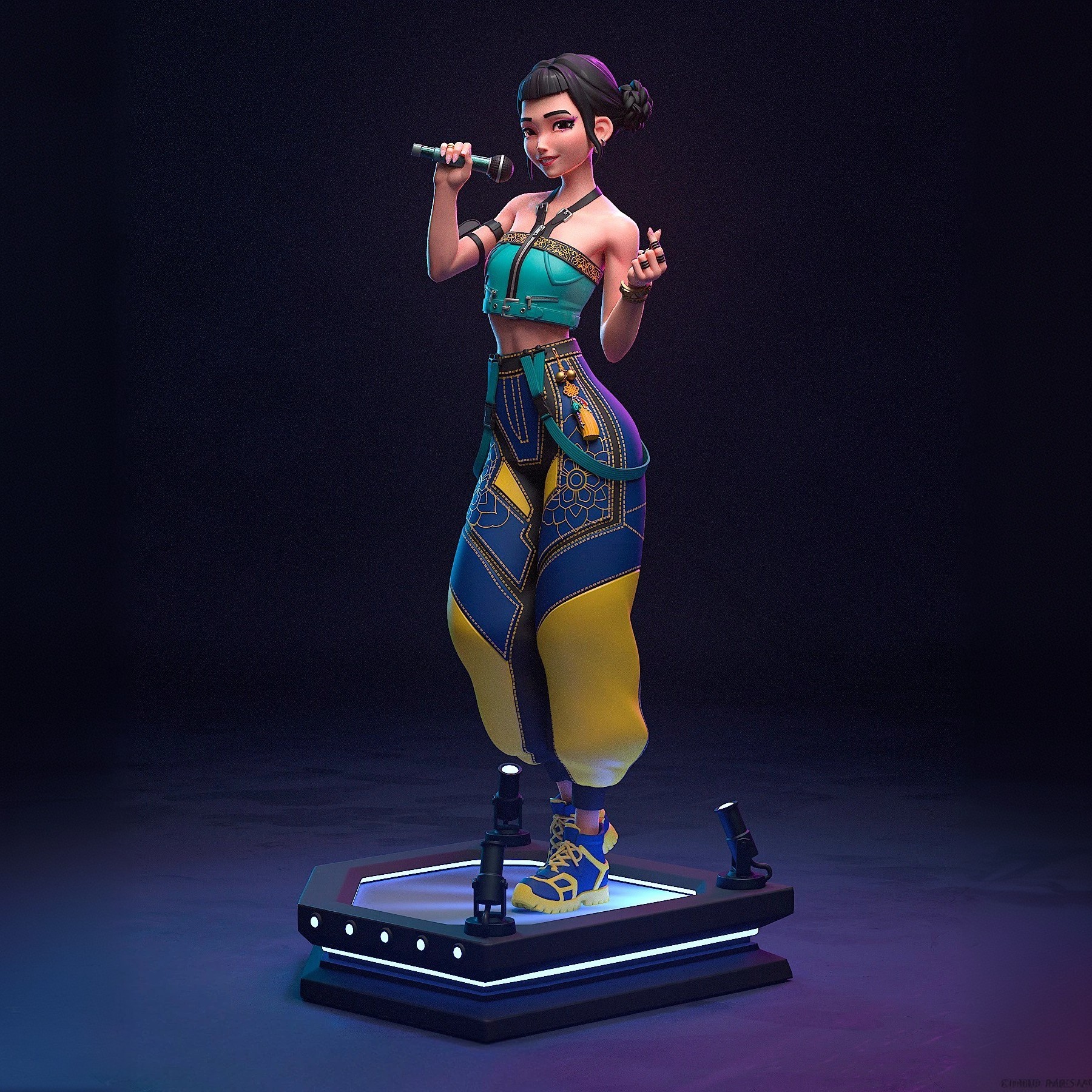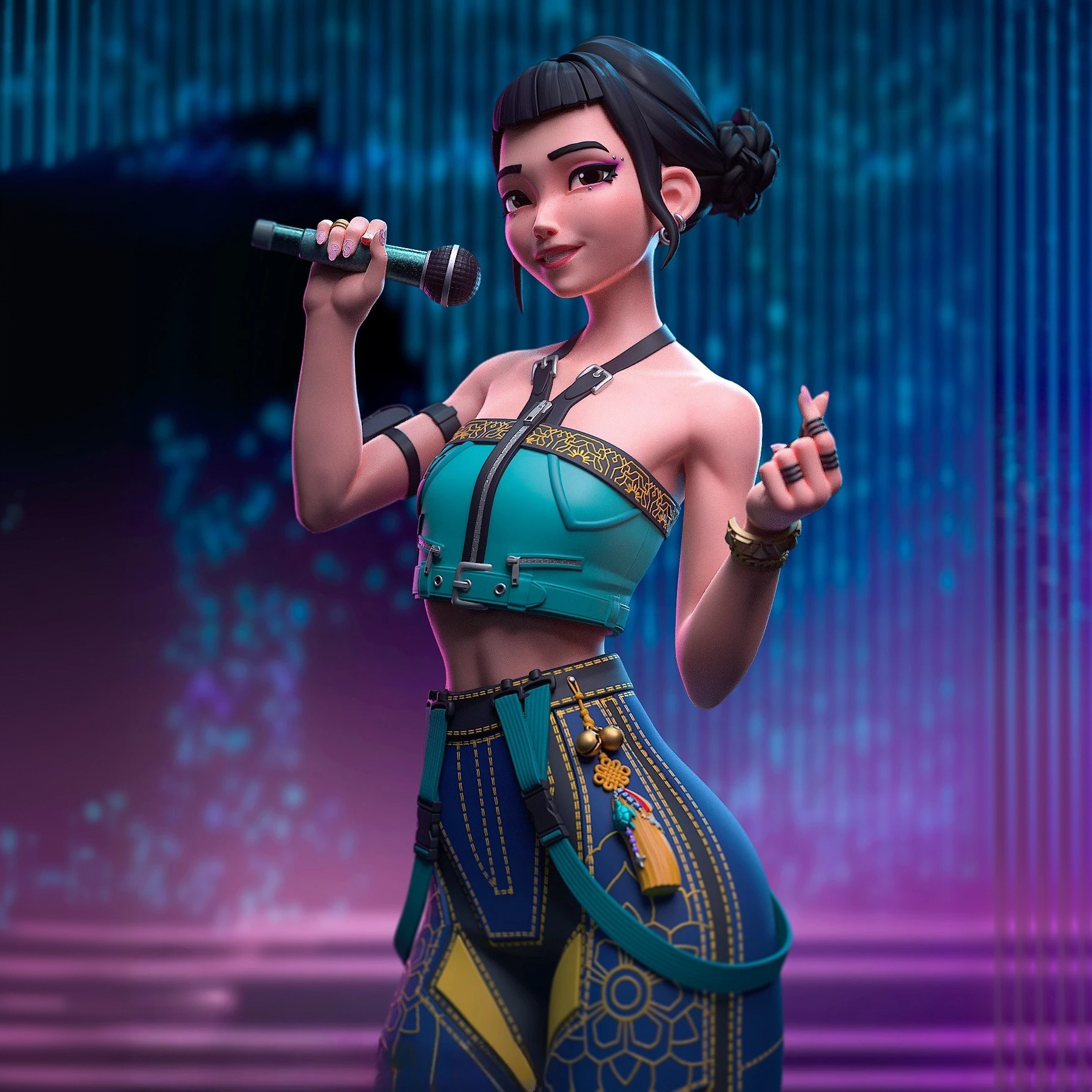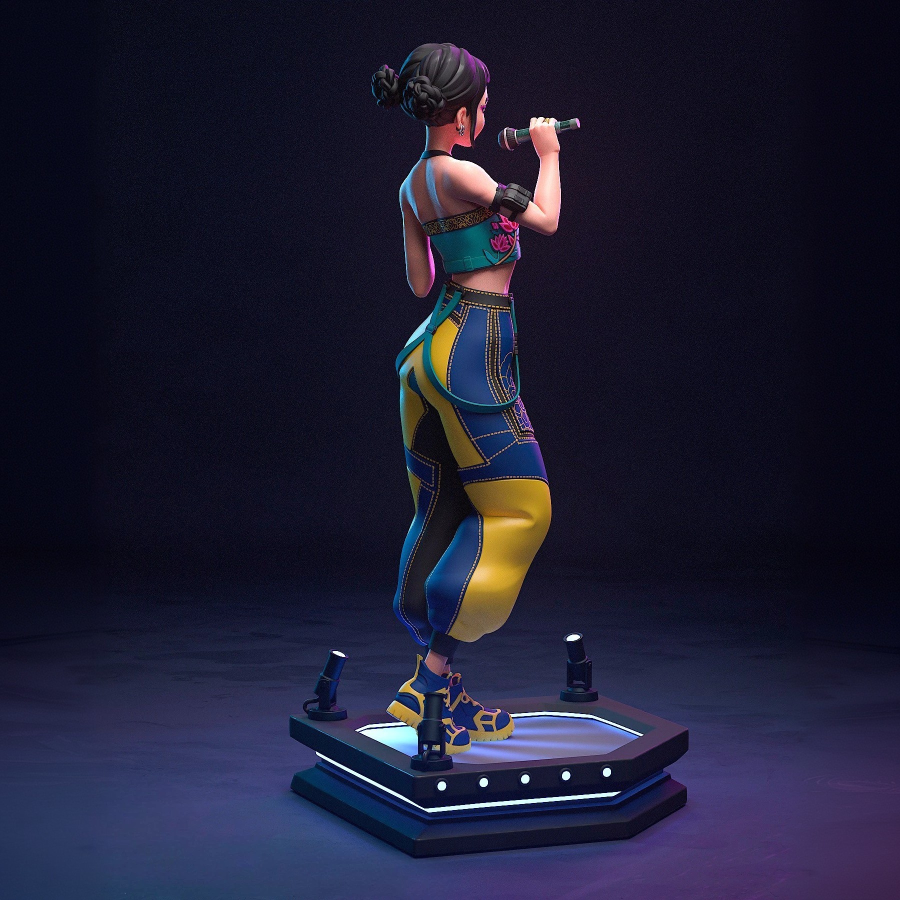 Фигура Zoey передаёт её динамичную энергию и сценическое обаяние. Она держит микрофон в руке, корпус слегка повернут, нога уверенно поставлена, создавая ощущение движения и готовности к следующему шагу. Костюм отражает её индивидуальность: уличный стиль хип‑хопа с неоновыми вставками, ремни и металлические украшения, элементы сценического образа Huntr/x подчёркивают её принадлежность к группе. Детали прорисованы тщательно: текстура ткани, складки костюма, аксессуары и пирсинг создают эффект живой сцены. Лицо передаёт сосредоточенность и внутренний огонь, взгляд направлен вперёд, выражая решимость и уверенность. Фигура демонстрирует контраст между яркостью публичного образа и скрытой силой охотницы на демонов, создавая впечатление глубины характера и динамики.