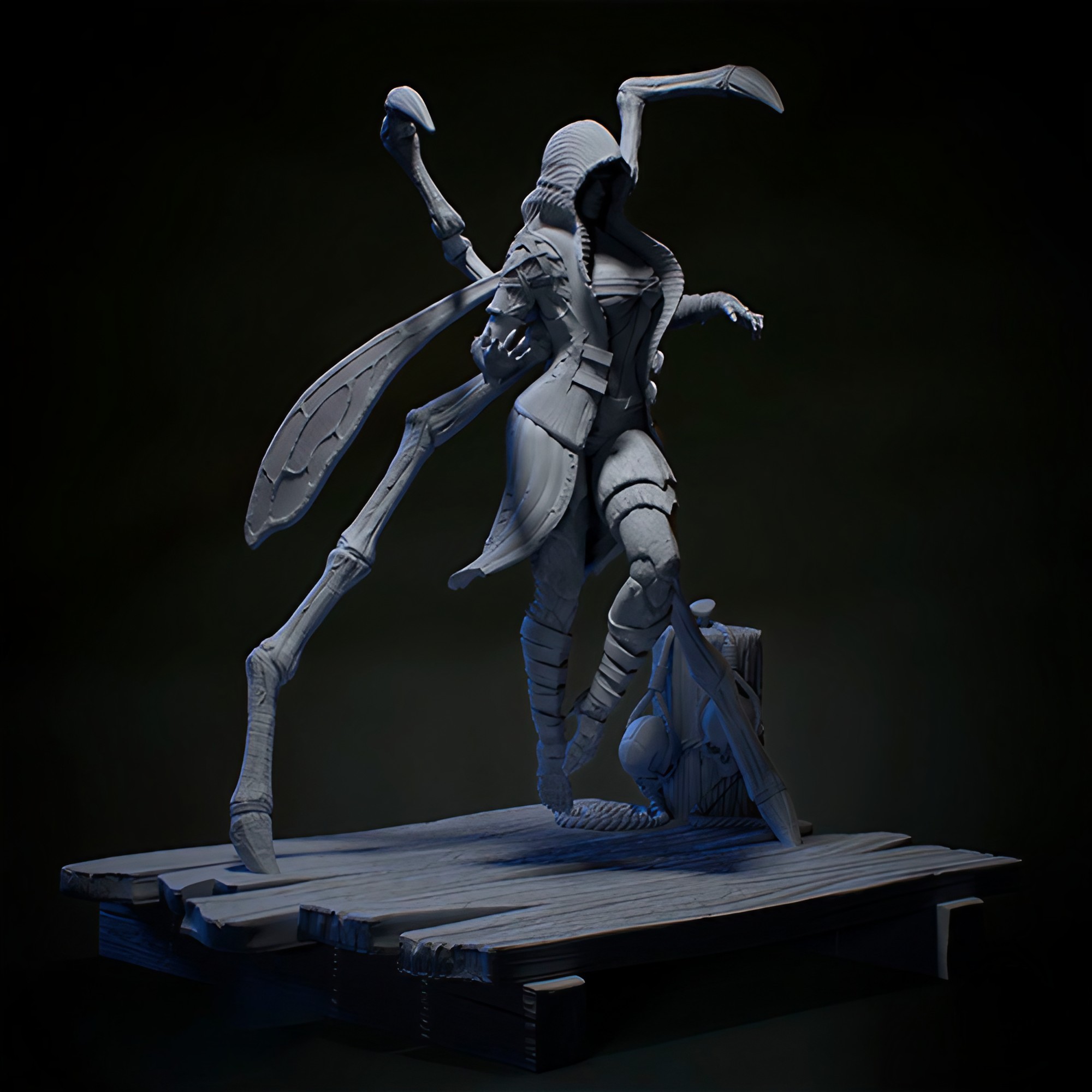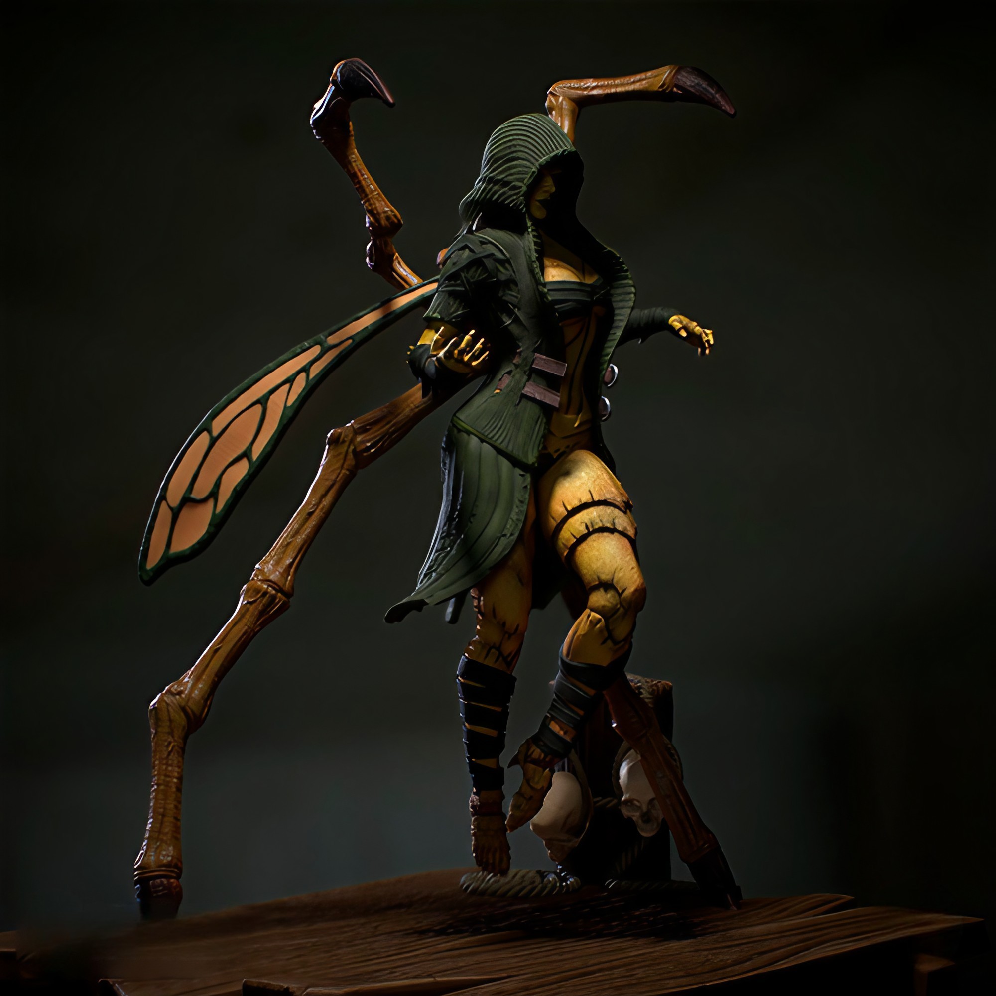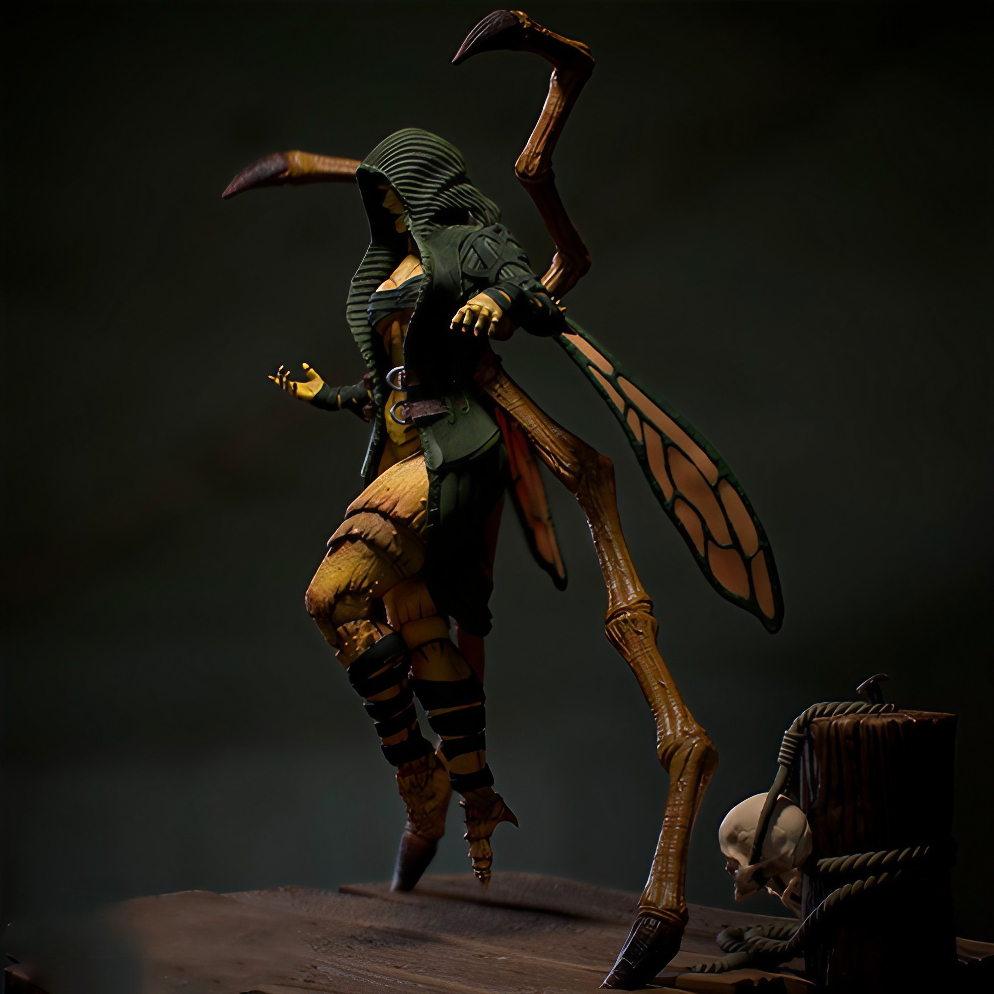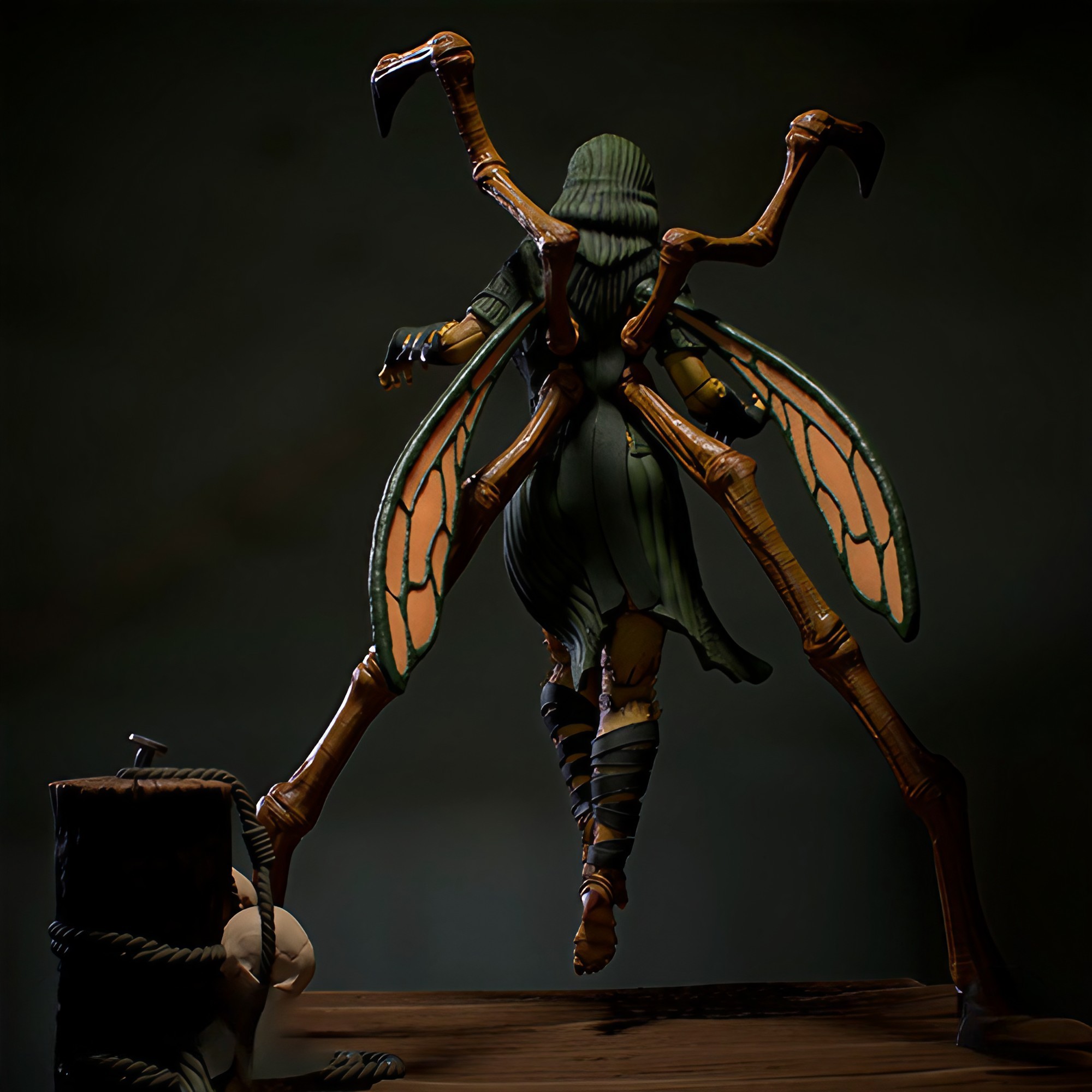 Фигура D’Vorah из Mortal Kombat передаёт её как опасно красивого хищника, сочетающего женственную элегантность с жестокой инстинктивностью насекомого‑убийцы. В её образе чувствуется тьма миросля Outworld и отстранённая, почти хладнокровная решимость того, кто привык выживать любыми средствами. Её поза напоминает движение большого хищного жука: лёгкий наклон корпуса, вытянутые руки с плавными, но смертоносными линиями, как будто в следующее мгновение она уже готова раскрыть скрытые придатки и выпустить ядовитый удар. Чёрный, облегающий костюм, полупрозрачные крылья‑плащи, металлические наплечники и шлем с оттенком насекомого подчёркивают её природу Kytinn — полупчелы, полу‑воительницы, для которой кровь и яд неотделимы от обычной реальности. В глазах D’Vorah светится лёгкая садистская уверенность, а шрамы и изгибы доспехов напоминают о том, что её кожа не просто красивая, а живая броня, приспособленная к насекомому стилю боя. В руках или вокруг тела могут быть видны тонкие, бьющие в воздухе усики‑щупальца, символ её тесной связи с целым роем, который всегда готов поддержать её в атаке или обороне. Эта фигура фиксирует D’Vorah в момент перед её смертоносным выпадом — когда она ещё не активировала свой полный набор ядов, крыльев и паутины, но уже ощущает запах слабости противника. В такой интерпретации она становится символом извращённой, инстинктивной силы: не просто жестокого солдата, а живого чудовища, которое превращает каждый поединок в выживание‑шедевр, где красота и ужас идут в руках по единому маршруту.
