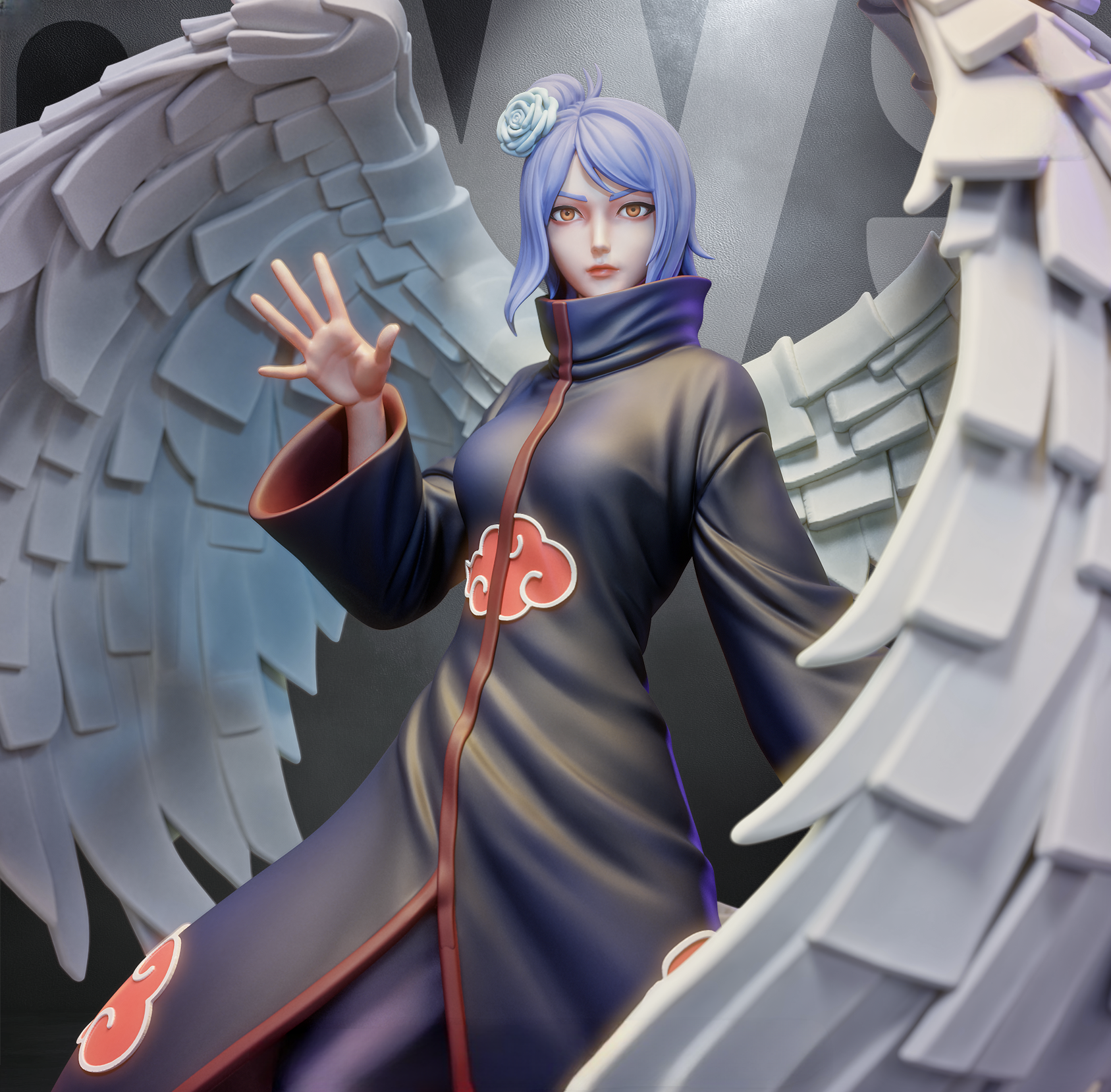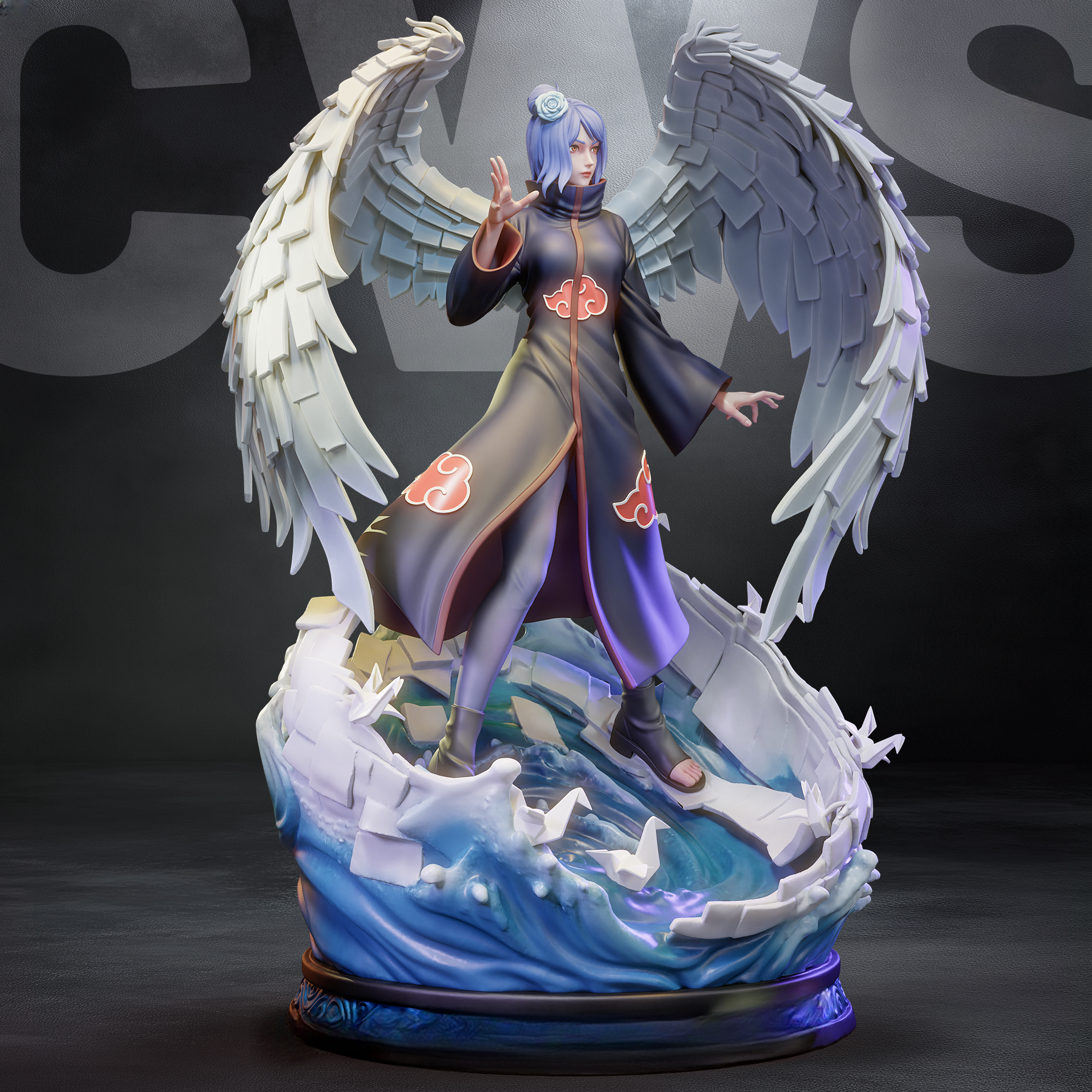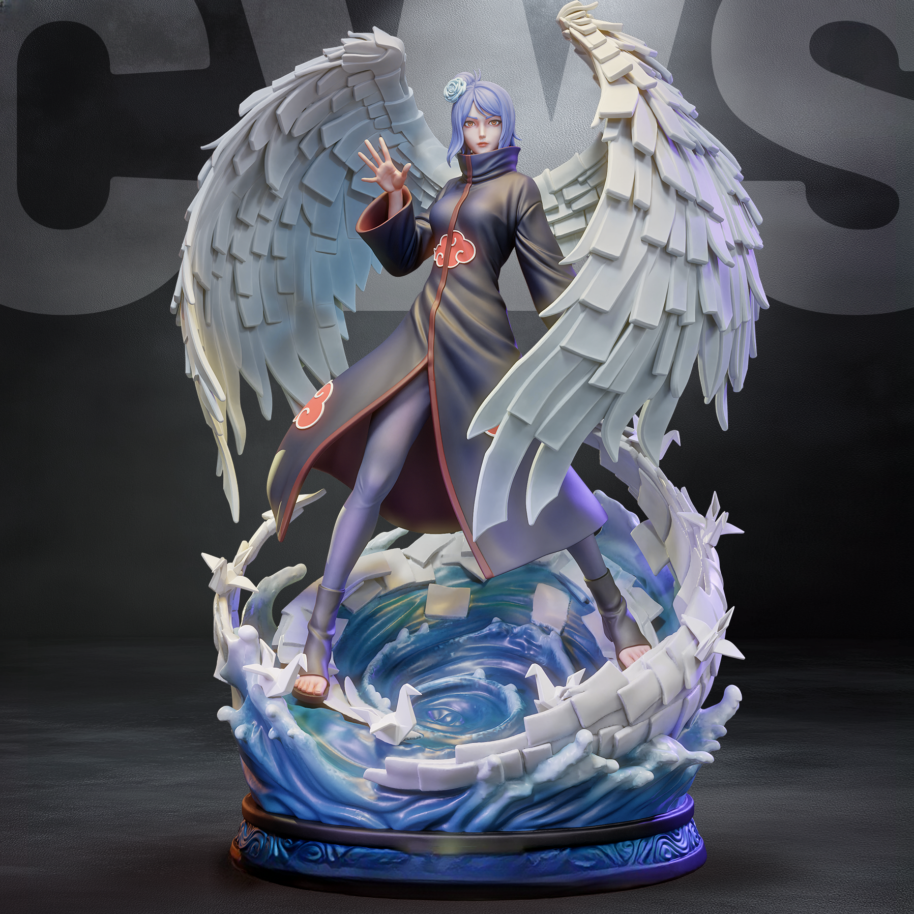 Фигура Конан из Naruto передаёт её как холодную, собранную и упрямую кунноичи, в которой чувствуется спокойная, но очень жёсткая воля. Внешне она выглядит как высокая женщина с короткими прямыми фиолетовыми волосами, аккуратными чертами лица и тёмными, пристальными глазами, как у человека, который привык мало говорить, но чётко действовать. В её выражении нет лишней эмоции, только лёгкая маска спокойствия, за которой скрывается тяжёлая история войны и потерь. В фигурке подчёркнут её бумажная эстетика и статус шиноби S‑ранга: в руках и вокруг неё будто слои тонкой бумаги, сложенные в диски, лезвия, щиты и крылья, как будто вся её сила вытекает из тонких листов, которые легко носить, но очень опасно игнорировать. На ней чёрный плащ Акацуки с красными облаками, а под ним плотная, но без излишеств верхняя одежда, как у куноичи, которая не прячется за красотой, а полагается на технику, контроль чакры и своё представление о справедливости. Эта фигура фиксирует Конан в момент, когда она не только одна из основателей Акацуки и напарник Нагато, но и лидера Амегакуре, готовая сражаться до конца за свои идеалы и память о тех, кого потеряла. В таком образе она остаётся тихой, но опасной героиней, опирающейся на бумажное ниндзюцу, собственную мораль и абсолютную верность своим целям, а не на громкие слова или эмоциональную театральность.