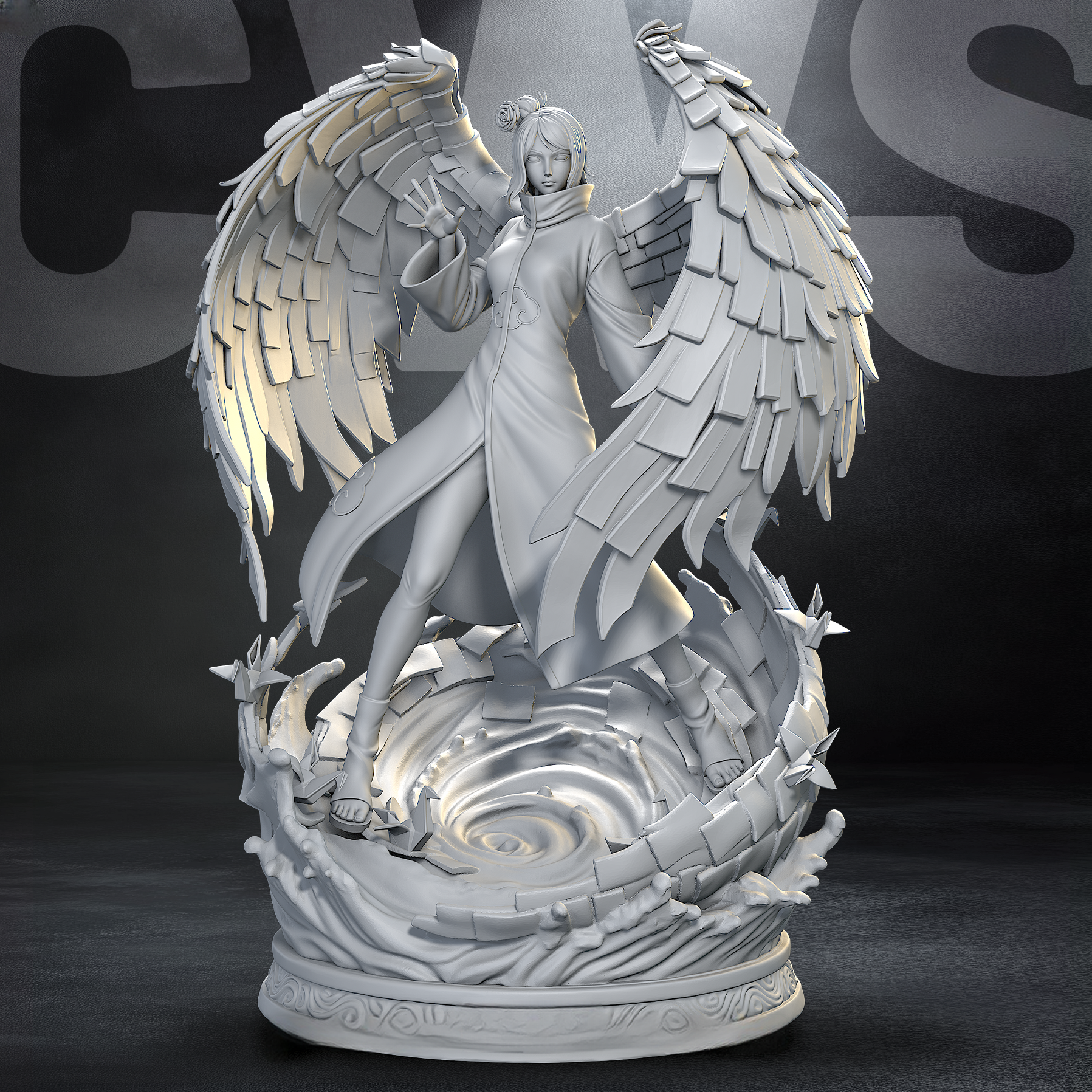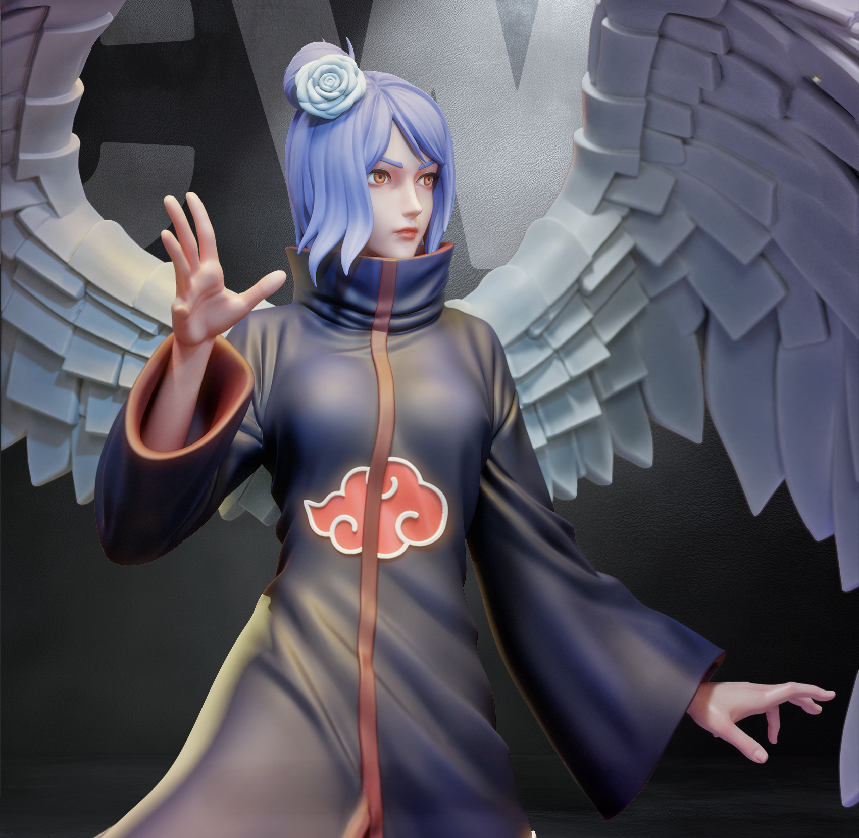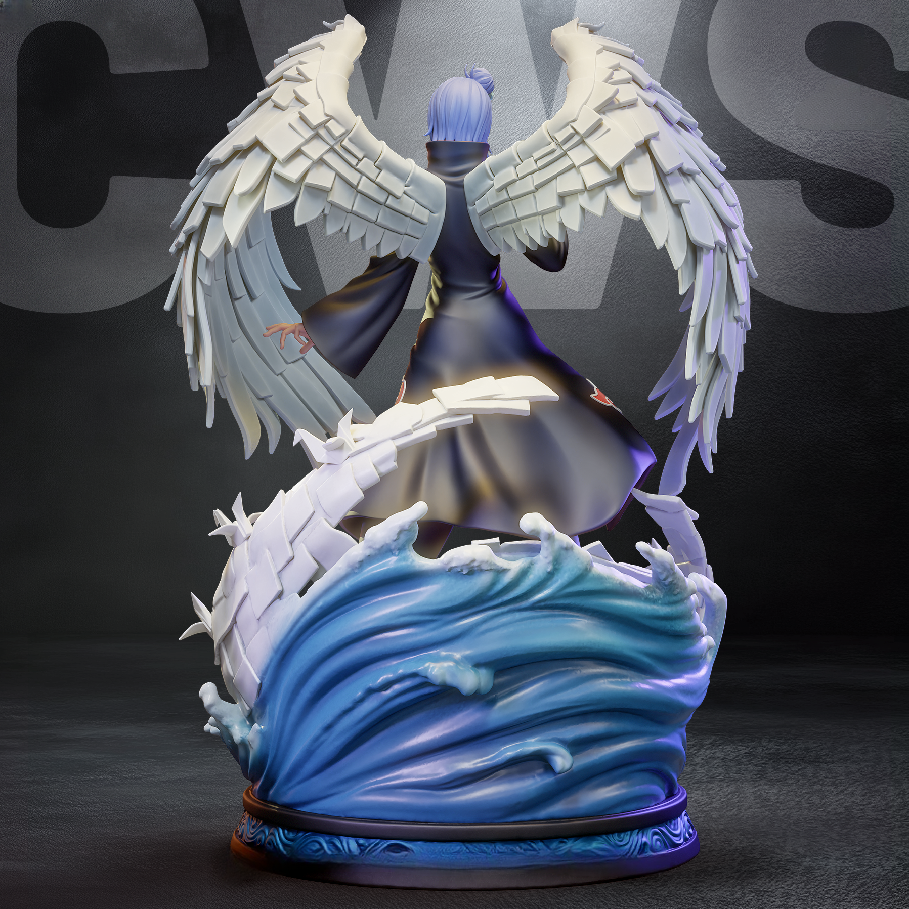 Фигура Конан из Naruto передаёт её как холодную, собранную и упрямую кунноичи, в которой чувствуется спокойная, но очень жёсткая воля. Внешне она выглядит как высокая женщина с короткими прямыми фиолетовыми волосами, аккуратными чертами лица и тёмными, пристальными глазами, как у человека, который привык мало говорить, но чётко действовать. В её выражении нет лишней эмоции, только лёгкая маска спокойствия, за которой скрывается тяжёлая история войны и потерь. В фигурке подчёркнут её бумажная эстетика и статус шиноби S‑ранга: в руках и вокруг неё будто слои тонкой бумаги, сложенные в диски, лезвия, щиты и крылья, как будто вся её сила вытекает из тонких листов, которые легко носить, но очень опасно игнорировать. На ней чёрный плащ Акацуки с красными облаками, а под ним плотная, но без излишеств верхняя одежда, как у куноичи, которая не прячется за красотой, а полагается на технику, контроль чакры и своё представление о справедливости. Эта фигура фиксирует Конан в момент, когда она не только одна из основателей Акацуки и напарник Нагато, но и лидера Амегакуре, готовая сражаться до конца за свои идеалы и память о тех, кого потеряла. В таком образе она остаётся тихой, но опасной героиней, опирающейся на бумажное ниндзюцу, собственную мораль и абсолютную верность своим целям, а не на громкие слова или эмоциональную театральность.