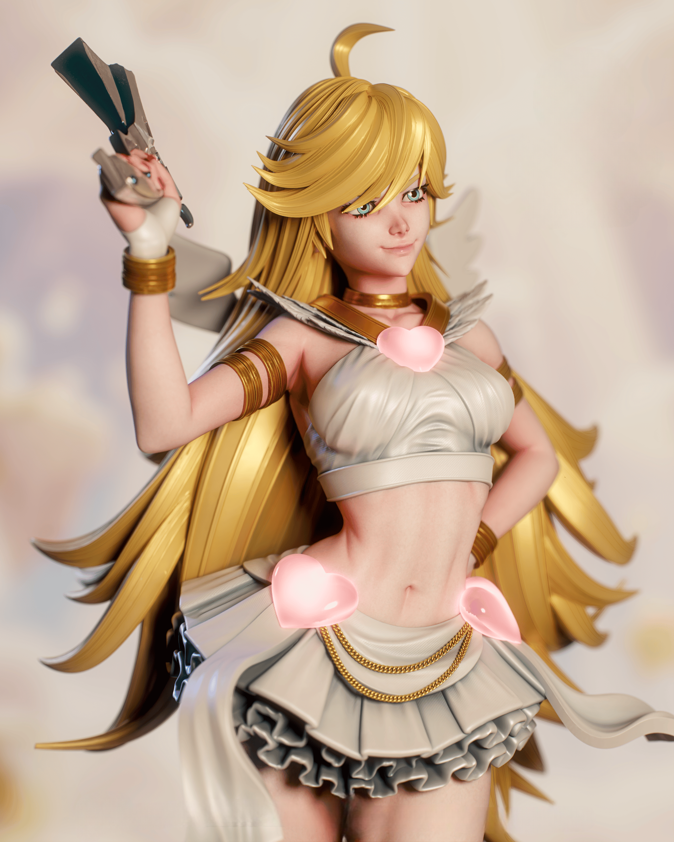 Фигура Panty из Panty & Stocking with Garterbelt передаёт её дерзкий и эпатажный характер, где каждая деталь отражает её свободолюбие и уверенность. В образе нет чрезмерной театральности — фигура живёт энергией самой Panty, словно она только что сошла с экрана и готова вступить в любое приключение. Костюм выполнен с акцентом на контрастные цвета и текстуры: ярко-жёлтая юбка и чёрный верх создают эффектный визуальный ритм, а детали аксессуаров и обуви подчёркивают её неформальный стиль. Динамика позы ощущается через лёгкий разворот корпуса и естественное распределение элементов, передавая чувство непринуждённости и экспрессии. Лицо Panty выражает смелость и озорство: взгляд прямой, губы образуют лёгкую насмешку, словно она знает больше, чем готова раскрыть. Фигурка фиксирует не просто персонажа, а момент, когда Panty воплощает свой характер — свободолюбивый, уверенный и яркий, что делает её образ живым и притягательным для любой коллекции.