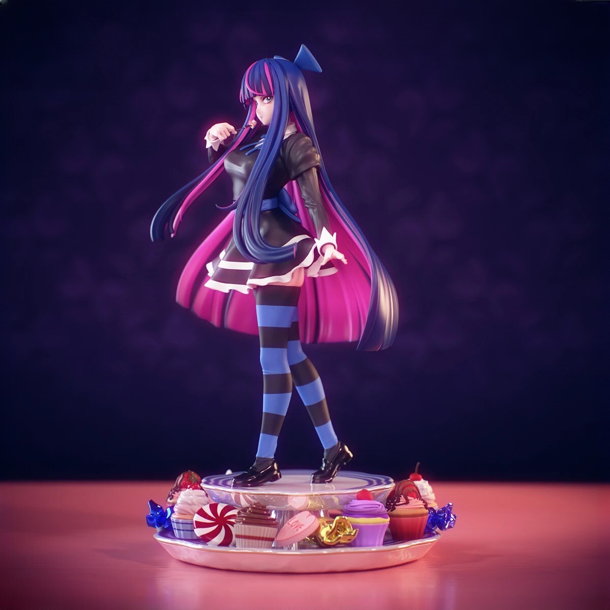 Фигура Stocking из Panty & Stocking with Garterbelt передаёт её фирменное спокойствие с оттенком высокомерия. Линии платья вылиты чётко, с акцентом на контраст тёмных тонов и полупрозрачных элементов, а плавные переходы цвета на волосах передают характерный градиент без утраты объёма. Взгляд направлен слегка сверху вниз — спокойный, но с холодным недовольством, словно её отвлекли от чего-то действительно важного. Поза выдержана без излишней театральности, но в ней ощущается уверенность и самоконтроль, подчёркивающие её утончённый, почти надменный характер. Такое исполнение делает акцент не на агрессии, а на внутреннем отстранённом превосходстве Stocking, которое мгновенно считывается даже без контекста сериала.