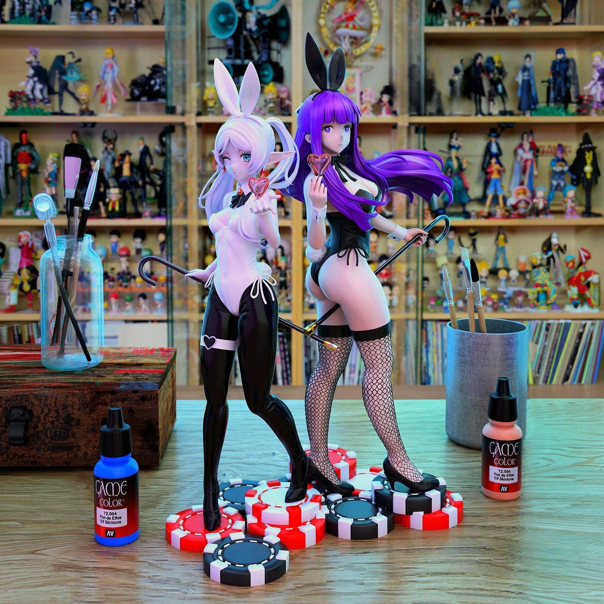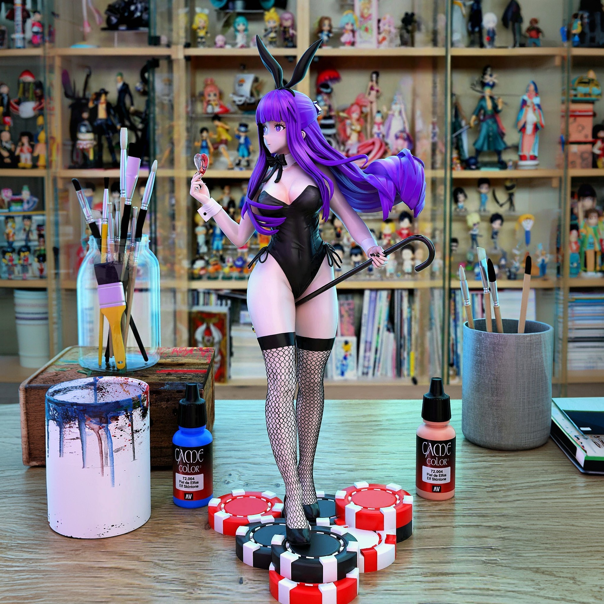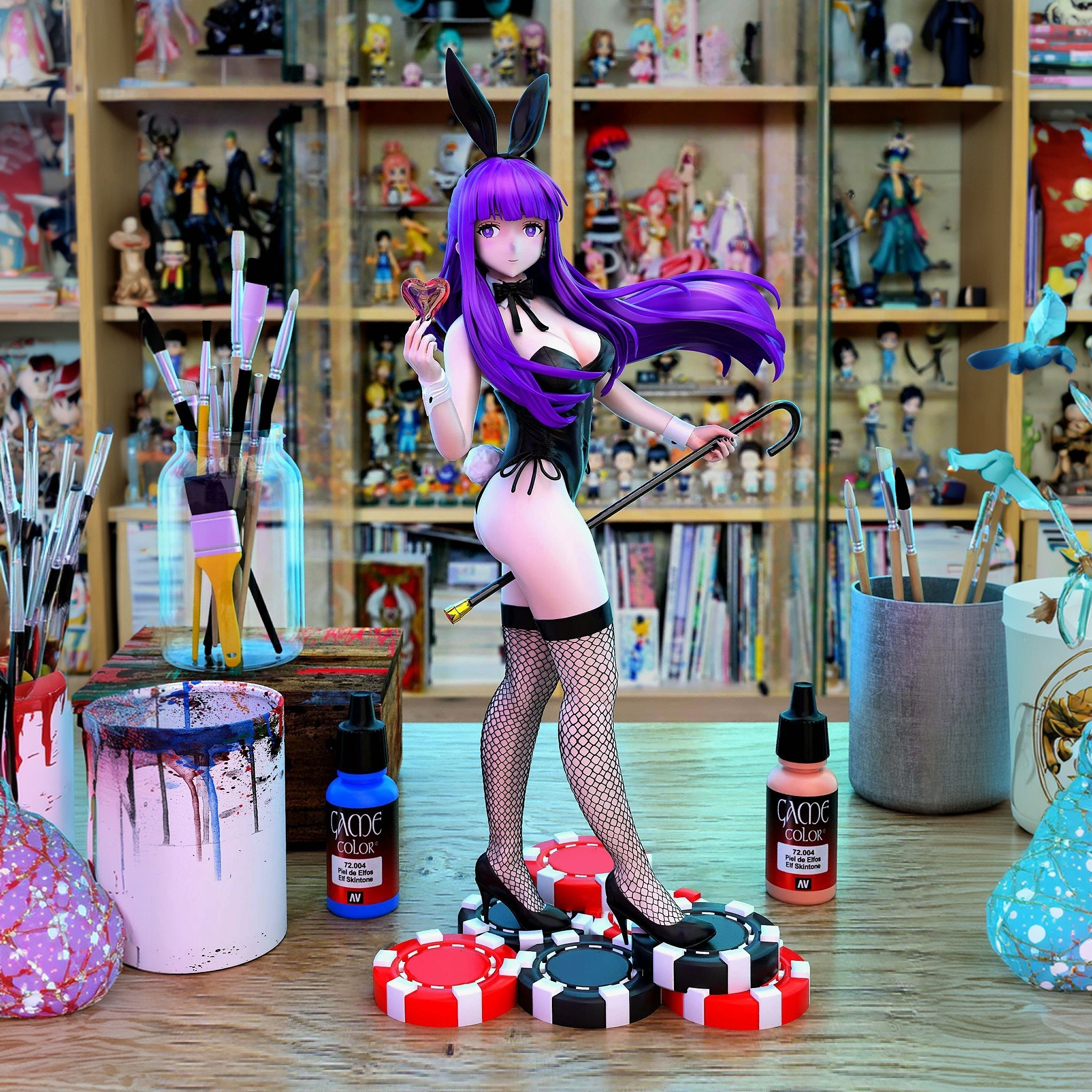Фигура Fern в образе зайчика переосмысливает её привычную сдержанность, сохраняя при этом внутренний характер героини. В этом варианте нет откровенной игривости — образ построен на контрасте внешней мягкости и спокойной, почти отстранённой натуры. Поза уравновешенная и уверенная, без демонстративных жестов, словно Fern просто принимает новый облик, не придавая ему особого значения. Костюм зайчика выполнен аккуратно и лаконично: чистые линии, плотная посадка, минимум декоративных элементов. Материалы выглядят гладкими и аккуратными, подчёркивая фигуру, но не превращая образ в фансервис. Детали — ушки, чулки, аксессуары — вписаны сдержанно и не отвлекают от общего силуэта, создавая ощущение продуманного, цельного дизайна. Выражение лица остаётся спокойным и немного отрешённым: мягкий взгляд, нейтральная мимика, отсутствие кокетства. Эта фигурка передаёт Fern не как шутливый образ, а как тихое и неожиданно элегантное воплощение её характера — сдержанного, сосредоточенного и внутренне устойчивого, даже в необычной интерпретации.