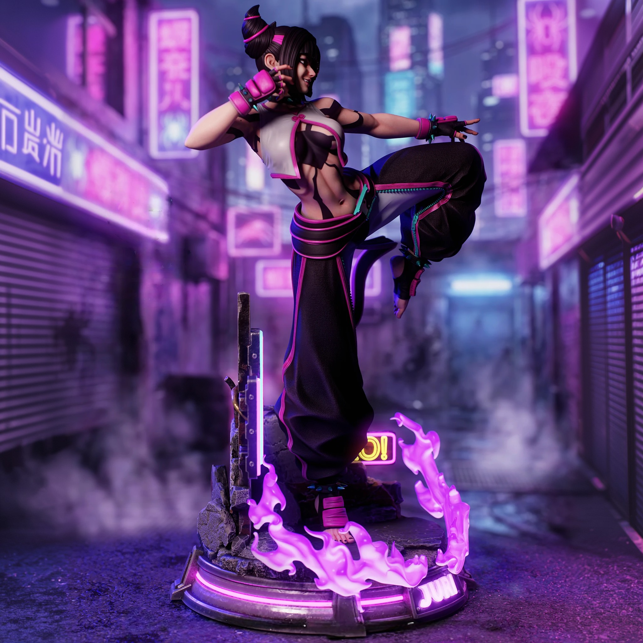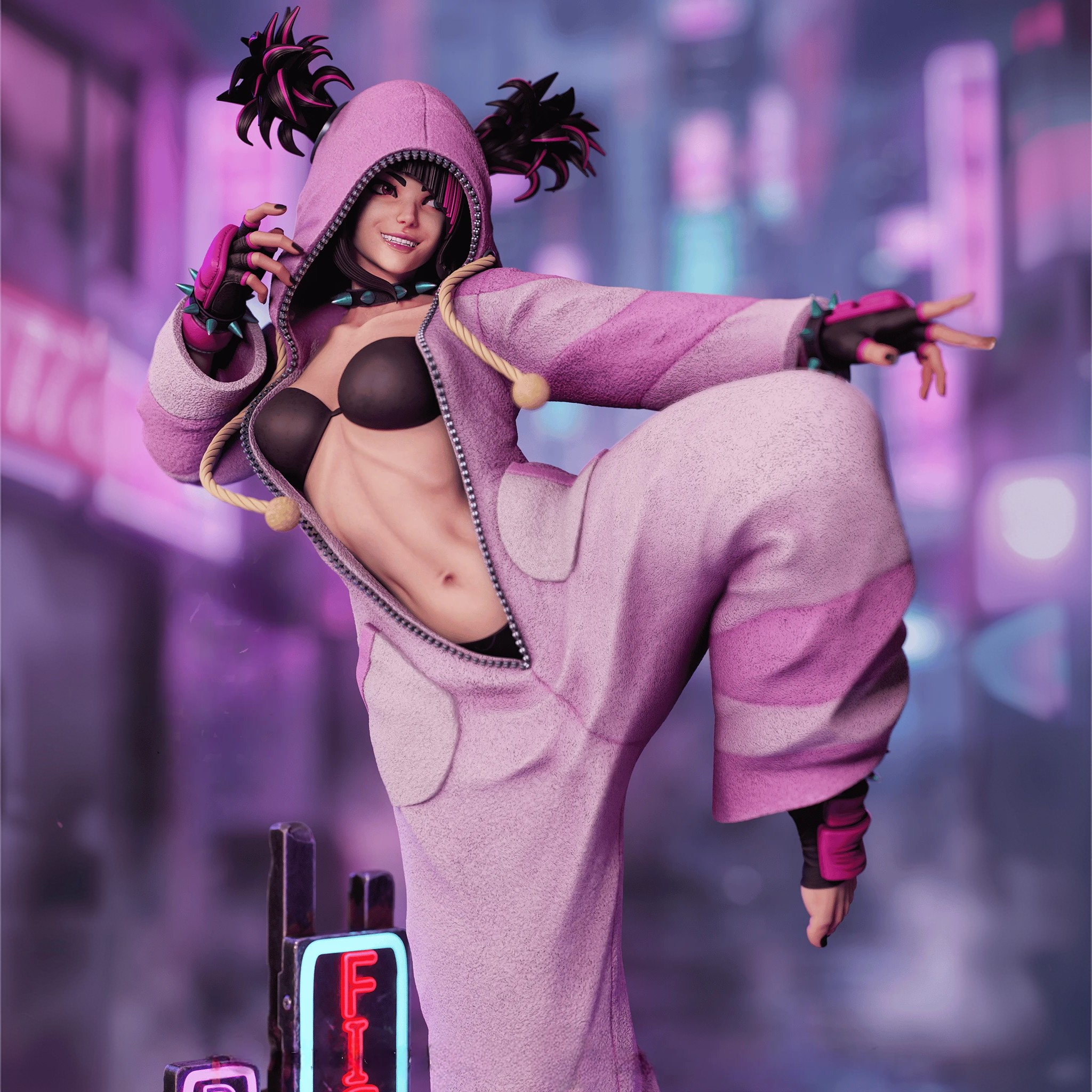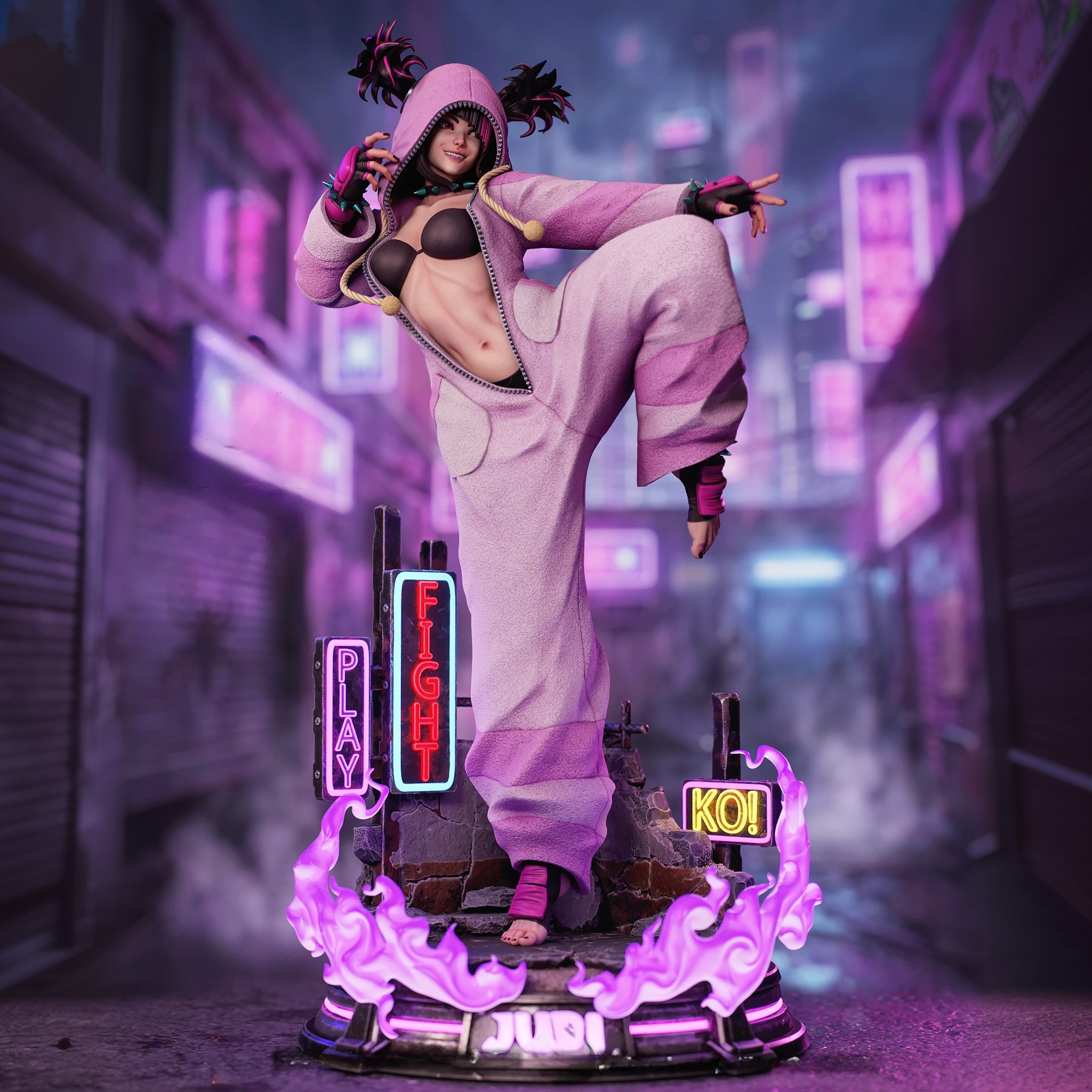 Фигура Juri Han из Street Fighter передаёт её как дерзкую и опасно уверенного бойца, чья самоуверенность распространяется от взглядов до каждого шага. В её образе чувствуется идеальное сочетание точного тхэквондо, холодного садизма и насыщенной, почти сценической харизмы, за счёт чего она выглядит не как просто солдат, а как настоящая королева ринга, которая играет с противником, прежде чем разгромить его ногой. Визуальные элементы — фиолетово‑чёрный костюм, «паучьи» узоры, угловатая причёска, напоминающая рога, и фирменная повязка‑окуляр с Feng Shui Engine на левом глазе — сразу указывают на её роль как Таеквондистки, превратившей боль и манипуляции в источник силы. В фигурке акцент сделан на длинных, выразительных ногах и напряжённой, готовой к рывку позе, как будто в следующее мгновение она уже врывается в атаку Shikusen или вырубает врага очередным смертоносным ударом. Эта фигурка запечатлевает Juri в момент перед прыжком или заряженным ударом — когда она ещё не перешла в атаку, но уже улыбается, понимая, что соперник уже в её ловушке. В такой интерпретации она становится символом агрессивной, хищной уверенности — не кричащей и не показной, а той, которая наносит удары, пока все остальные пытаются понять, как она успела всё это устроить.