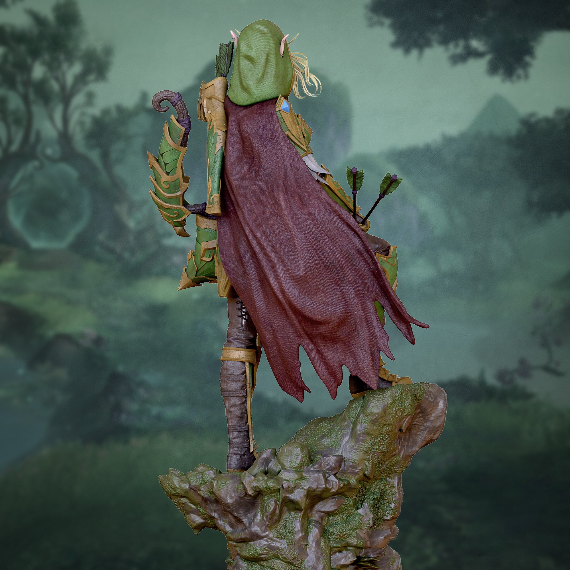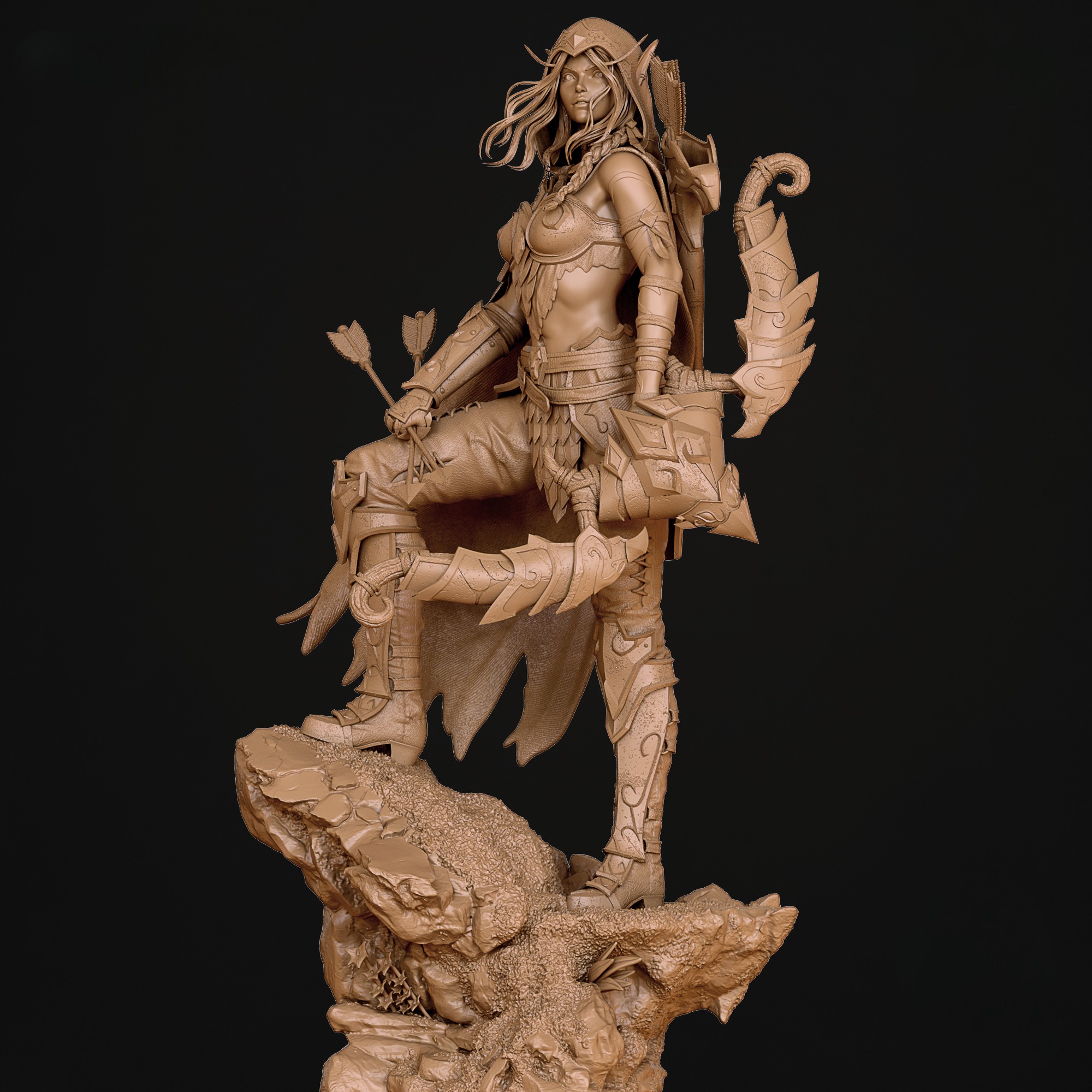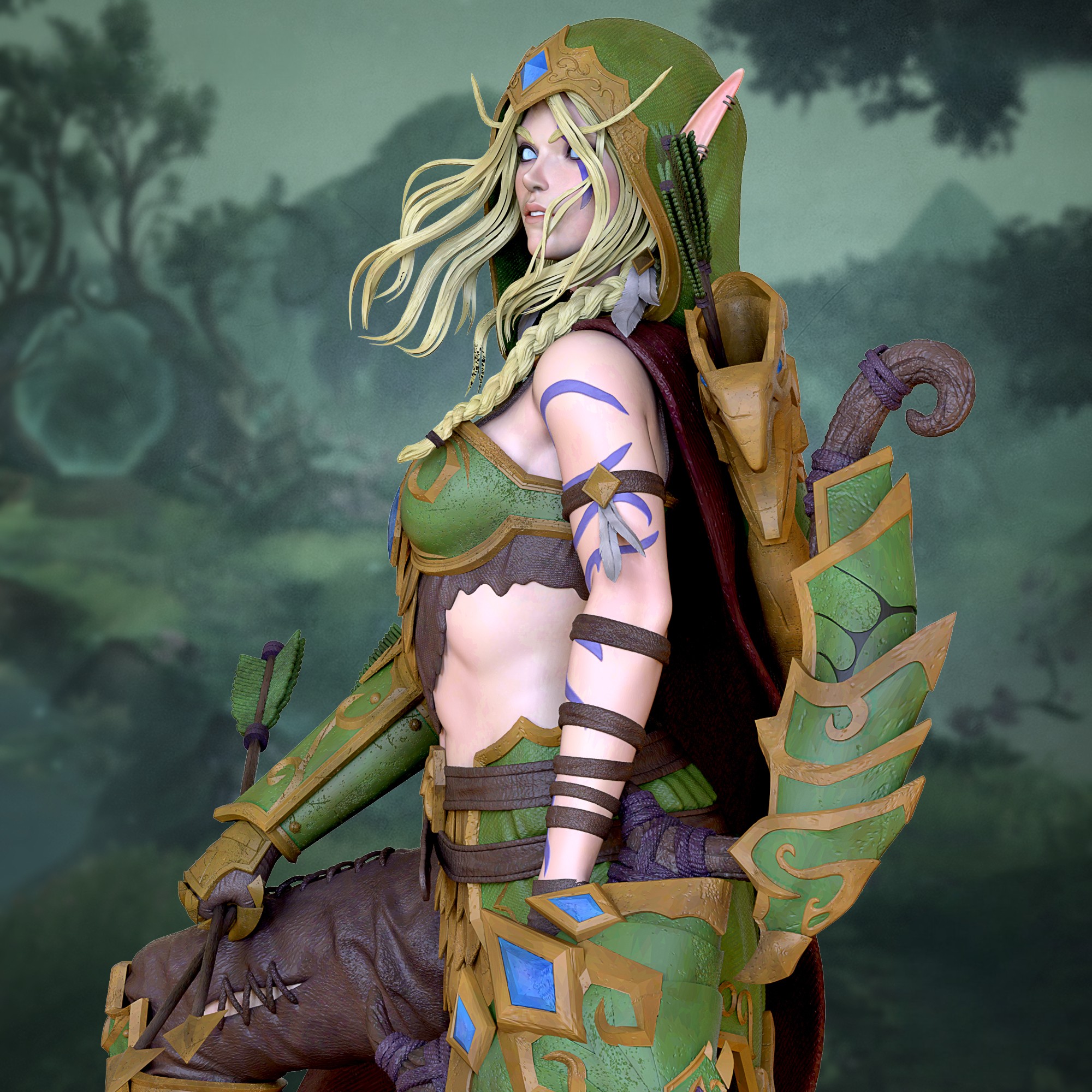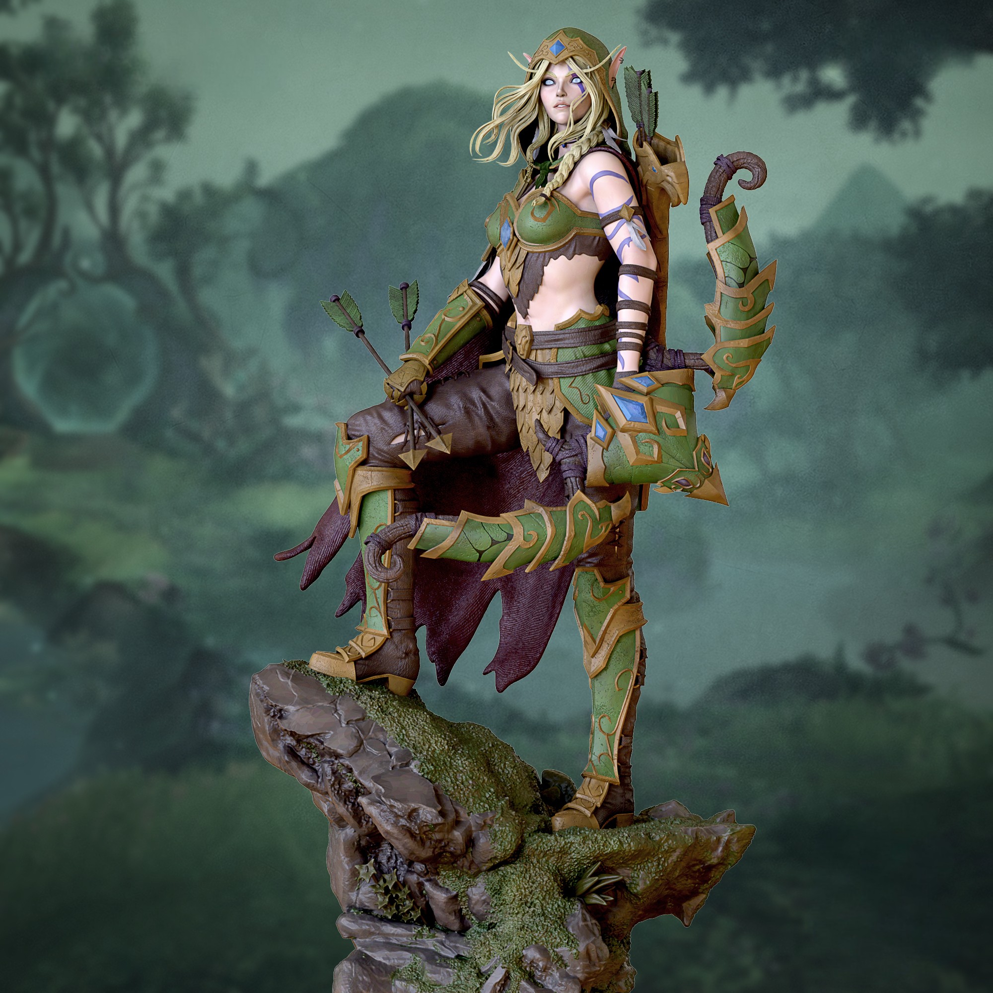 Фигура Alleria Windrunner из World of Warcraft передаёт её как легендарный образец эльфийского воина, соединившего высокую честь лучницы с опасной, но контролируемой властью Тьмы. В её образе чувствуется эльфийская элегантность, напряжённая решимость и холодная, почти воинственная строгость человека, который прошёл сквозь войны, потери и вселенские конфликты, не потеряв ни капли индивидуальности. В фигурке подчёркнуты её фирменные черты: длинные светлые волосы, обычно собранные, гордая осанка, цепкий взгляд, в котором смешаны благородство и тихая готовность к бою. На ней доспехи, сочетающие классические элементы High Elf‑разведчика с новыми деталями, напоминающими о её связи с Void — лёгкие тени, полупрозрачные узоры, тёмные акценты, словно Вечное тёмное пространство лежит в одном дыхании от её сознания, но она держит его в узде, а не допускает к себе. В её руках будто уже ощущается сила лука, знакомой воинской доблести Windrunner, но и ткань телепортационных порталов, которые она открыла, чтобы вести войска в глубины космоса и обратно. Эта фигура фиксирует Alleria в момент между двумя мирами — когда она не только ranger, защитница Azeroth, но и пересечённая Void Walker, умеющая использовать Тьму, не поддаваясь ей. В такой интерпретации она становится символом баланса: того, кто готов идти до самых далёких пределов, нести чужую тьму, чтобы уберечь тех, кого любит, и защищать мир, который слишком часто забывает о той цене, которую платят его герои.